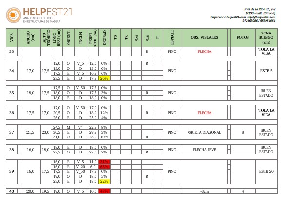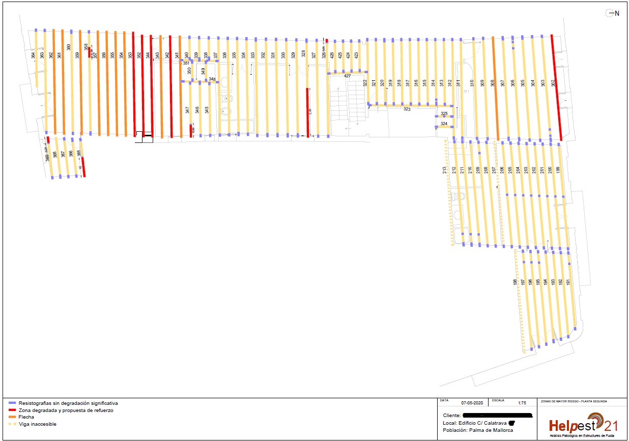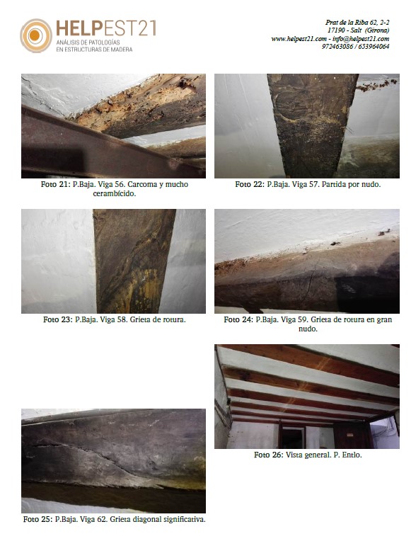 Análisis patológico completo realizado en el edificio en la C/ Calatrava de Palma de Mallorca. Estructura con vigas de madera de tipologías constructivas muy variadas, reparaciones diversas realizadas durante los últimos 100 años. Las especies que componían las vigas eran pino silvestre i pino larício. Con gran diversidad de secciones de viga y densidades de madera, oscilando éstas entre los 421 y los 762 Kg/m3. Tota esta diversidad se debe a la gran cantidad de etapas constructivas, sin un criterio global de edificio. El Edificio consta de planta baja más cuatro, con un total de 425 vigas analizadas mediante análisis resistográfico. De éstas se propuso a la D.F. la substitución funcional de 74 elementos (17% del total), y 43 (10%) para refuerzos localizados, especialmente en las testas. La planta baja fue la que presentó mayor degradación en sección (31% de los elementos). Se detectaron restos del ataque de la termita subterránea en las plantas primera, tercera y cuarta, y siempre en la mitad sur del edificio. Ser recomendó un tratamiento mediante IGRs.. Carcomas y cerambícidos (carcoma grande) en todo el edificio, pero sin afectaciones graves a la sección. También pudriciones puntuales. Se recomendó un tratamiento químico según profundidades NP2 y NP5. La clase resistente, estimada mediante la tècnica de ultrasonidos, fue muy elevada en todas las plantas, con más variabilidad en la planta baja. La clase resistente media del edificio fue una C27. Por lo que era evidente que la madera de base era muy resistente, o por lo tanto, susceptible de reparación. Valía mucho la pena mantener la estructura.
