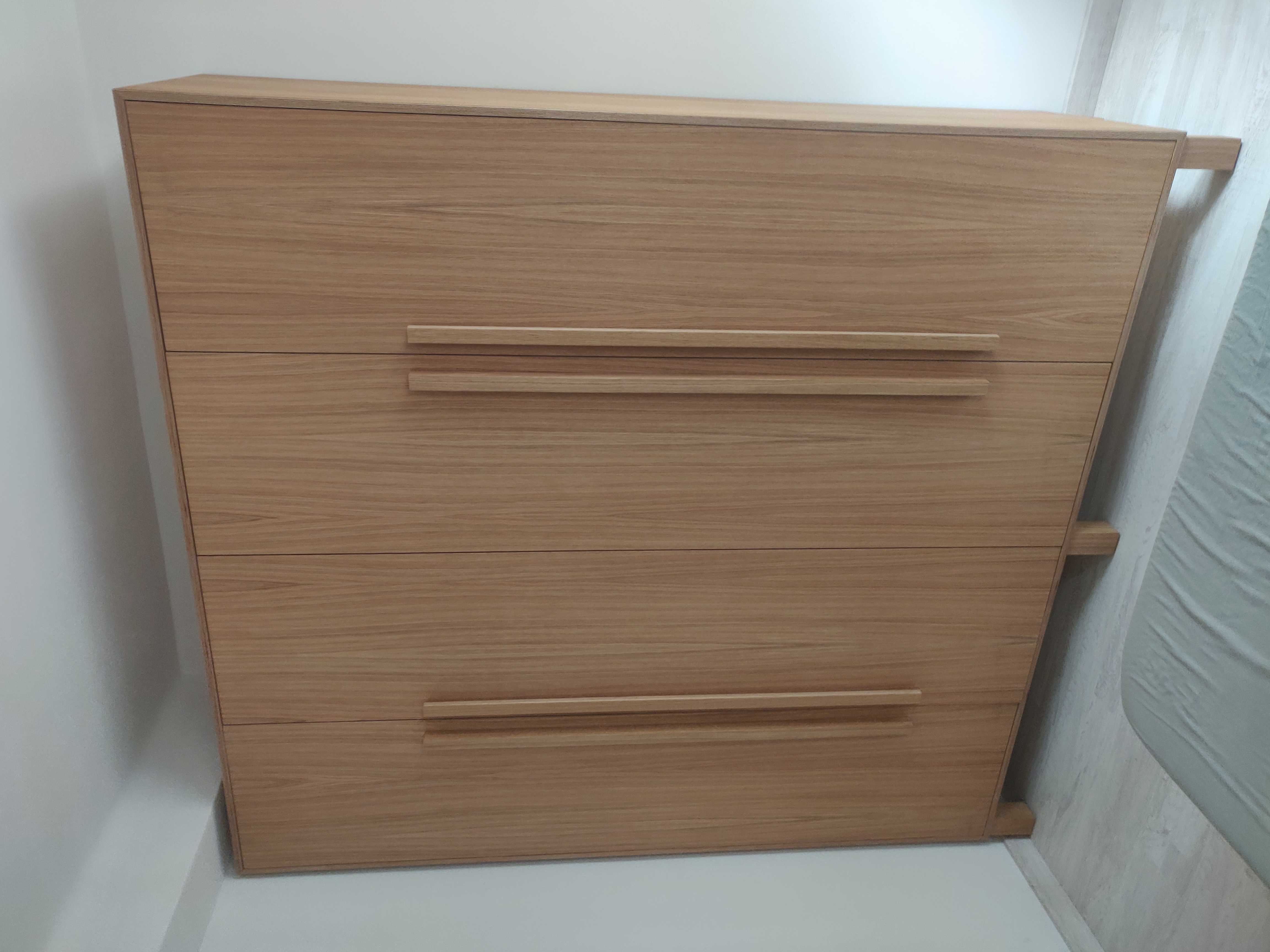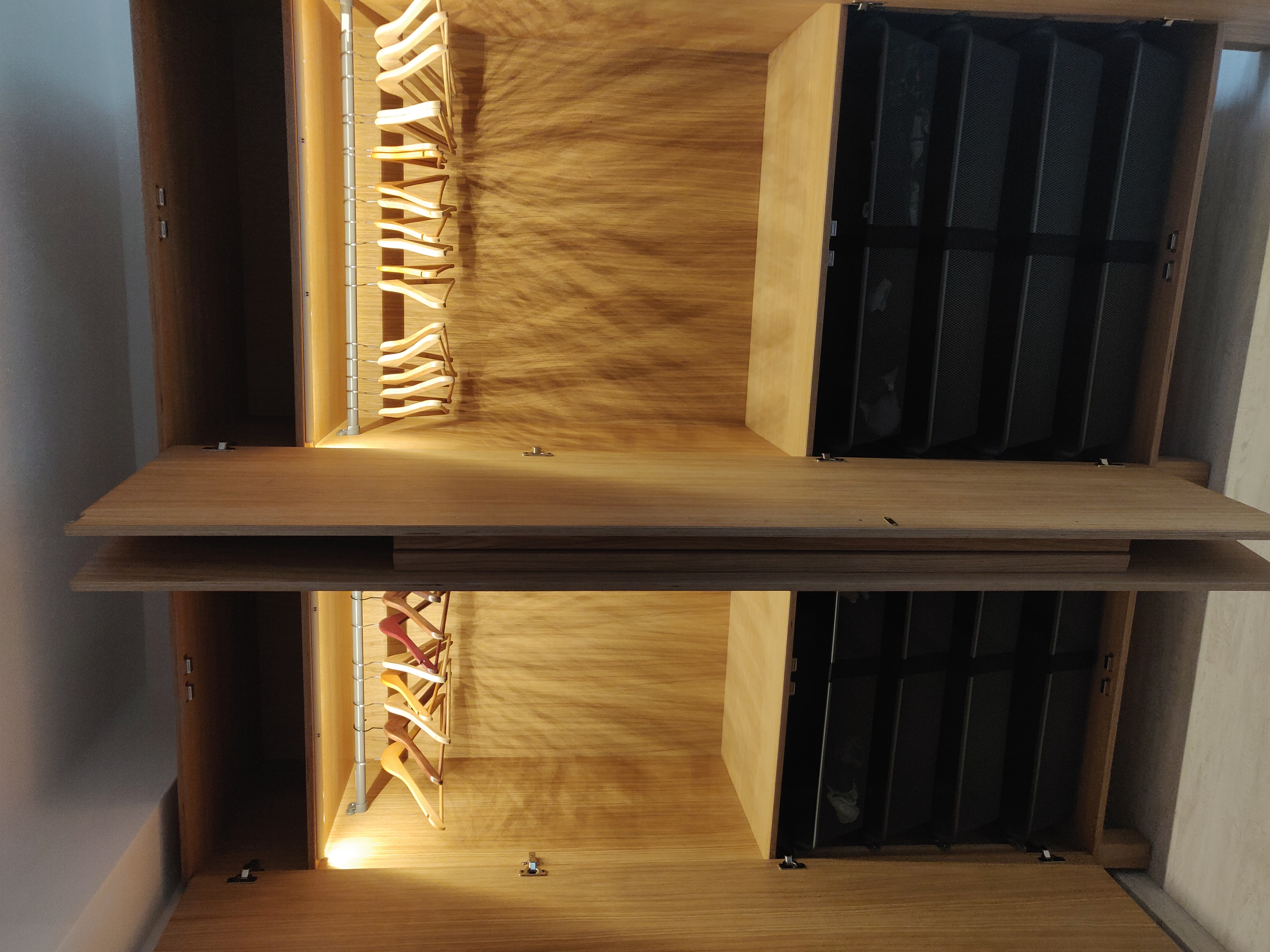 Armario en abedul rechapado en roble, iluminación y cestos suecos.