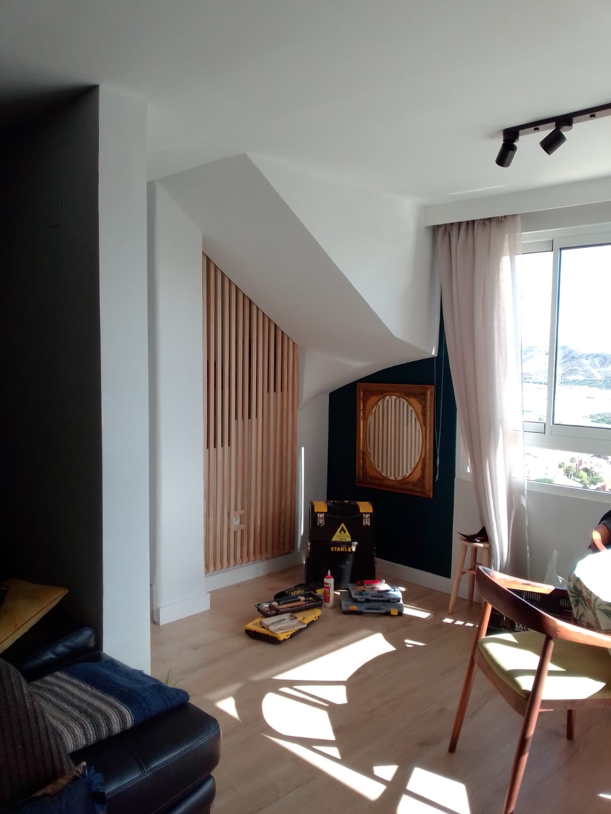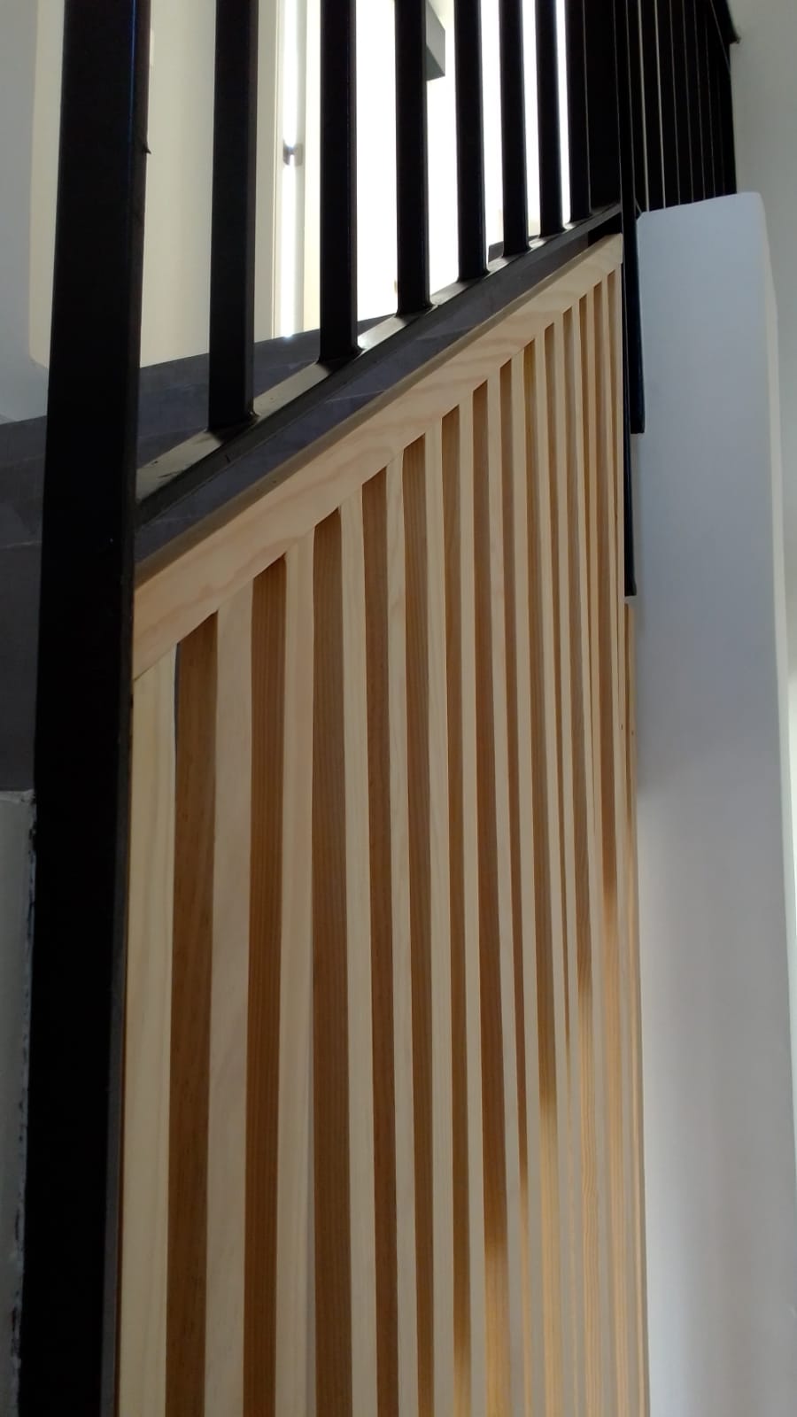 Balaustrada de listones verticales, realizada en abeto. Se ha generado una división de espacios ligera y que aporta calidez al salón. Excelente idea de Ángel y Juan, a quienes agradezco haber confiado en mi para llevar adelante el proyecto.
