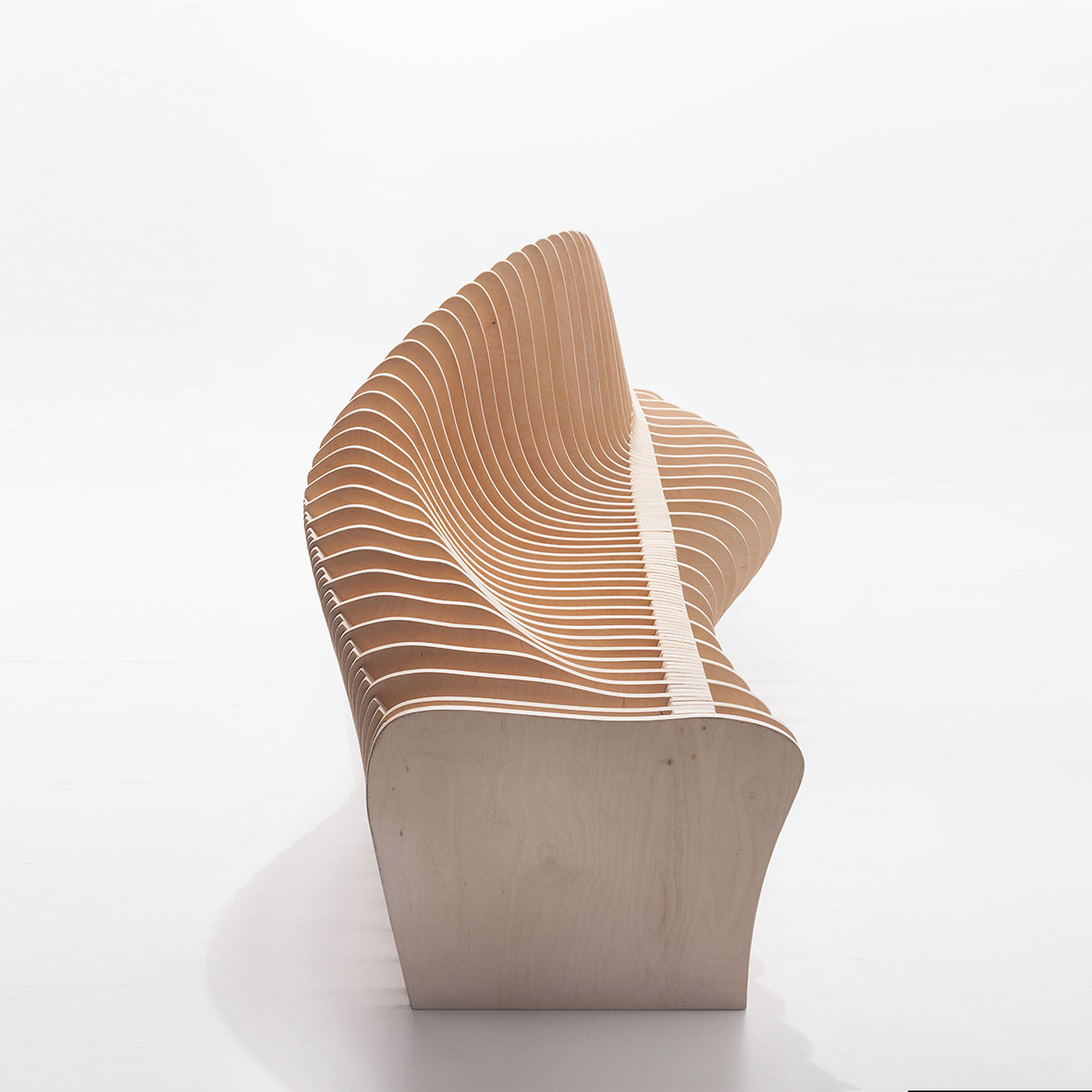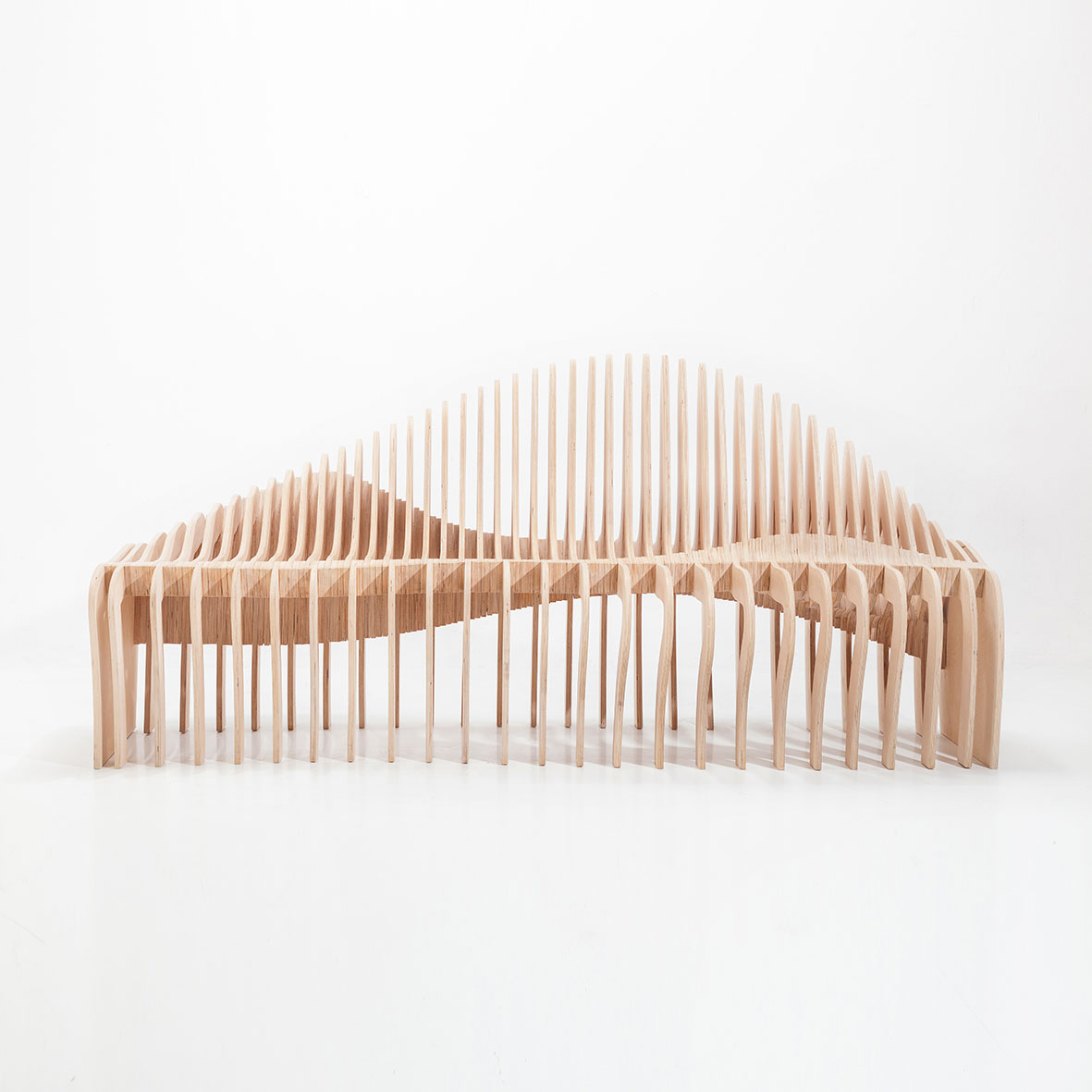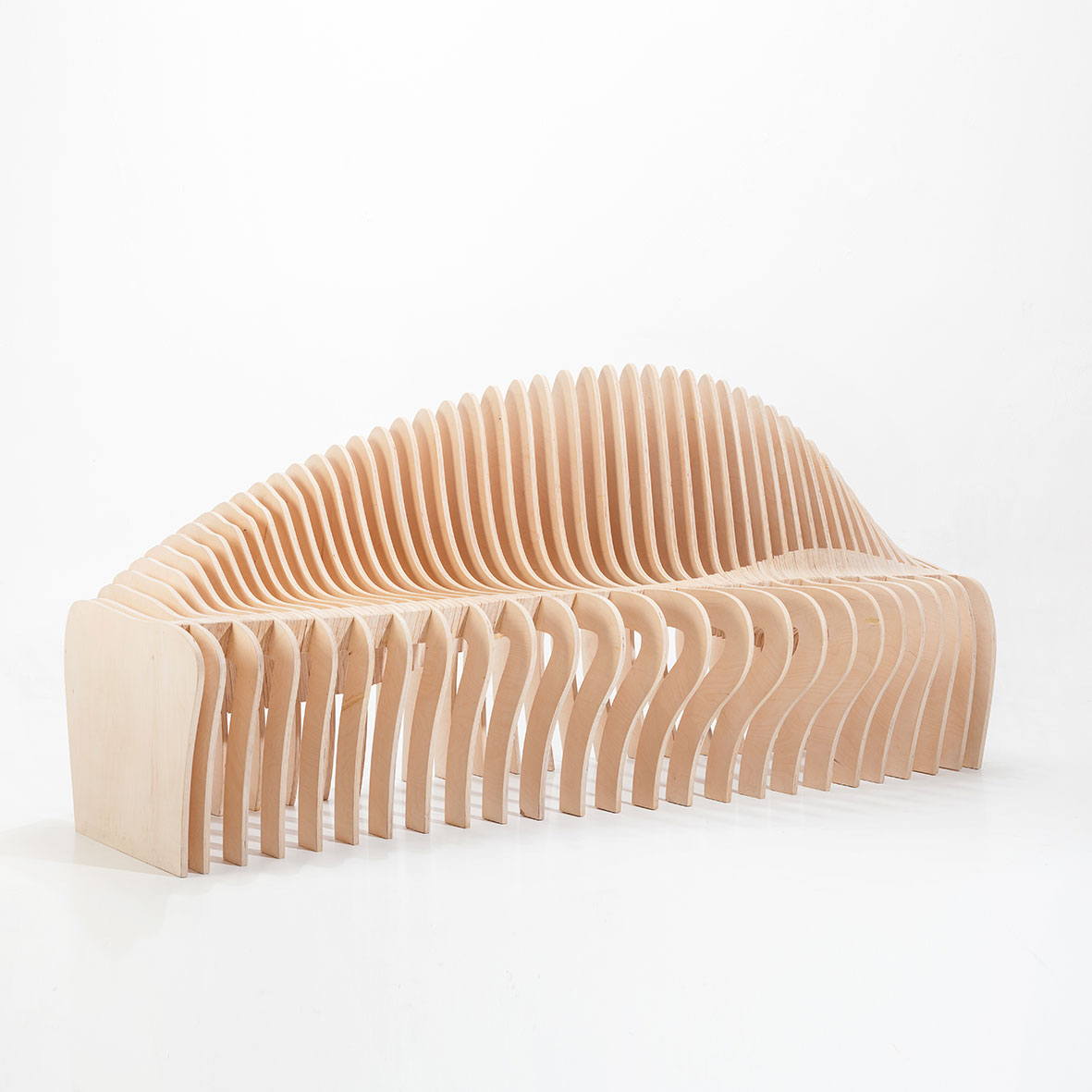 Una pieza de mobiliario escultórico realizada con 5 tableros de contrachapado de abedul de 15 mm, tratado con aceite neutro que resalta la veta natural de la madera. Un diseño creado por MrFeelWood a partir de algoritmos paramétricos que permiten que cada pieza se pueda personalizar a medida del cliente.