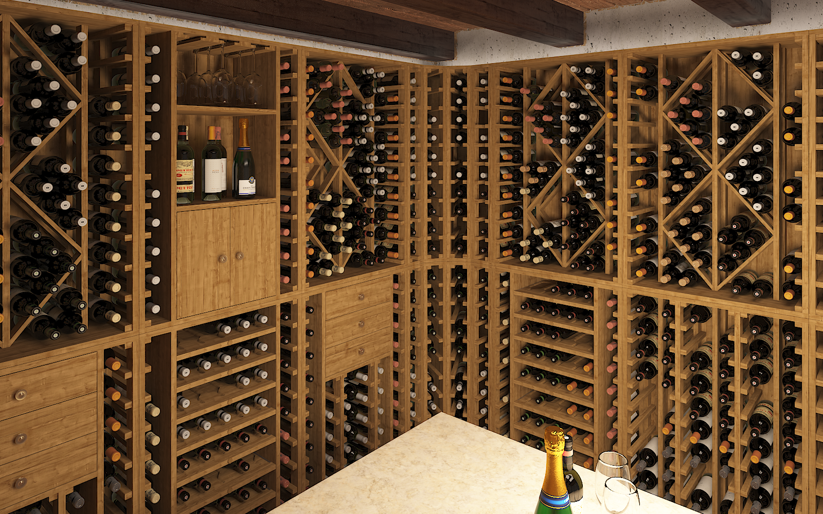 Una instalación Bodega en restaurante en Malaga. Capacidad para 3500 botellas. Realizada con muebles de pino teñidos en color roble claro. Se incorporó una base de 10 cm e iluminación con tiras de LED cálido. Cerramiento de cristal y climatización estándar.