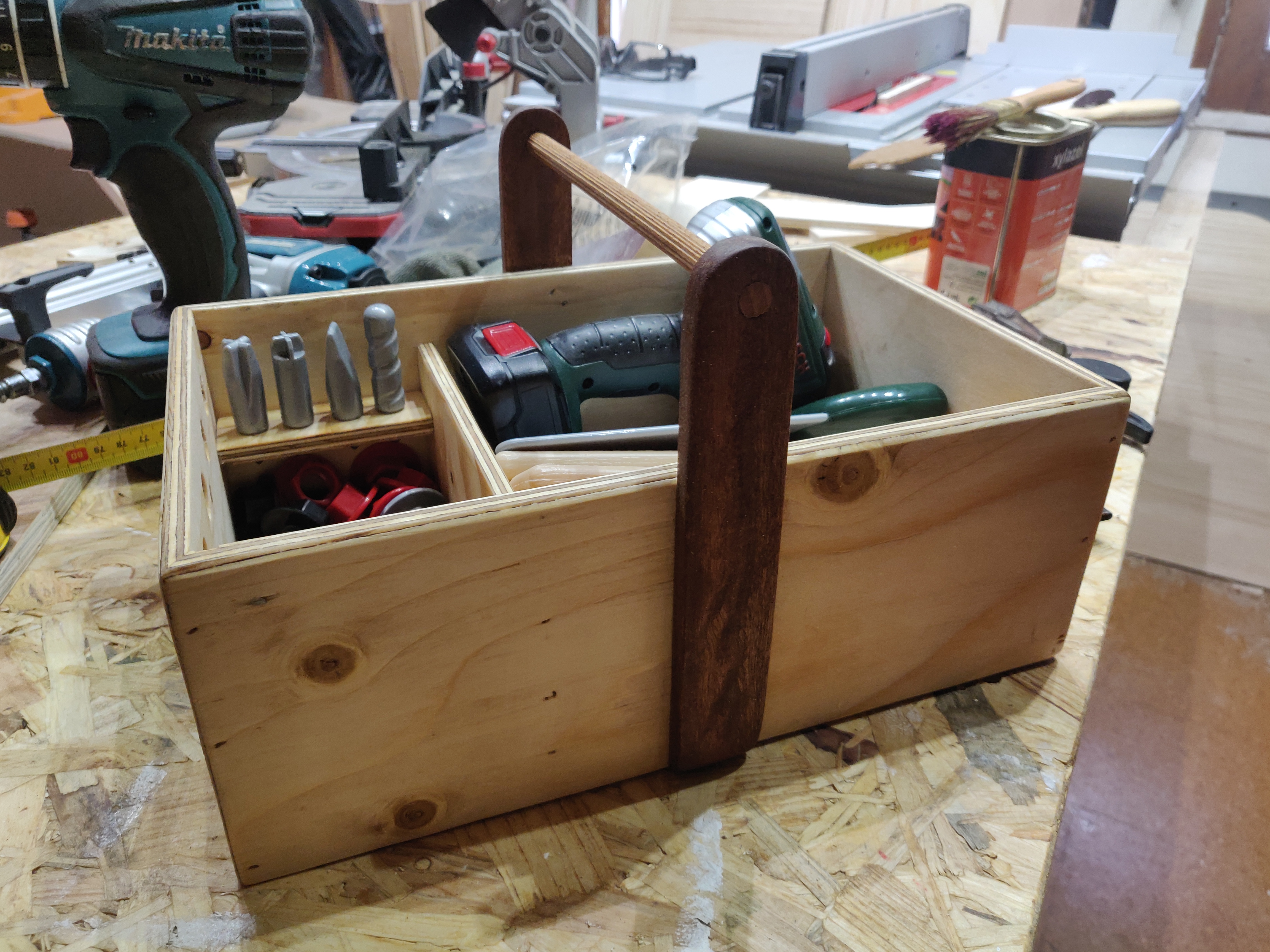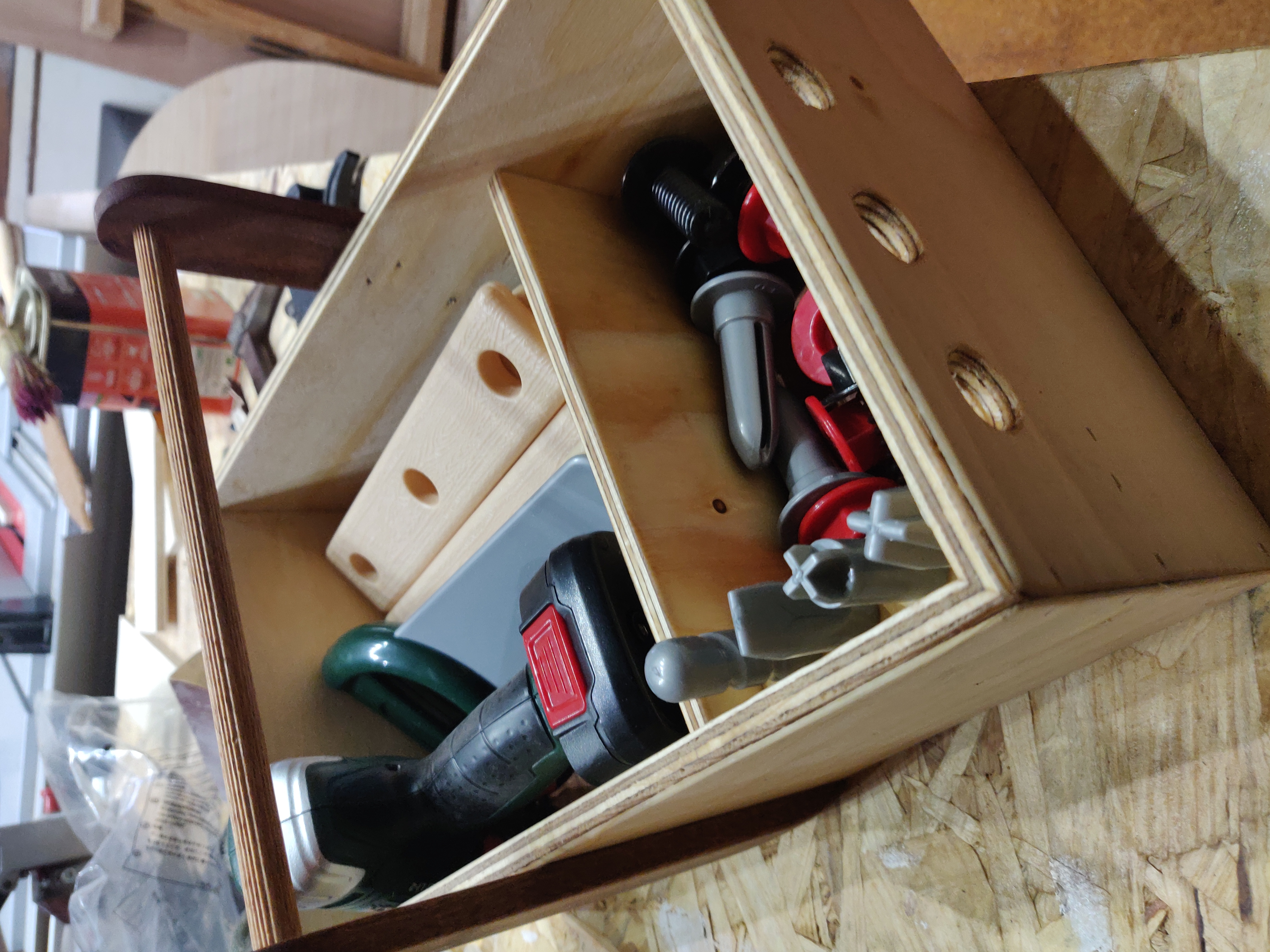 Caja herramientas en contrachapado de pino radiata y sapelly.