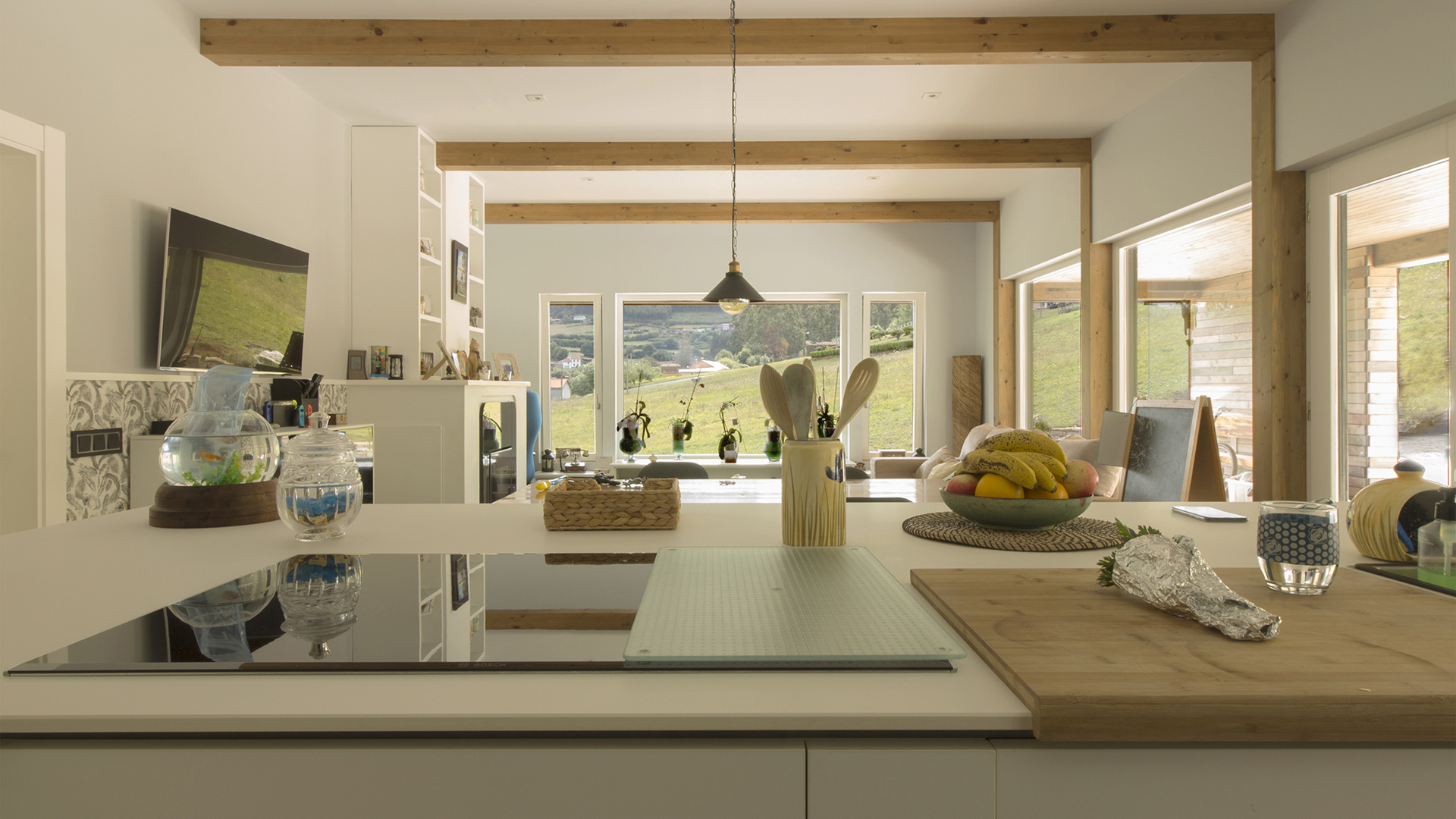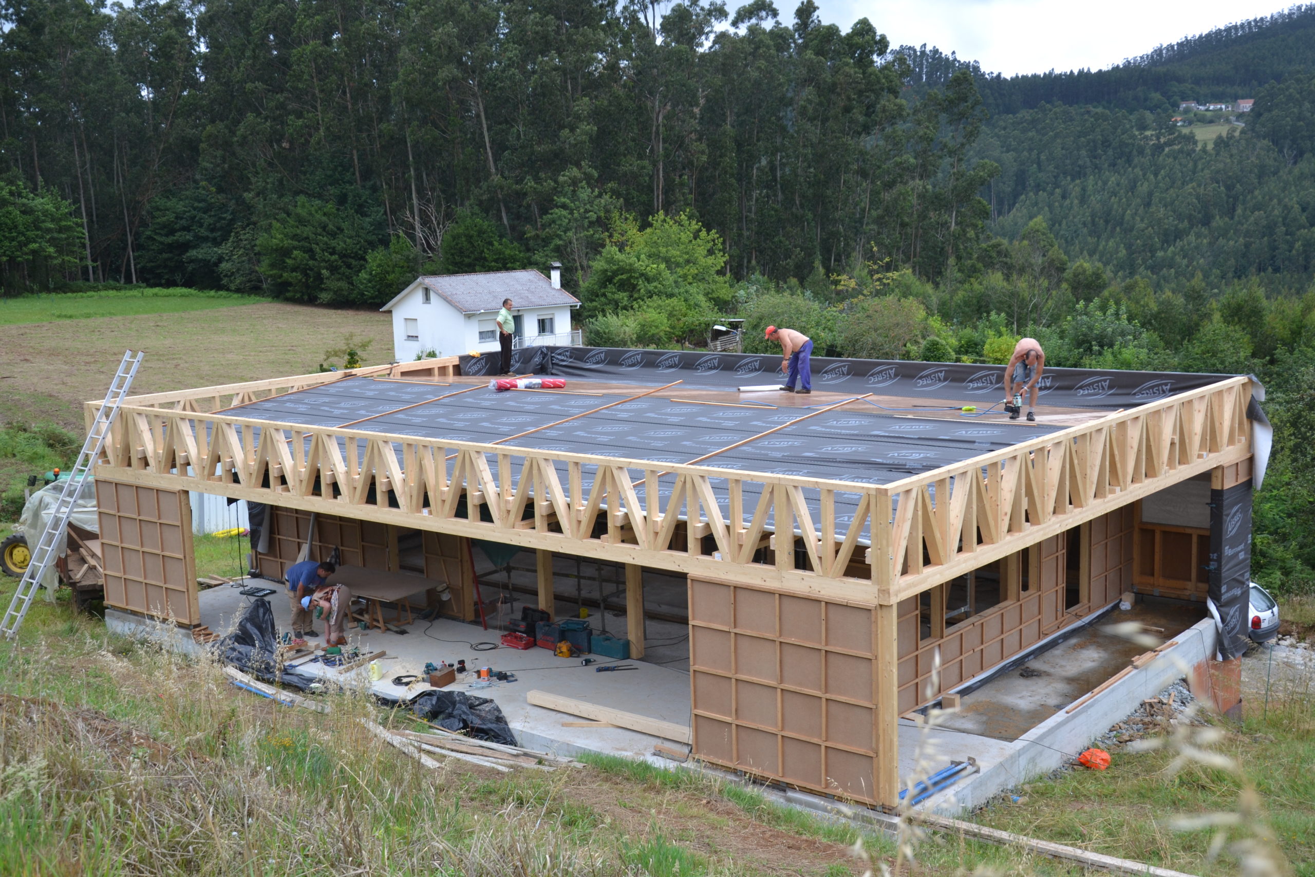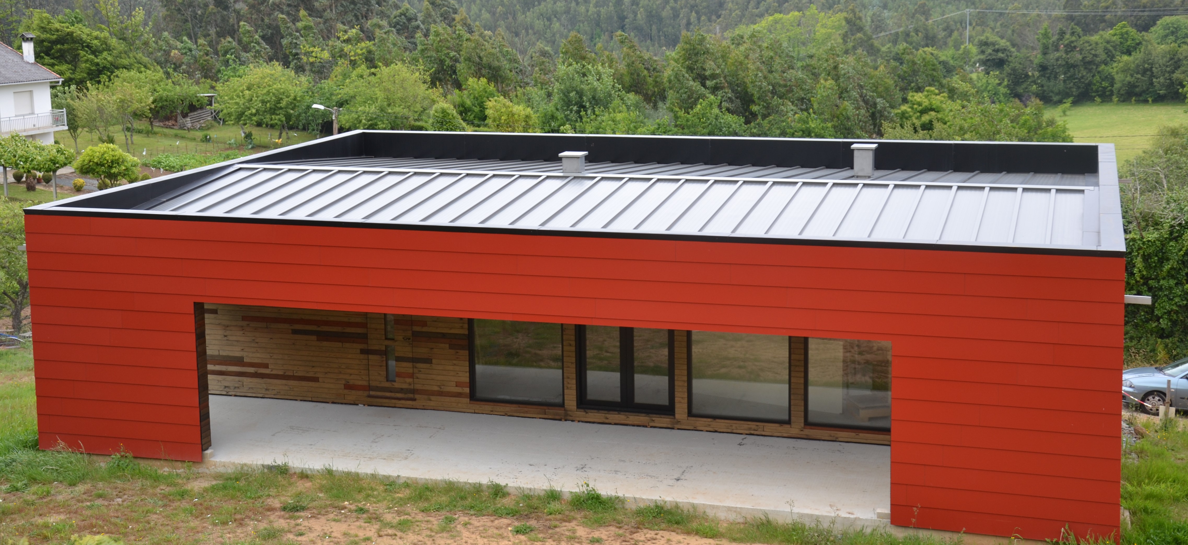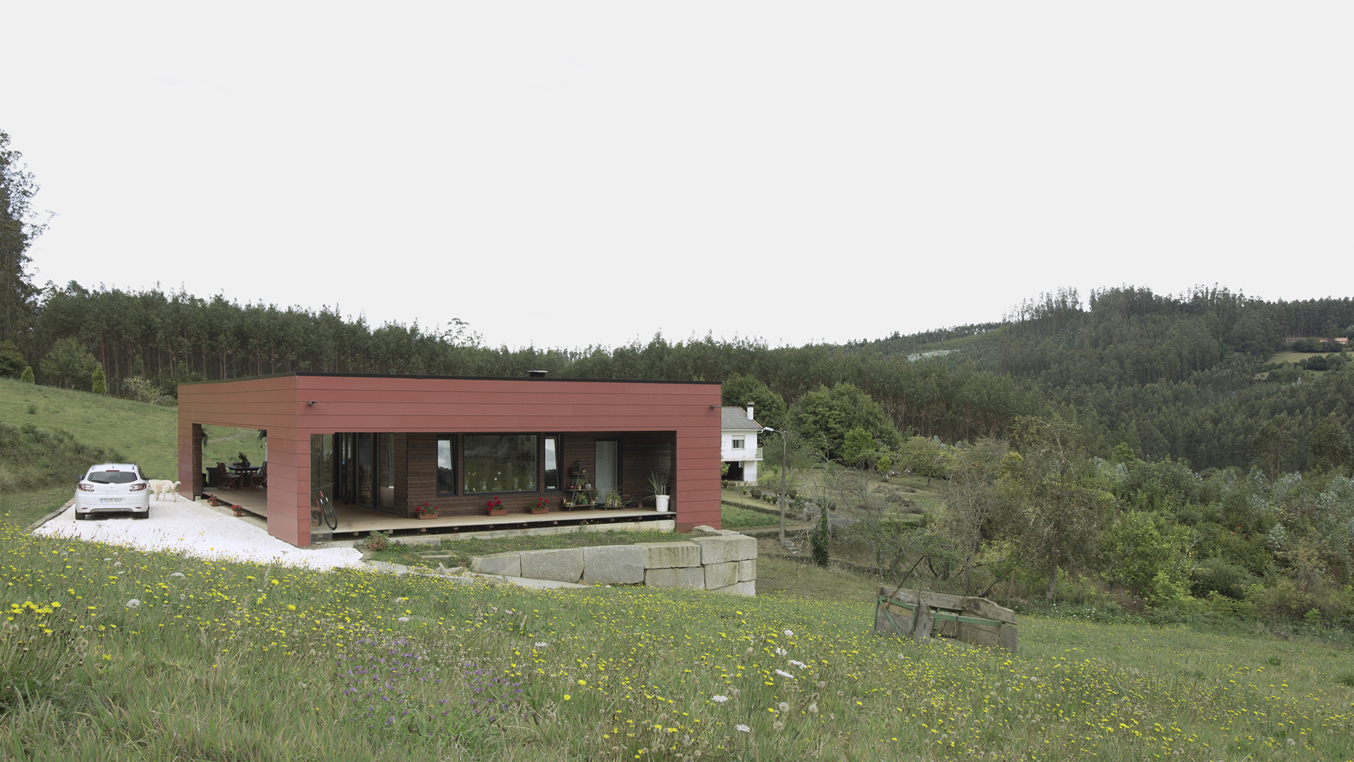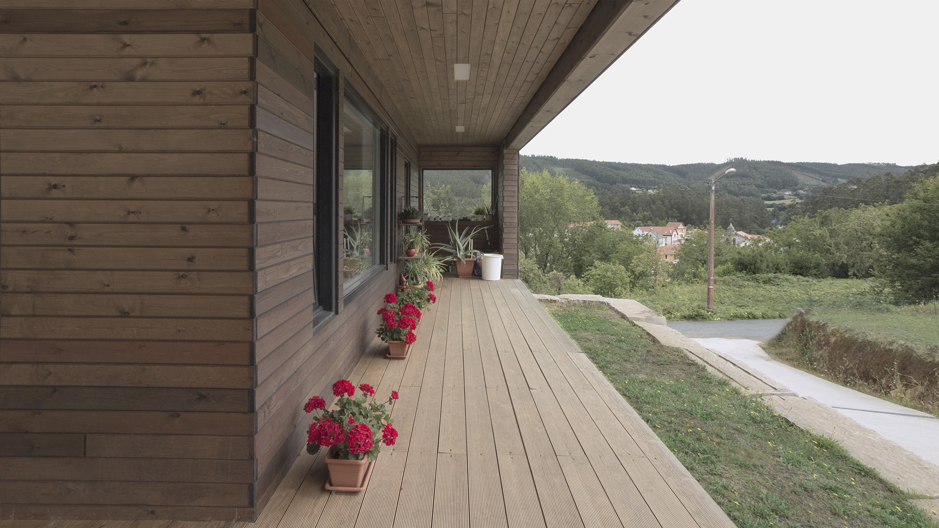 Se proyecta una vivienda con un volumen en planta baja con un gran porche en L sobre un semisótano para adaptarla al terreno. Está construida con estructura de entramado con madera laminada, revestida con la combinación de madera de pino teñida en porche y compacto fenólico en fachada ventilada del resto de la vivienda. Algunos datos de la vivienda: Superficie construida: 218,39 m2 Número de plantas: Planta baja + semisótano Número de dormitorios: 3 Número de baños: 2 Arquitectura: Domohomo Design,S.L