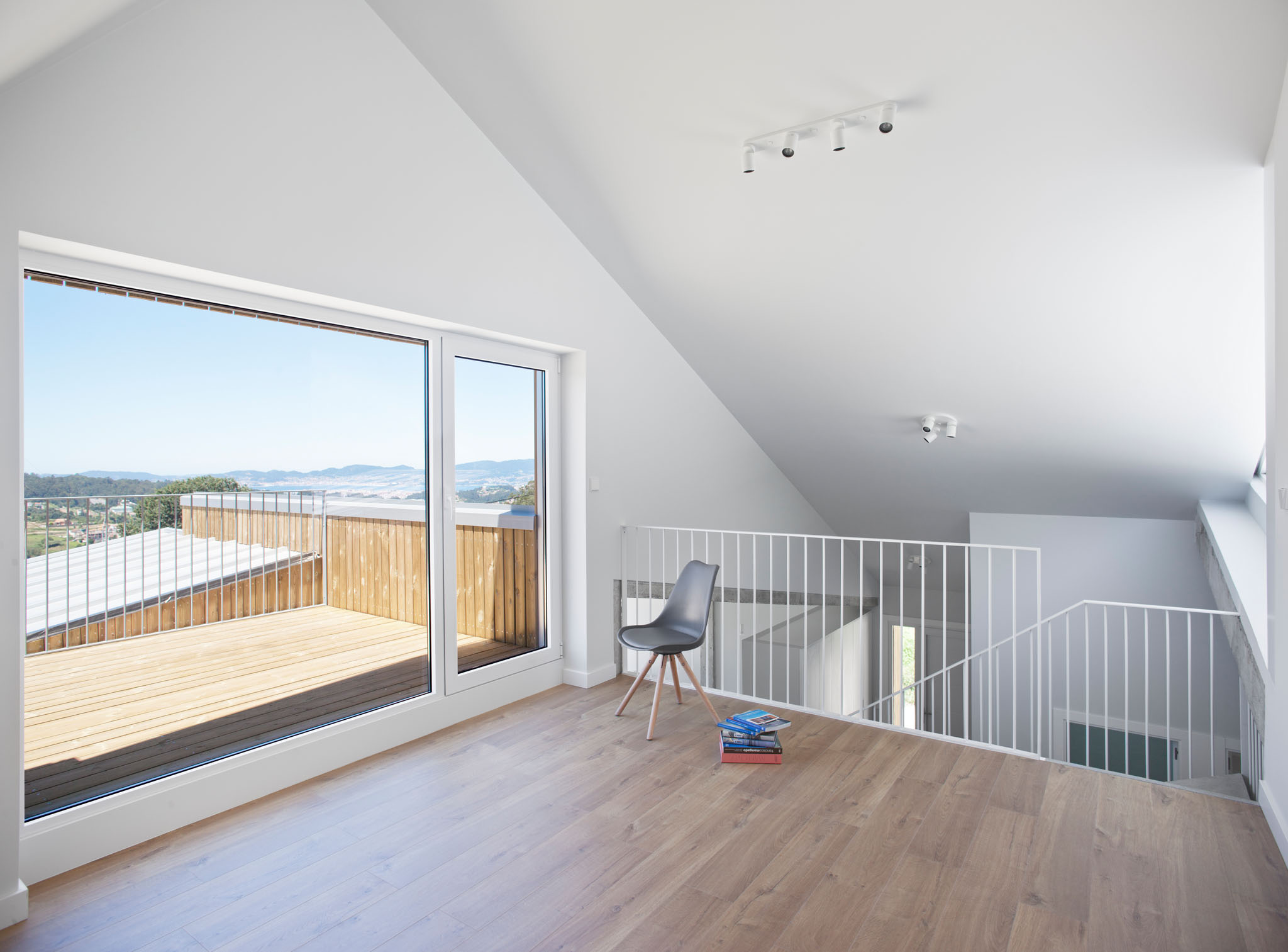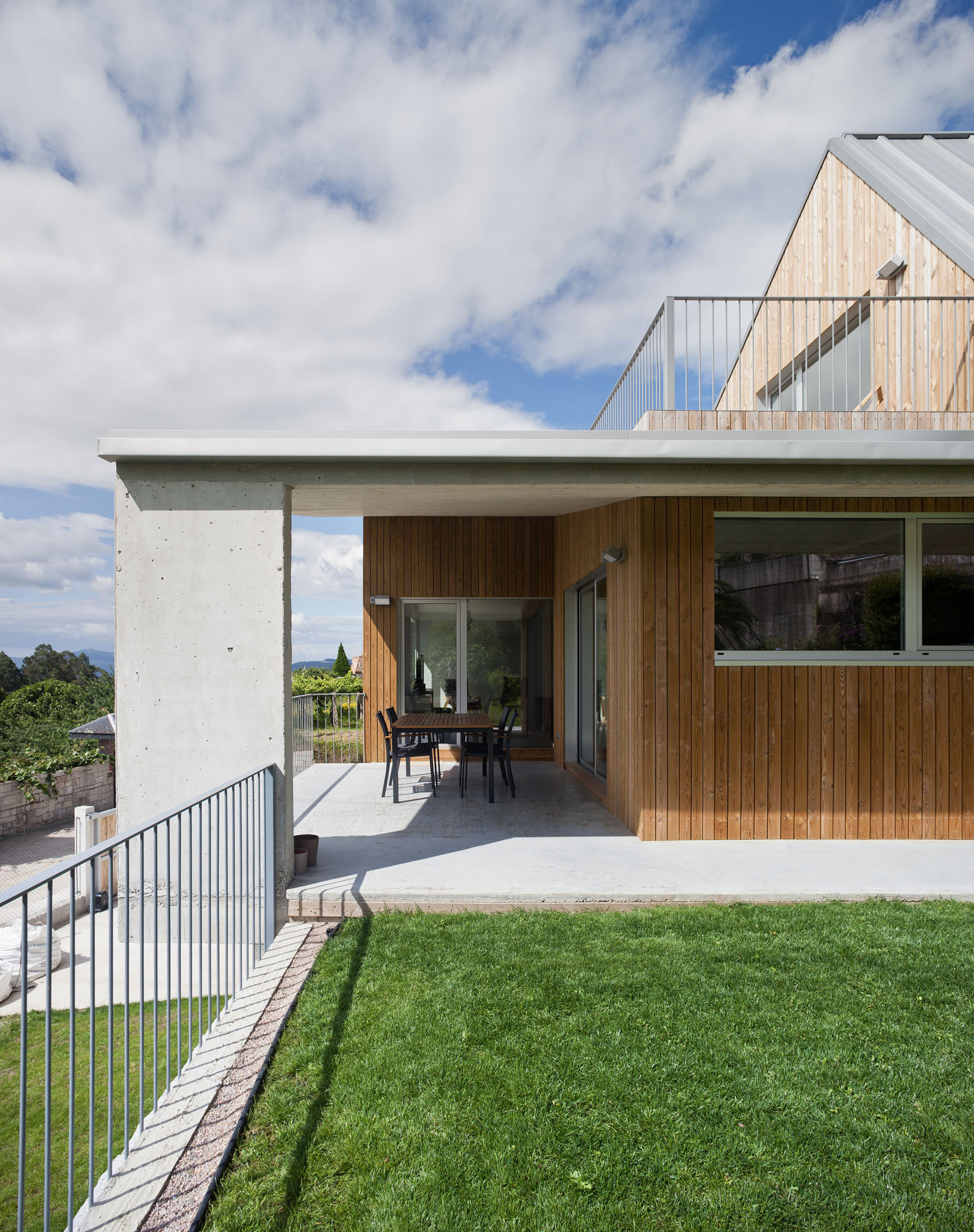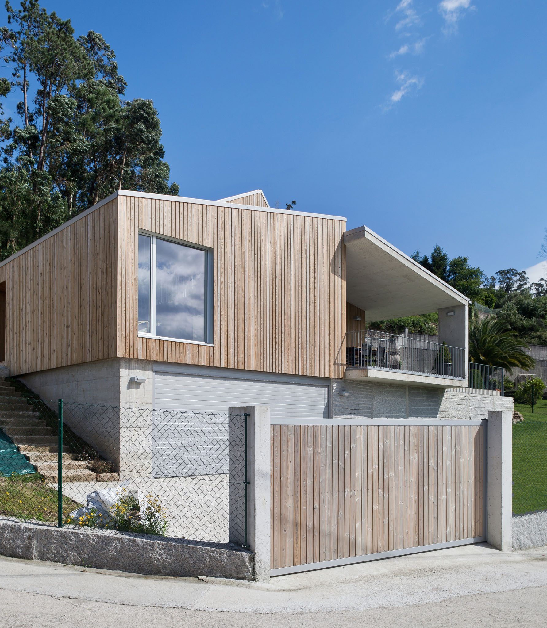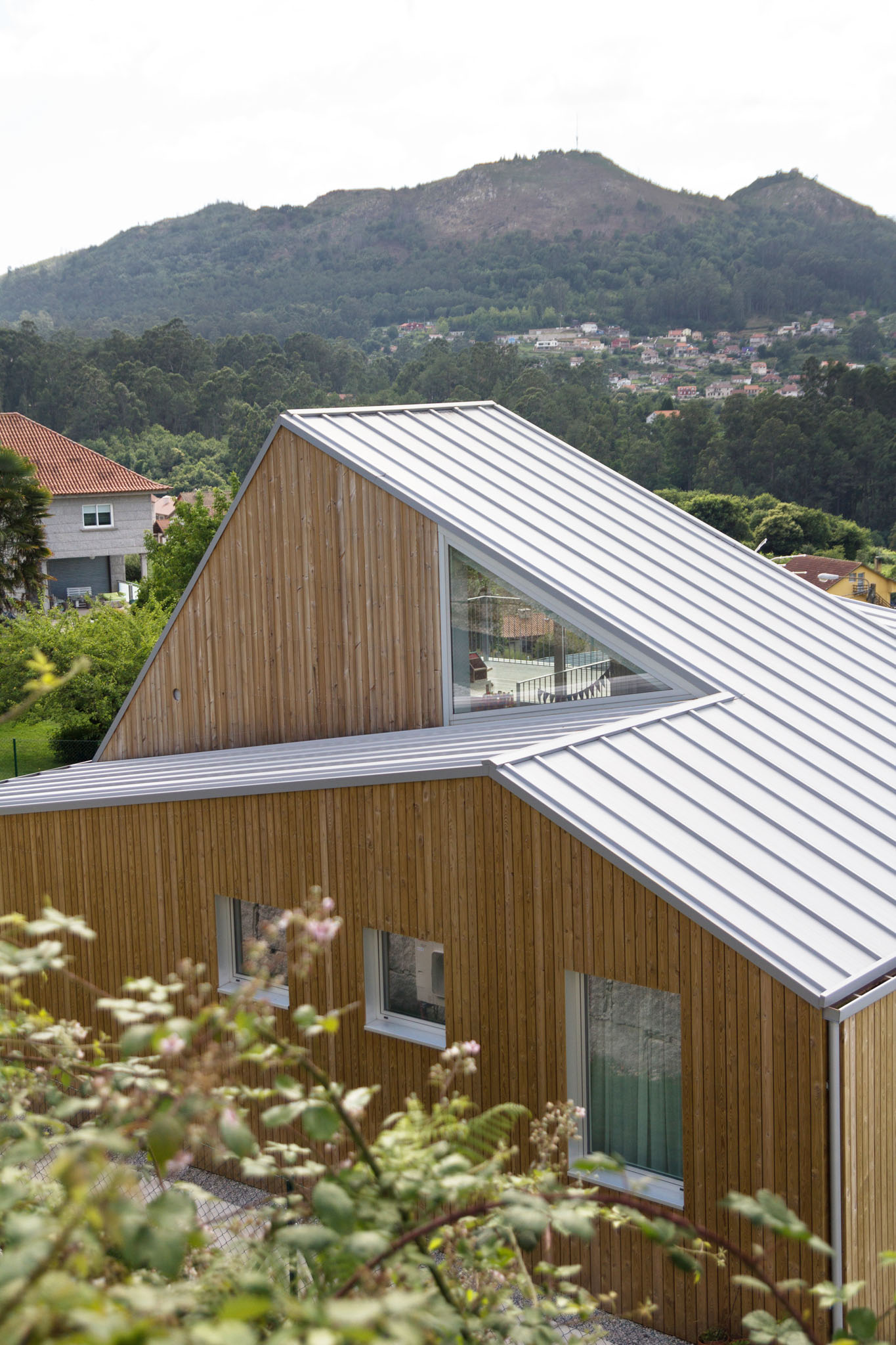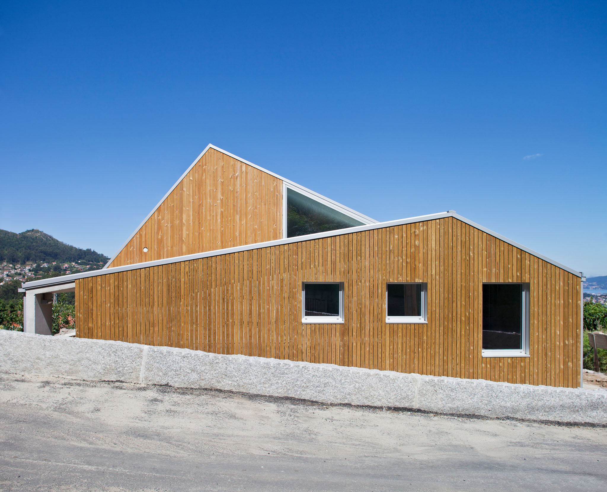 Una vivienda unifamiliar volumétrica ubicada en un entorno rural con una envolvente que prolonga la fachada norte de la cubierta, generando un juego de cubiertas inclinadas que integran la vivienda en el paisaje. La integración en el entorno se consigue también con la utilización de madera de pino tratada en autoclave para la fachada y la cubierta metálica. El programa se resuelve en una única planta que apoyada sobre un desnivel del terreno que configura el acceso al garaje y un jardín que permite la entrada del sol durante todo el día. La cocina y el salón comedor se orientan al oeste, donde están las vistas más interesantes de la parcela y con acceso directo al jardín, cubierto con el porche en que termina la cubierta para conseguir mayor privacidad al interior. Alrededor de un distribuidor generoso en su dimensión se organizan los dormitorios y áreas de servicios y se provee a la vivienda de un espacio filtro para zona de juegos o estudio.