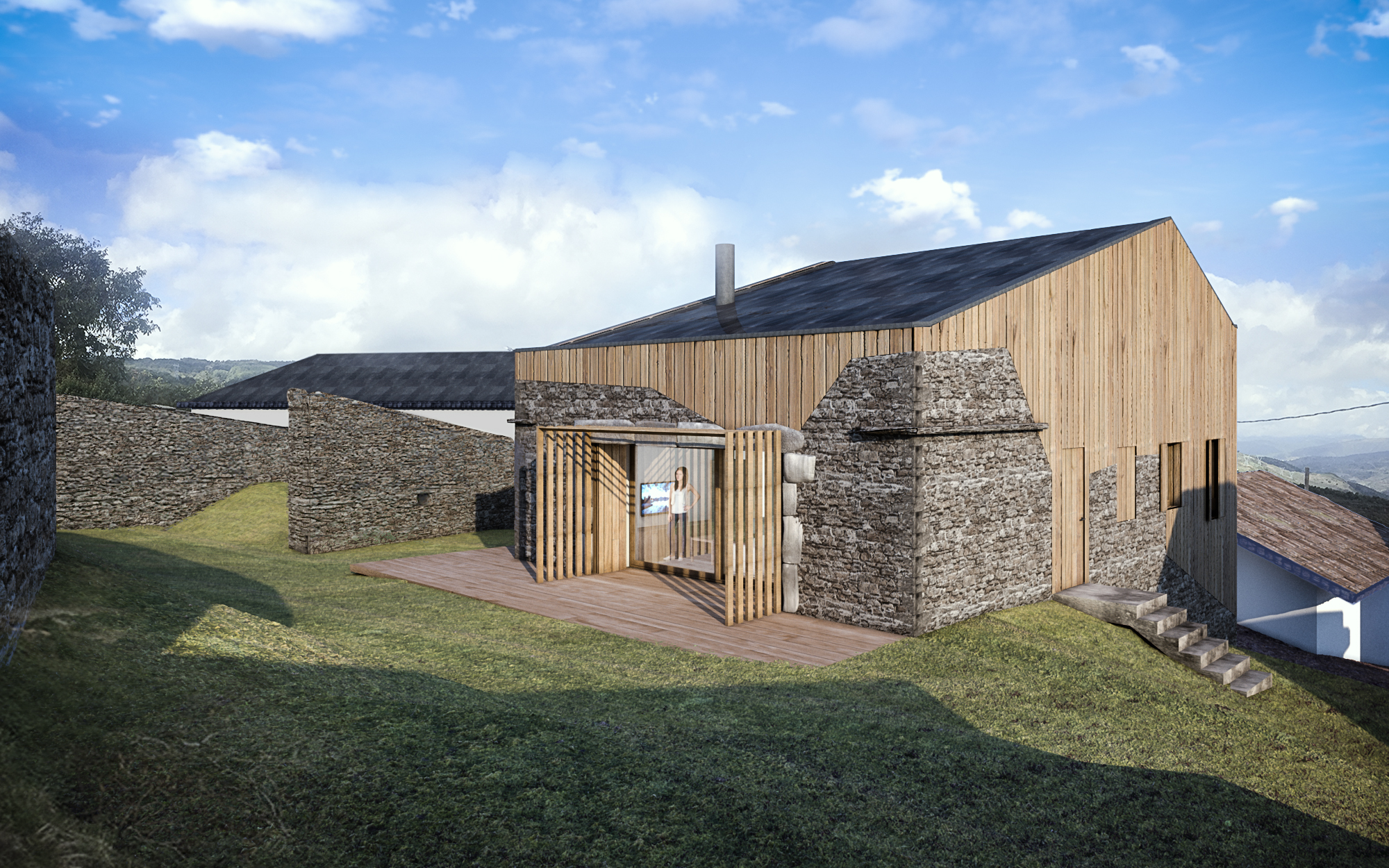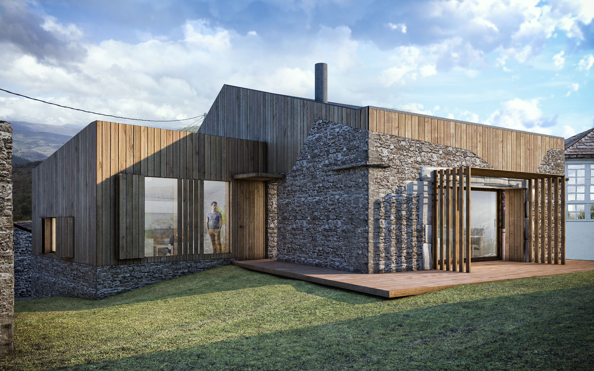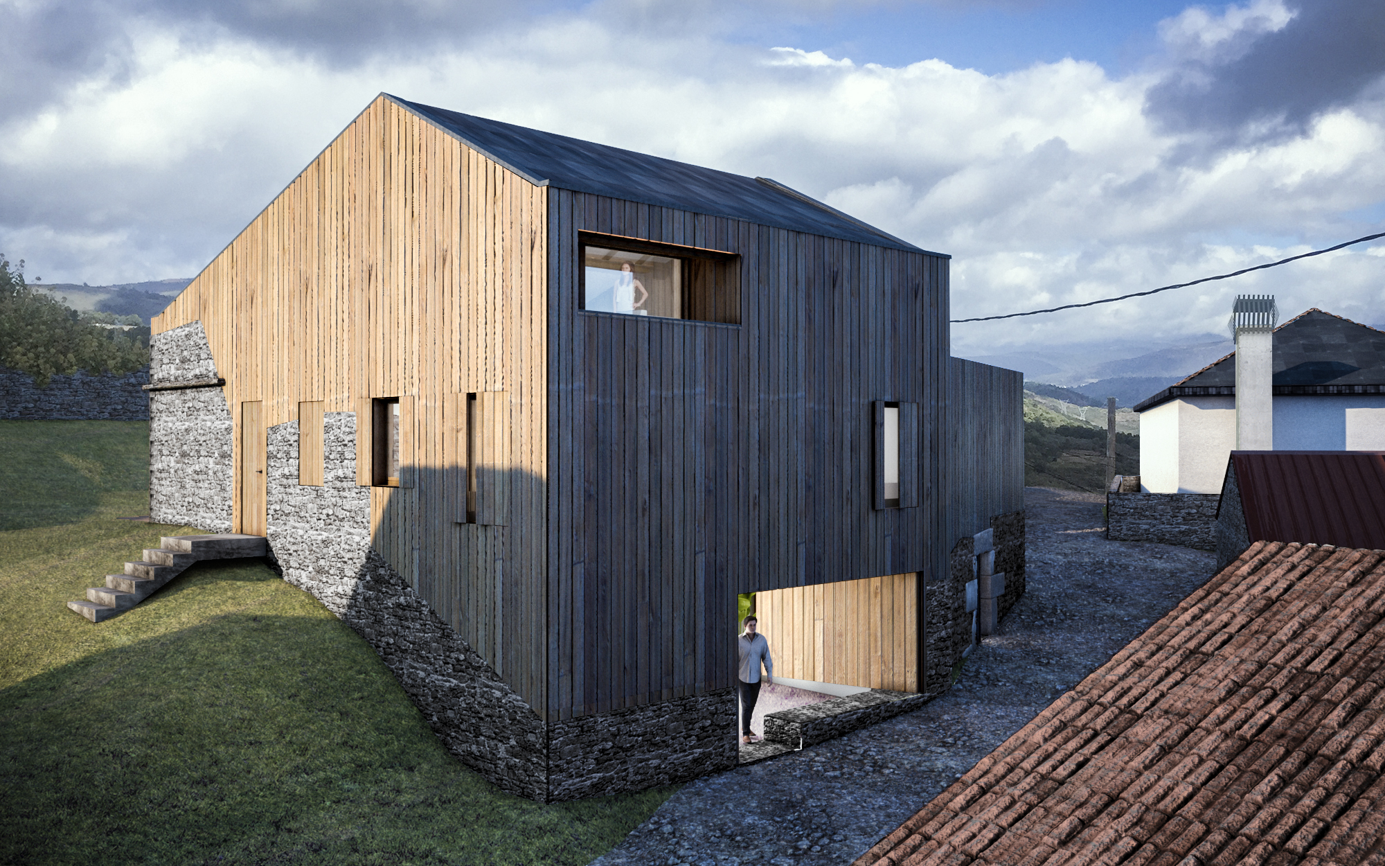 La vivienda Passivhaus, ubicada en Castrelo de Piñeiro, es una reconstrucción que se asienta sobre los vestigios de unos muros de piedra que han sobrevivido al paso de los años, los cuales recuperamos y completamos con estructura y piel de madera. Estos muros determinan la orientación de la vivienda, lo que condiciona su eficiencia energética. La edificación se divide en dos volúmenes orientados al Norte hacia la calle y las espectaculares vistas, y al Sur hacia el pequeño jardín. La base de esta casa pasiva son los materiales autóctonos. Para completar los muros de piedra existentes utilizamos madera de castaño y de eucalipto tanto en la estructura como en la envolvente, que junto con el aislamiento mineral ayudan a optimizar las condiciones de confort interior. Las carpinterías son de madera y triple vidrio de altas prestaciones para mejorar el comportamiento energético de la vivienda en el clima extremo de la zona, con inviernos muy fríos y veranos cálidos. El diseño de los huecos de las fachadas respeta el estilo de las construcciones tradicionales de su entorno y viene determinado por las trazas preexistentes en los muros. Debido a las necesidades de captación solar, estos huecos se adaptan en la fachada Sur. Más que una vivienda familiar, este proyecto quiere formar parte de la vida de la zona y convertirse en un motor económico siguiendo los principios de la economía circular, implicando para su construcción a los profesionales y los recursos naturales del propio entorno.