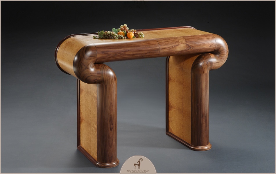 Una consola diseñada para la entrada de un penthouse en Londres. Hice un marco para un espjo para estos clientes usando las mismas maderas entonces ellos quierian una consola para reemplazar un antiguedad. Las maderas son Palisandro en frente y las molduras y chapa de amboina. Hay dos cajones en frente.