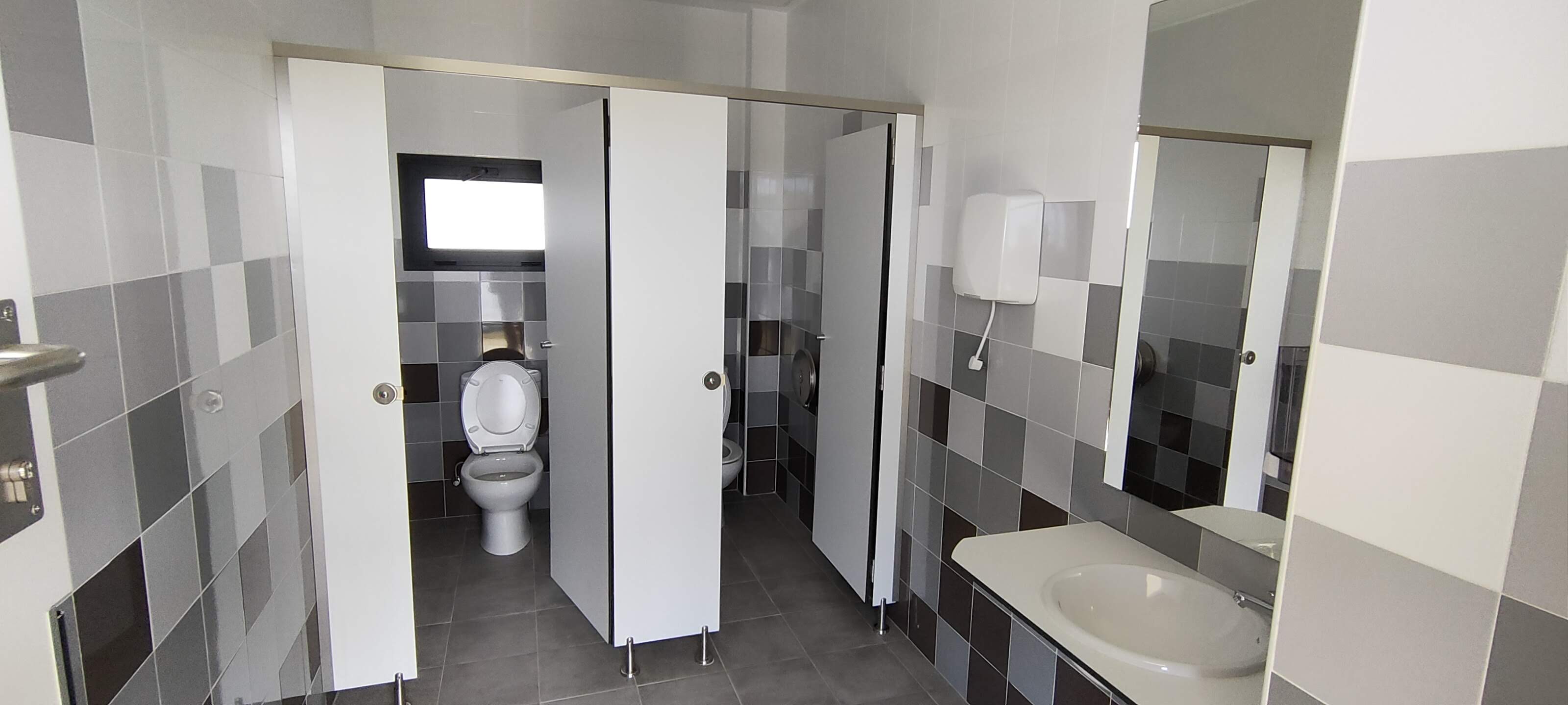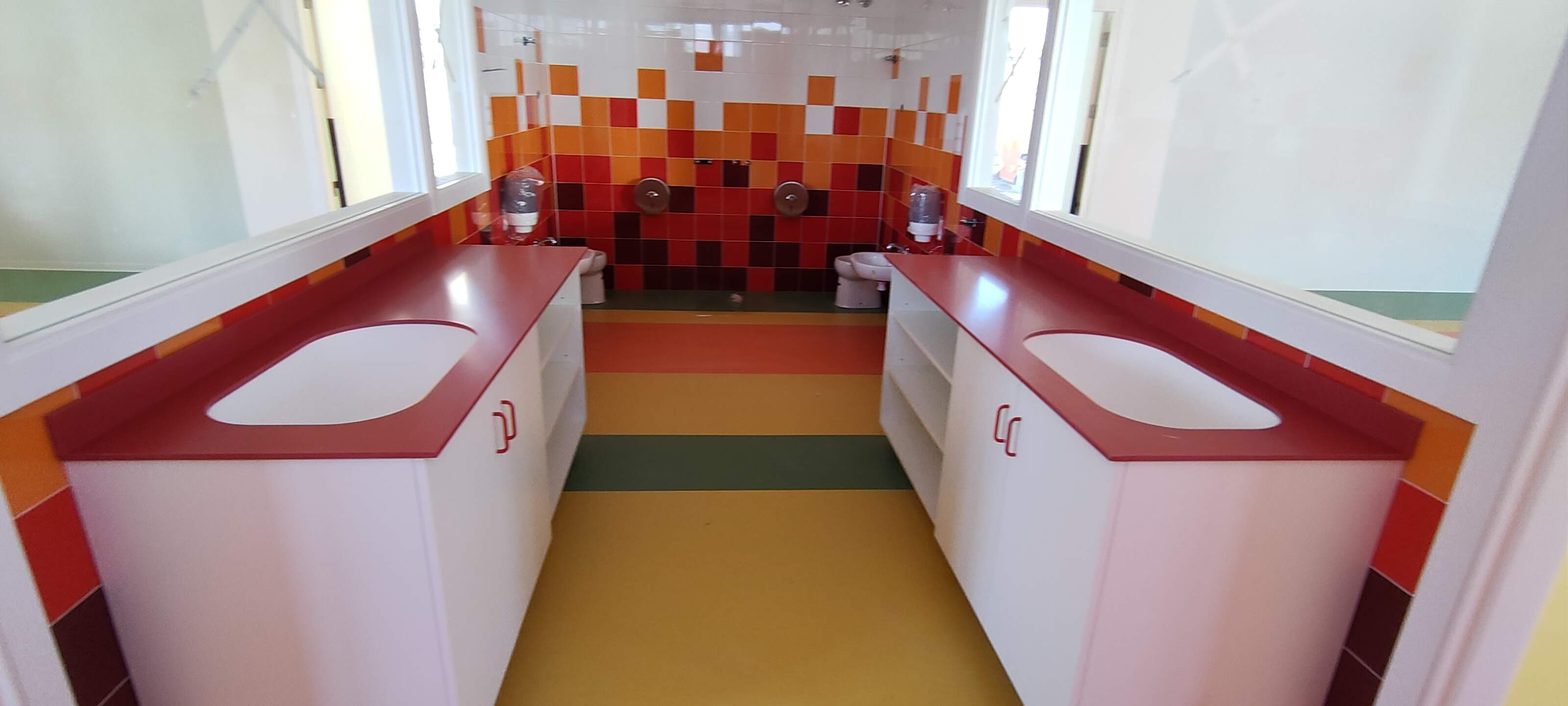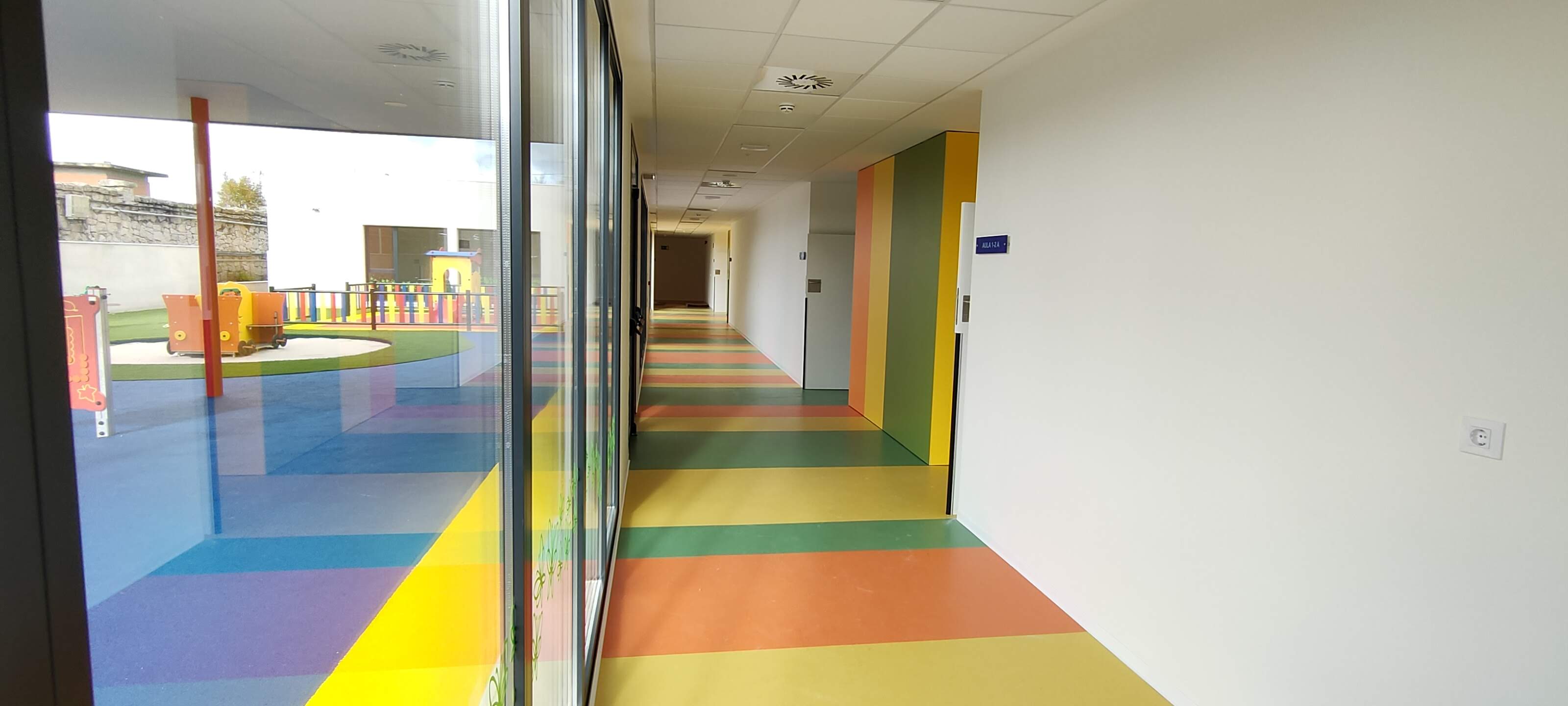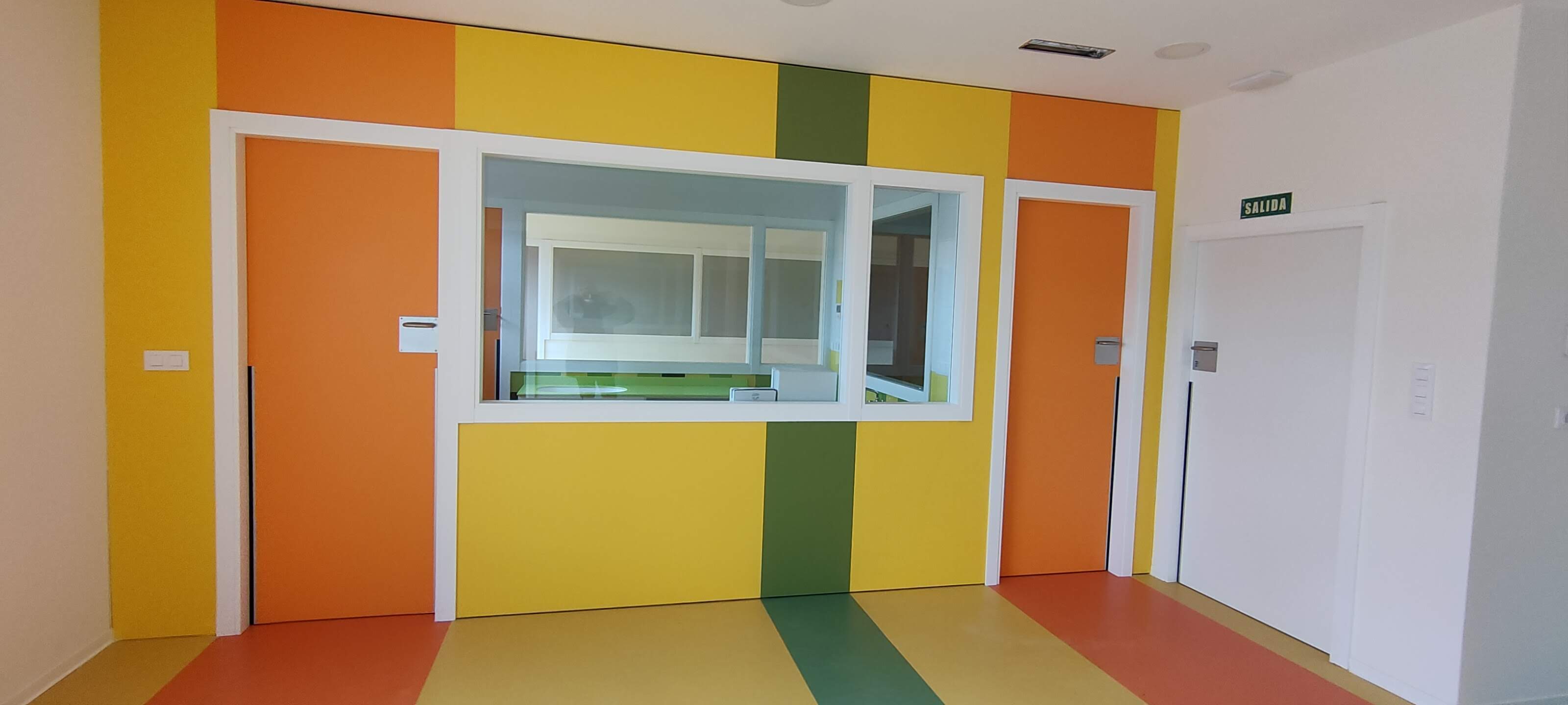 Se trata de la ejecución de una Escuela Infantil con varios productos distribuidos por nuestra empresa. Puertas de Laminado alta presión con dispositivos antipilladedos. Revestimientos de paredes con tableros laminados en colores varios. Cabinas y encimeras en laminado fenólico 12 mm. Muebles con encimeras de Solid Surface .
