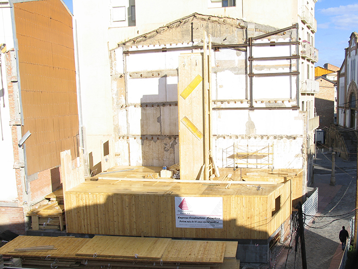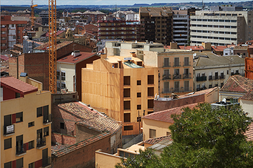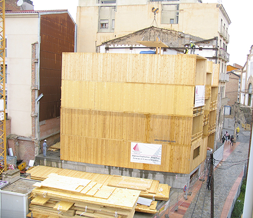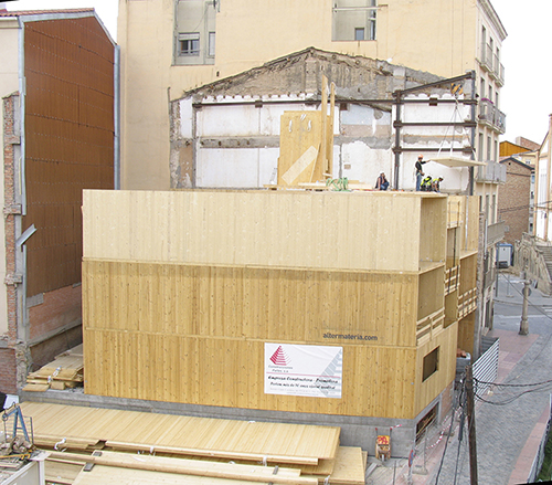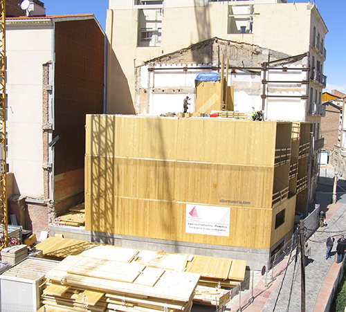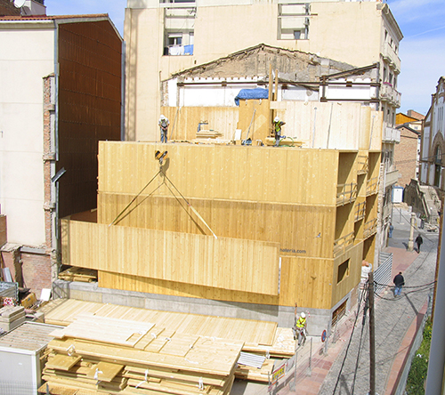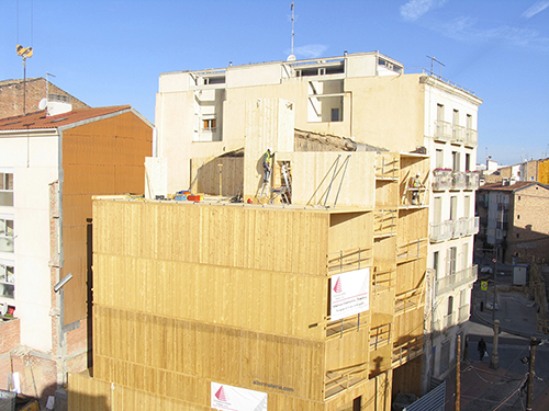 Fue el primer edificio de 5 plantas de madera en España, según un proyecto del arquitecto Ramón Llobera. El efecto visual envolvente y la inmediata sensación de calidez se conjugan con la impresión de firmeza que transmiten las soluciones elegidas para conectar los distintos elementos. La estructura utiliza paneles macizos de madera contralaminada, cortados a la medida exacta, tanto para muros y losas como para las escaleras y el núcleo del ascensor. Este sistema de montaje supone un significativo ahorro en tiempo y recursos, como queda reflejado no sólo en el plazo de ejecución -poco más de treinta jornadas a cargo de cuatro operarios cualificados-, sino en el reducido impacto: apenas se generan residuos y la incidencia negativa de la obra en el vecindario es mínima. Considerada además la eficiencia energética del resultado, no es extraño que este enfoque constructivo esté generando gran expectación en los ambientes profesionales más innovadores.