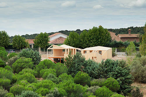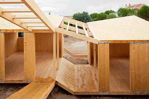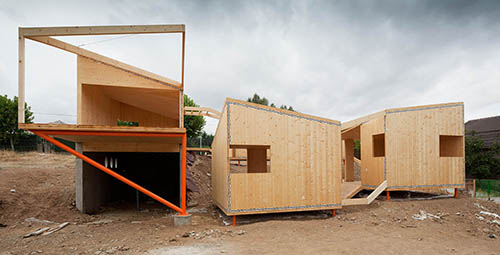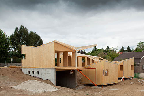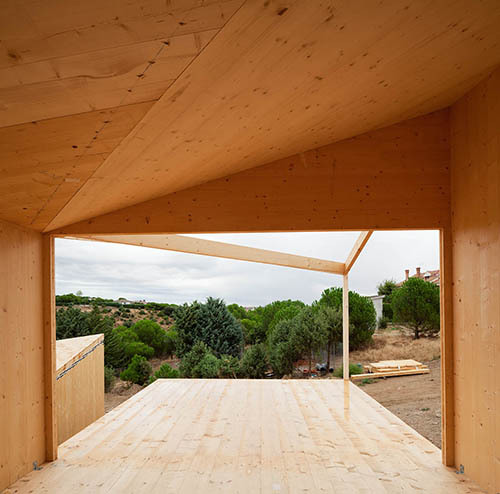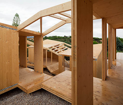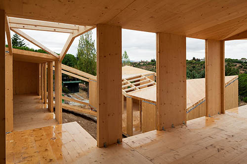 Montaje de la estructura en panel CLT, madera contralaminada, de una vivienda que se compone de varios módulos simétricos, todos ellos con forjado de panel contralaminado apoyado sobre pilotes metálicos que, retranqueados del perímetro exterior, aportan cierta ligereza a los distintos volúmenes. Gracias a la precisión del mecanizado CNC con el que se corta el panel contralaminado, las cubiertas se resuelven mediante idénticos faldones triangulares unidos por limahoyas diagonales que proporcionan un buen aprovechamiento de las aguas pluviales. La capacidad portante de los muros de CLT permite a los diseñadores la apertura de huecos de ventana en esquina sin necesidad de pilares o refuerzos adicionales. Un proyecto ejemplar en el aprovechamiento de las características mecánicas del panel de madera contralaminada.