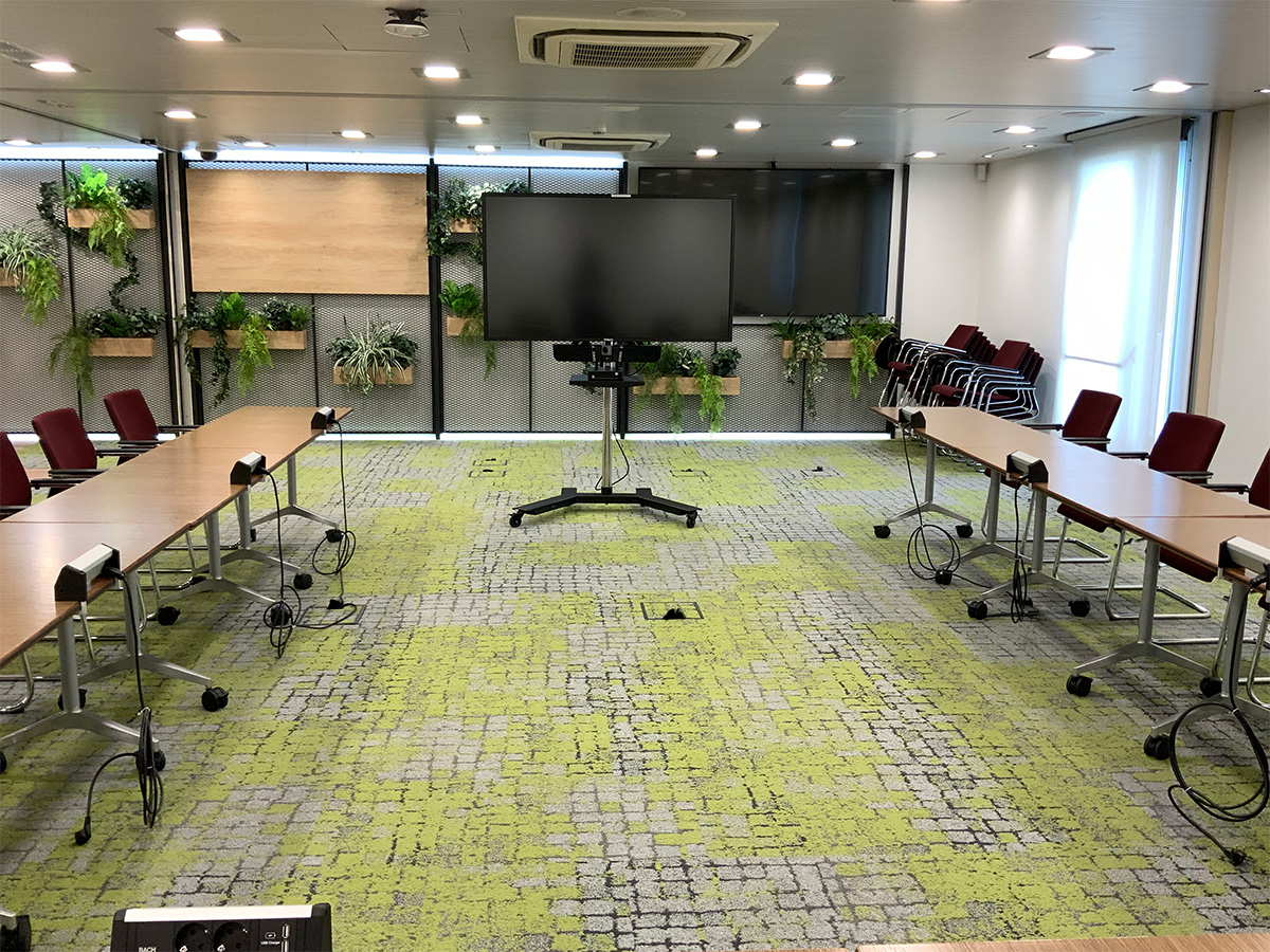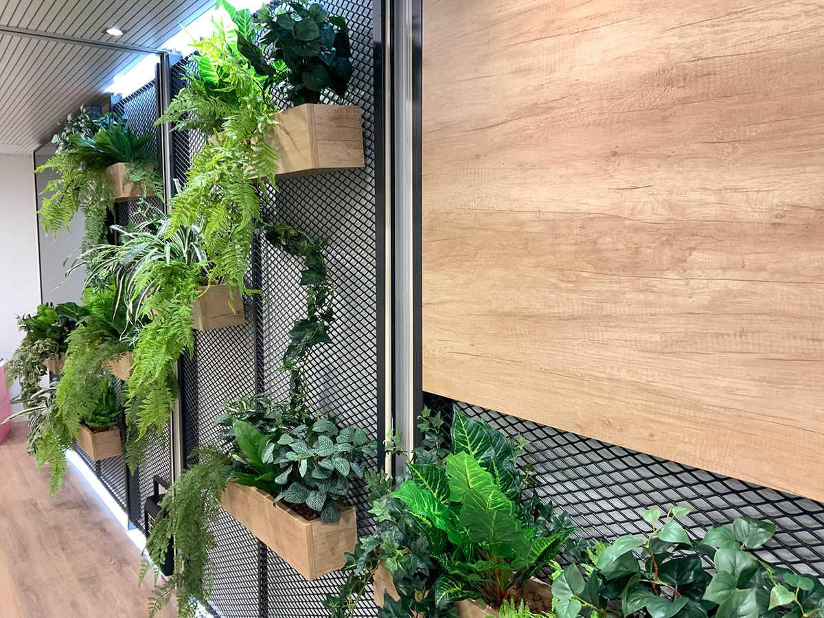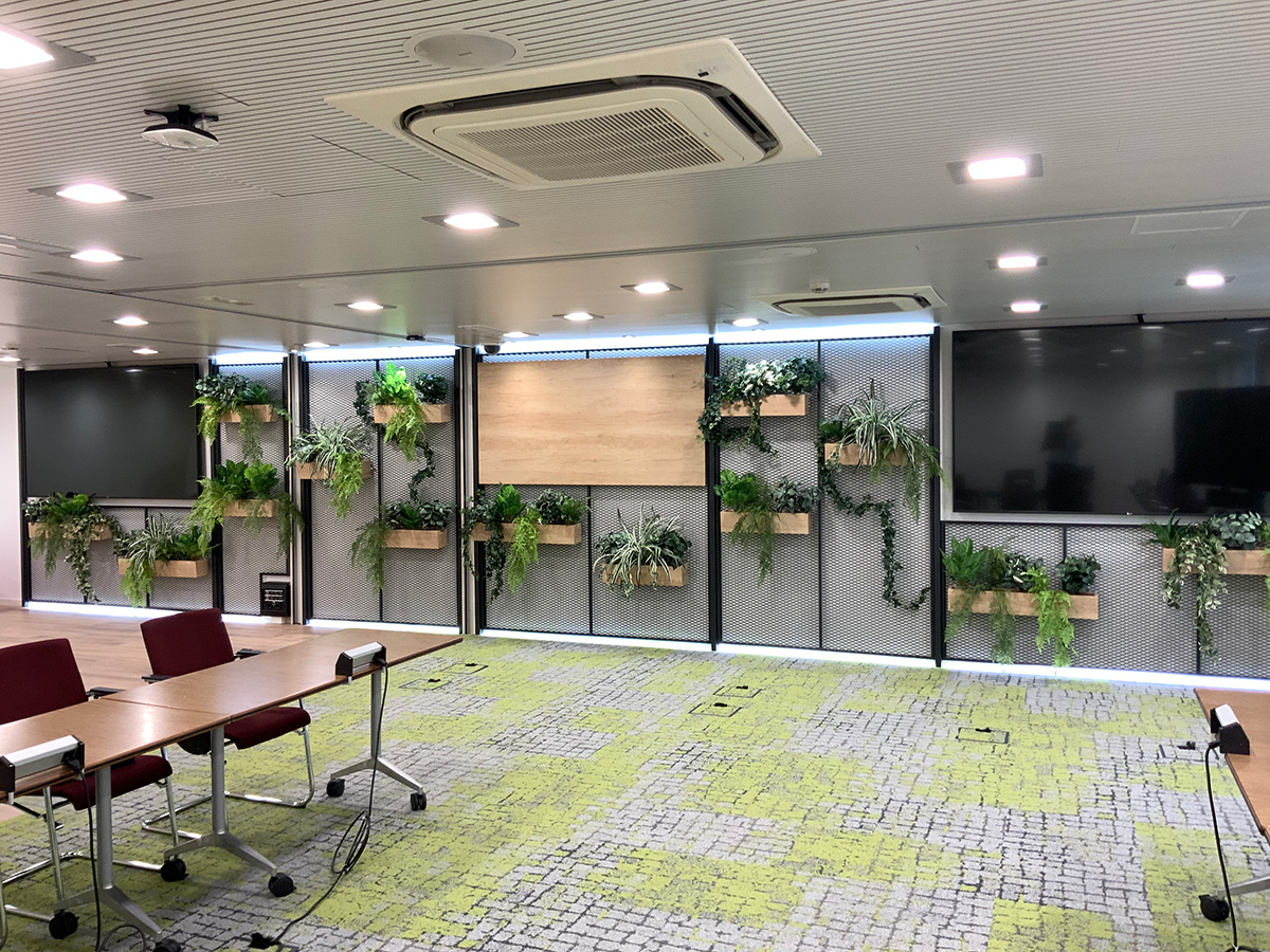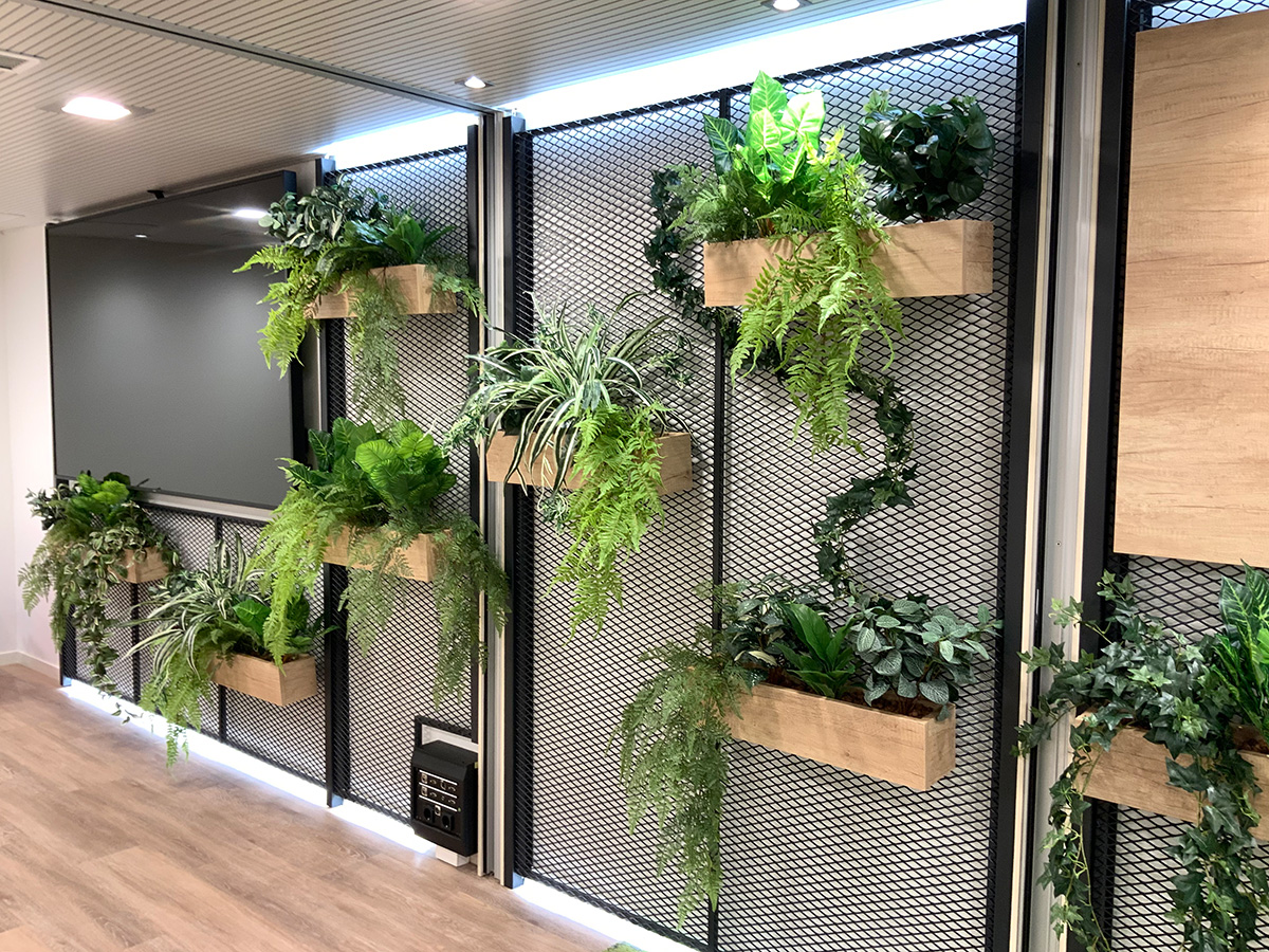 Instalación en sala de reuniones de gran tamaño consistente en el forrado de la pared principal mediante paneles de rejilla metálica integrando pantallas audiovisuales, instalación eléctrica, etc. Estos paneles están provistos de iluminación led en toda la línea superior e inferior por la parte trasera y permiten la colocación de maceteros fabricados en tablero laminado en cualquier punto de la pared.