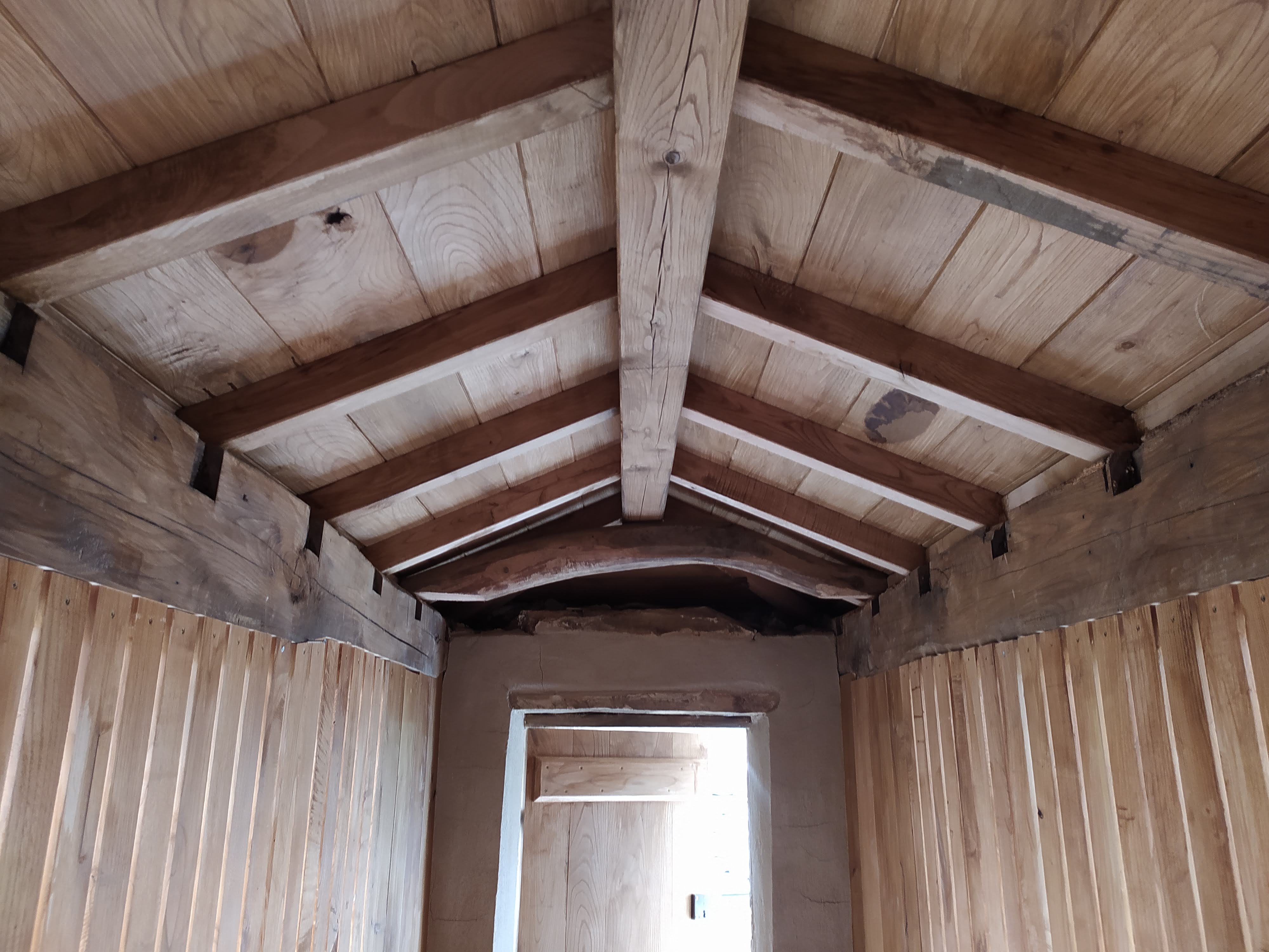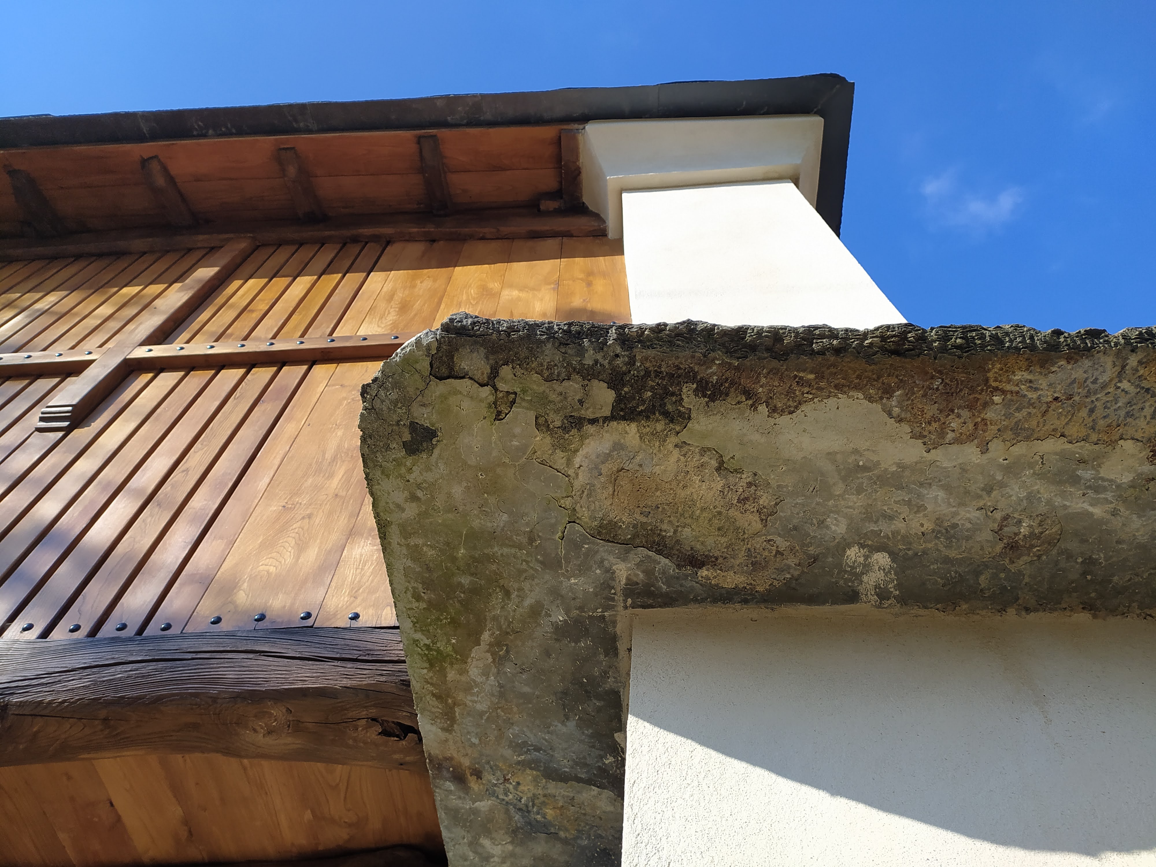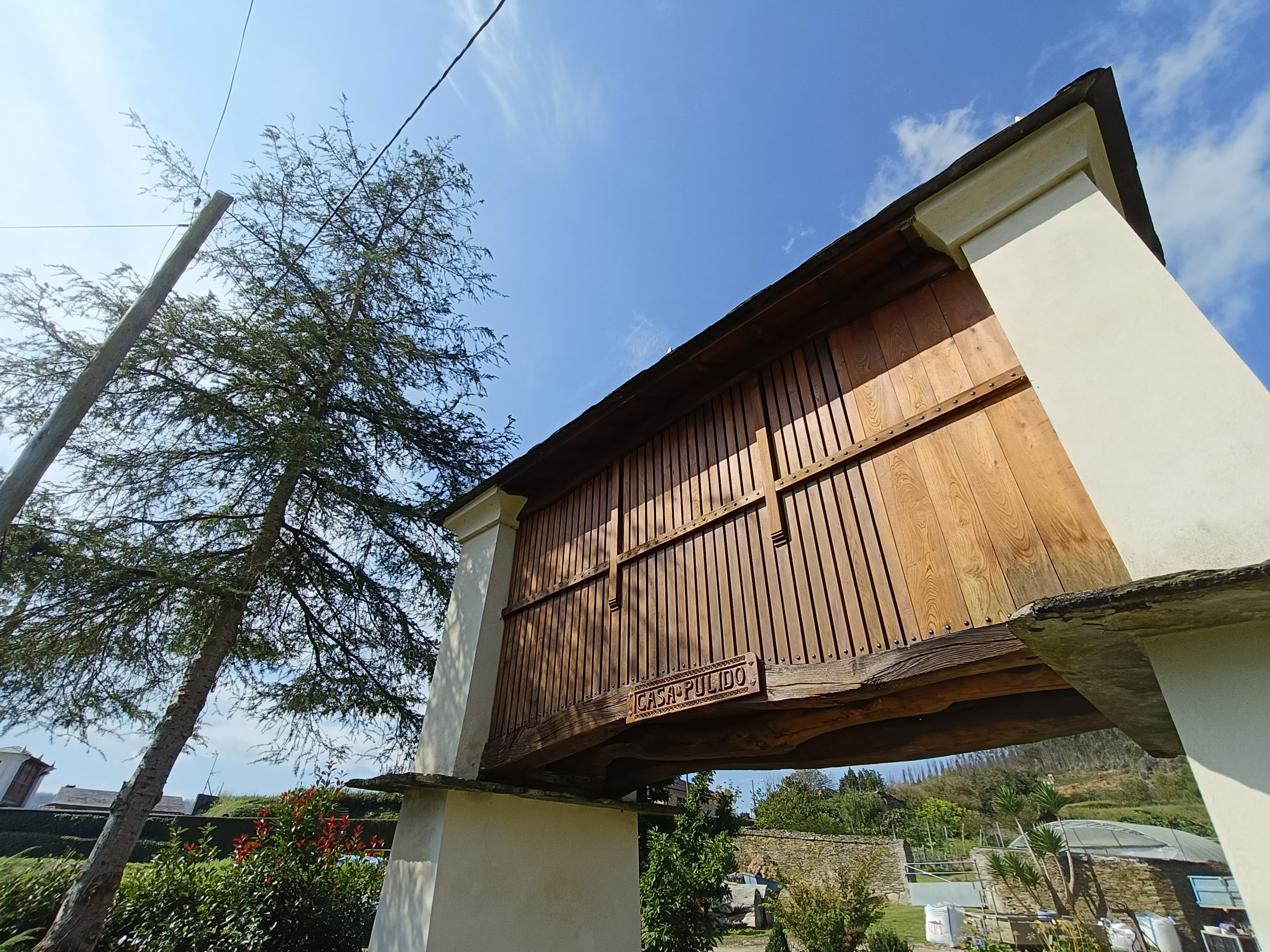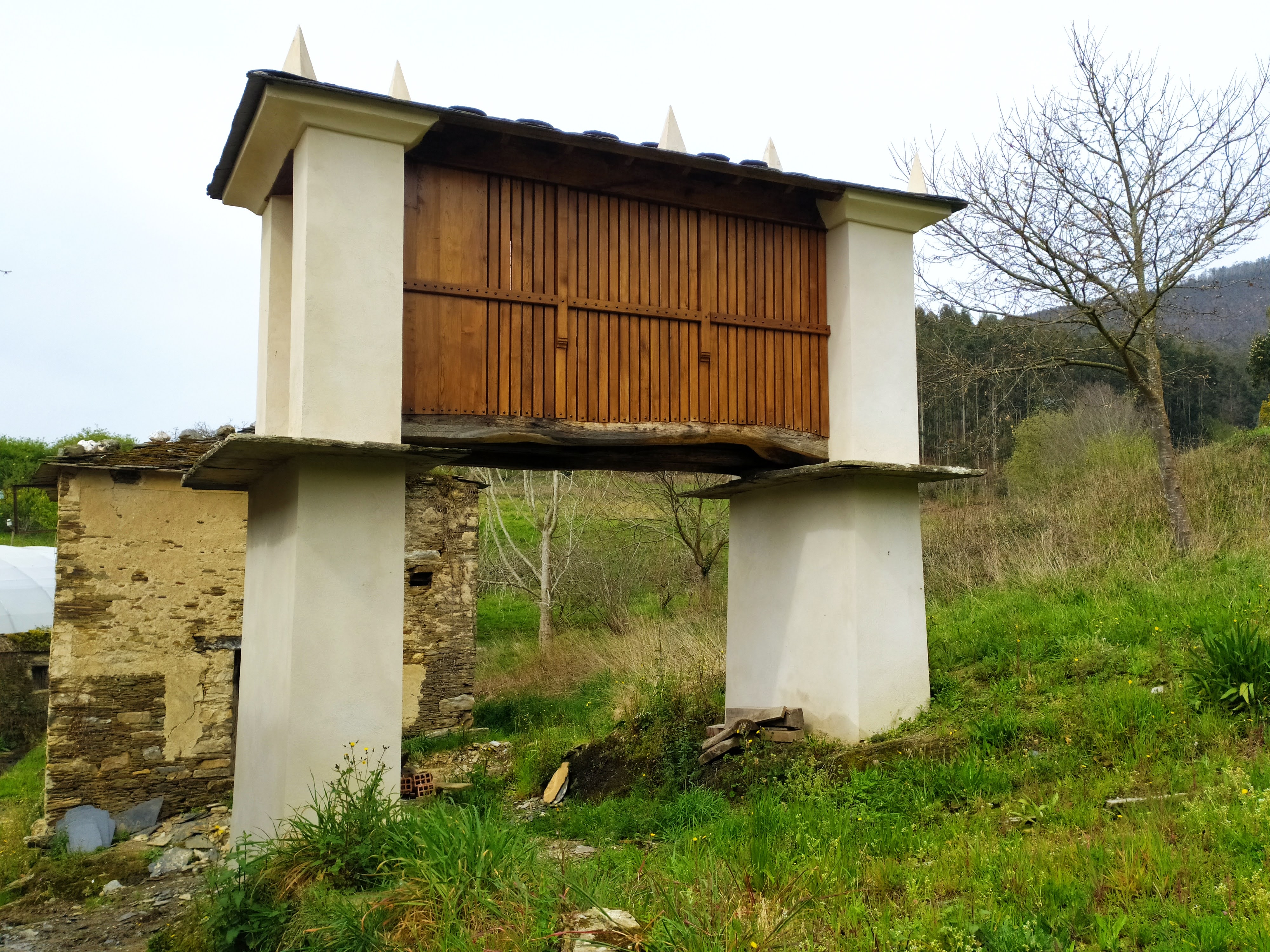 Se trata de dos hórreos situados en las inmediaciones de una casa de arquitectura tradicional, en un entorno protegido próximo al Camino de Santiago, una zona enmarcada por el paso de un riachuelo. Son de tipo Mondoñedo, una tipología de hórreos típica de la Mariña lucense y se encontraban en muy mal estado de conservación. Sabíamos que el promotor tenía intención de rehabilitarlos. Así que al publicarse las ayudas de la Xunta para actuaciones de mejora paisajística en el Camino de Santiago, le propusimos encargarnos de preparar la documentación y solicitar la subvención, que finalmente le concedieron cubriendo gran parte del coste de la obra. Hicimos un levantamiento y medición del estado actual, valorando qué elementos se podían conservar, y cuáles había que sustituir o reponer. Todo esto fue detallado en el proyecto, para cada uno de los hórreos. La obra consistió en la reparación y consolidación de los elementos dañados, y la reposición de los que estaban muy deteriorados o ya desaparecidos. En la obra fuimos verificando todos estos detalles. Se mantuvieron las características constructivas originales, y se usaron los materiales y las técnicas tradicionales: cubierta de pizarra irregular, apoyos (cepas y penales) de mampostería de esquisto, revestimientos con morteros de cal, cámara y puerta con madera de castaño. Como se puede ver en las fotografías, la obra supuso una mejora paisajística importante del entorno.