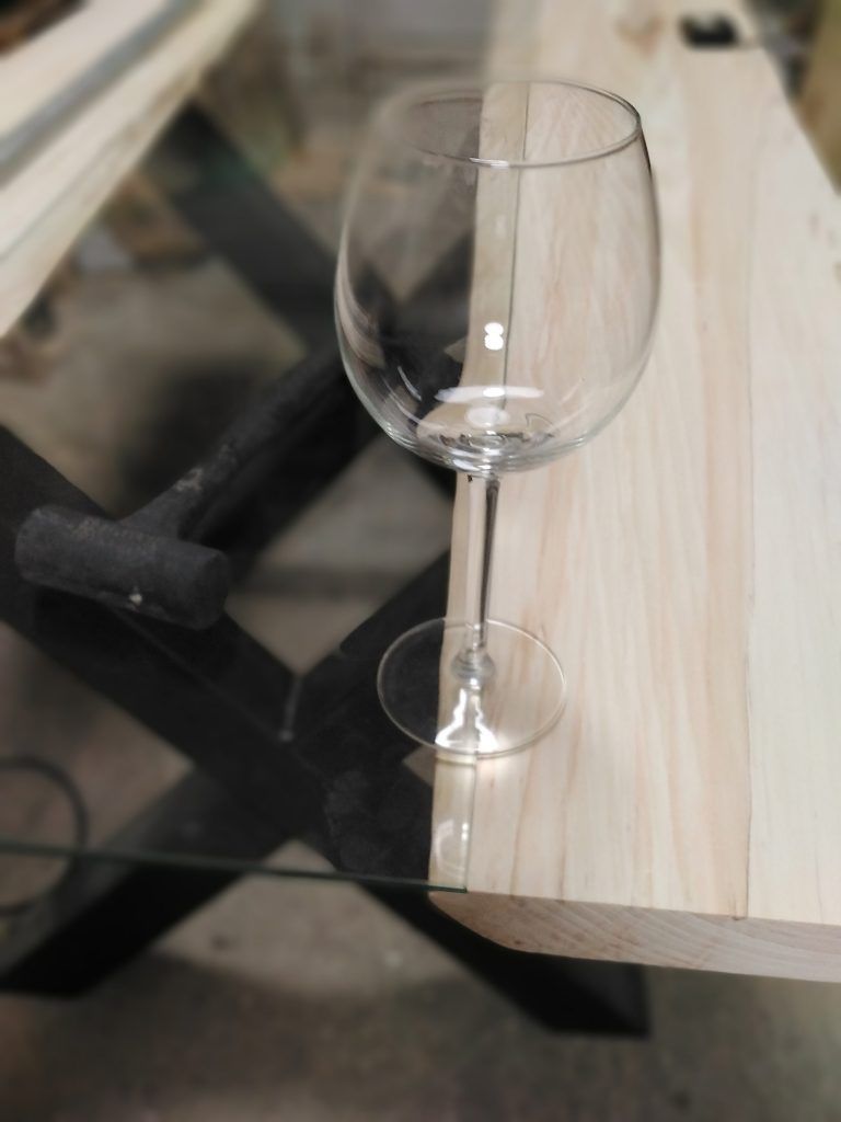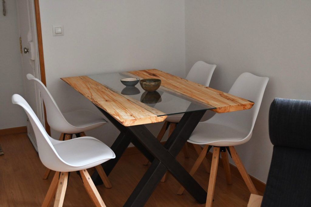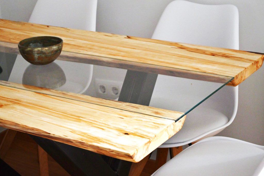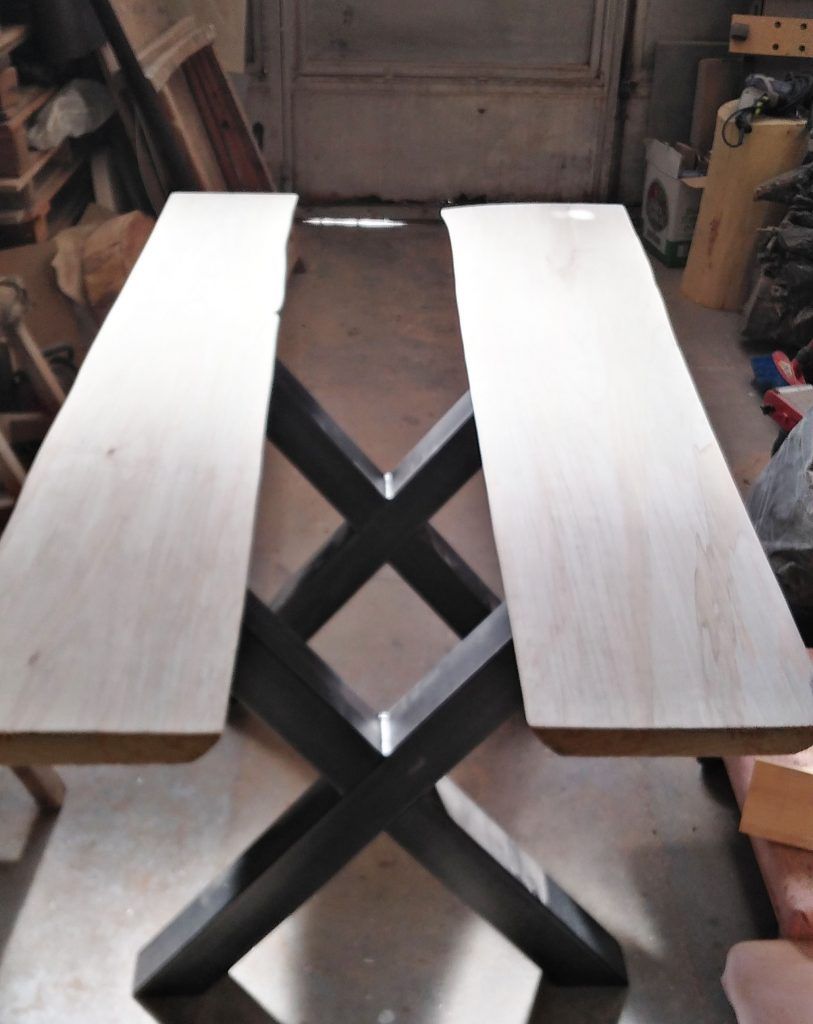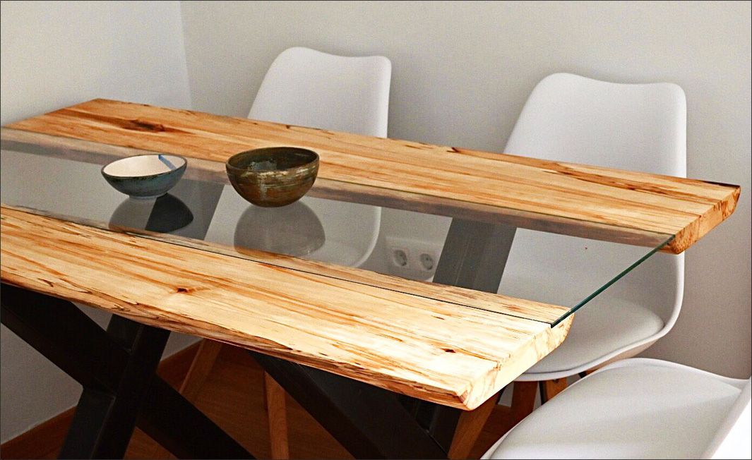Encargo ejecutivo de mesa de diseño contemporáneo -hecha a medida-, en madera de álamo de Finlandia. (145x83x75h cms) Proyecto comisionado por ese raro y maravilloso tipo de cliente con la idea perfectamente clara y estudiada para concentrar la energía solo en la realización, y llevado a cabo en estrecha colaboración y comunicación durante su desarrollo. Estructura de acero en acabado pavonado, en la tendencia actual de las mesas llamadas “river table live edge” completada por tapa compuesta de 2 tablas de álamo de Finlandia (Populus tremula), aunadas por cristal de 3+3 mm laminado de seguridad, encajado a ras perfecto de la madera. El encaje de las pletinas de apoyo por debajo de las tablas unidas por tornillos con tuerca empotrada, le han dado una solidez increíble. (en un principio tenía mis dudas, pero se despejaron solas). Este detalle constructivo, permitirà además el desmontar la mesa decenas de veces sin perder su solidez. Esta madera ha resultado ser una de las maderas más agradecidas que he podido trabajar, maleable y homogénea, que entre la veta y las características marcas dejadas por los inocuos hongos cromógenos (Hongo spalted), surgidas después del cepillado y calibrado, la muestran en toda su espectacularidad. Después de su acabado final, -exclusivamente a base de aceite de Tung-, le ha proporcionado su tono natural multicolor desde tonos arena y ocre a los intensos rosas asalmonados mezclados por hilos finos de decenas de marrones intensos, dotandola a mi juicio de una feminidad y calidez impresionante.