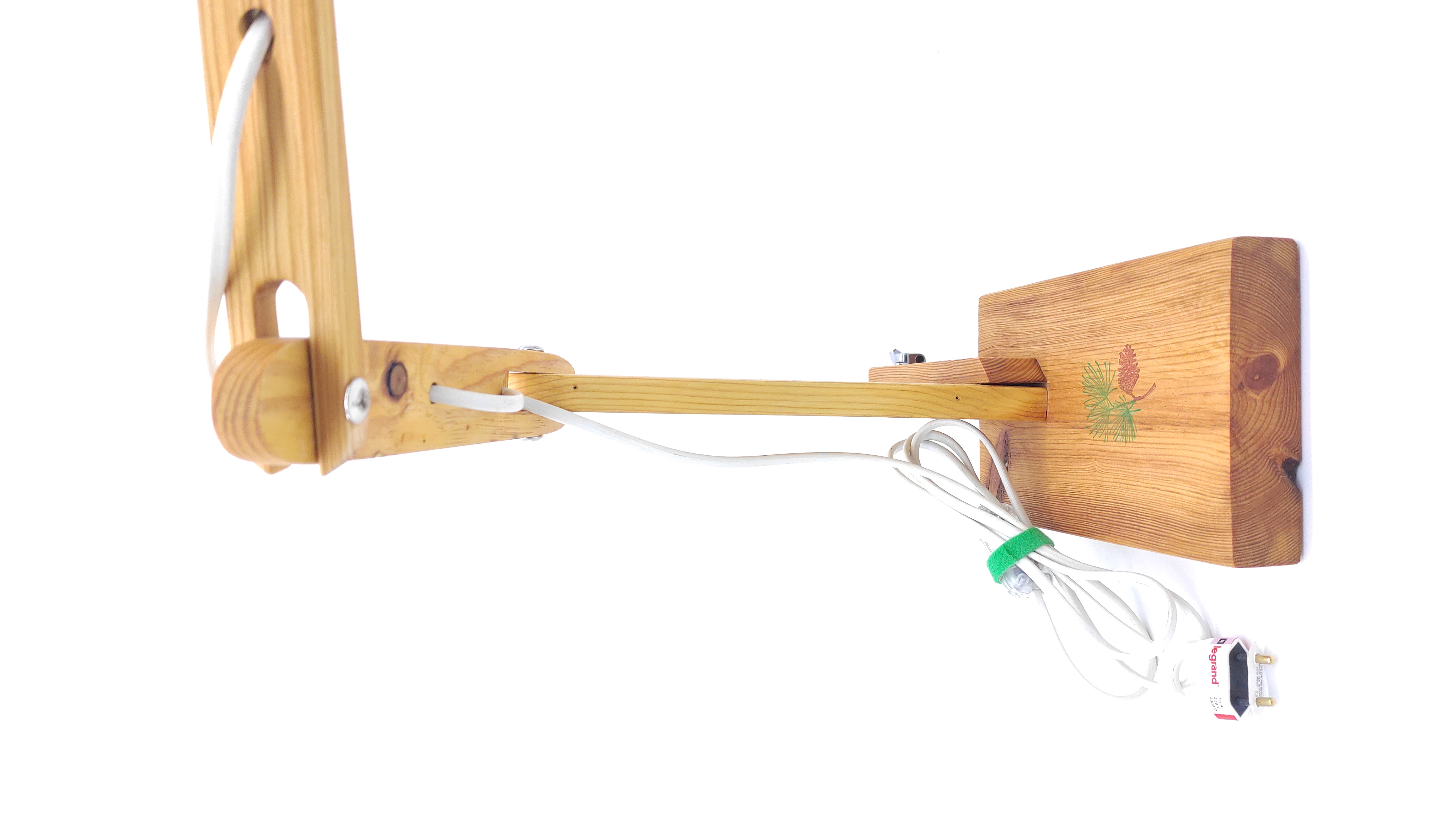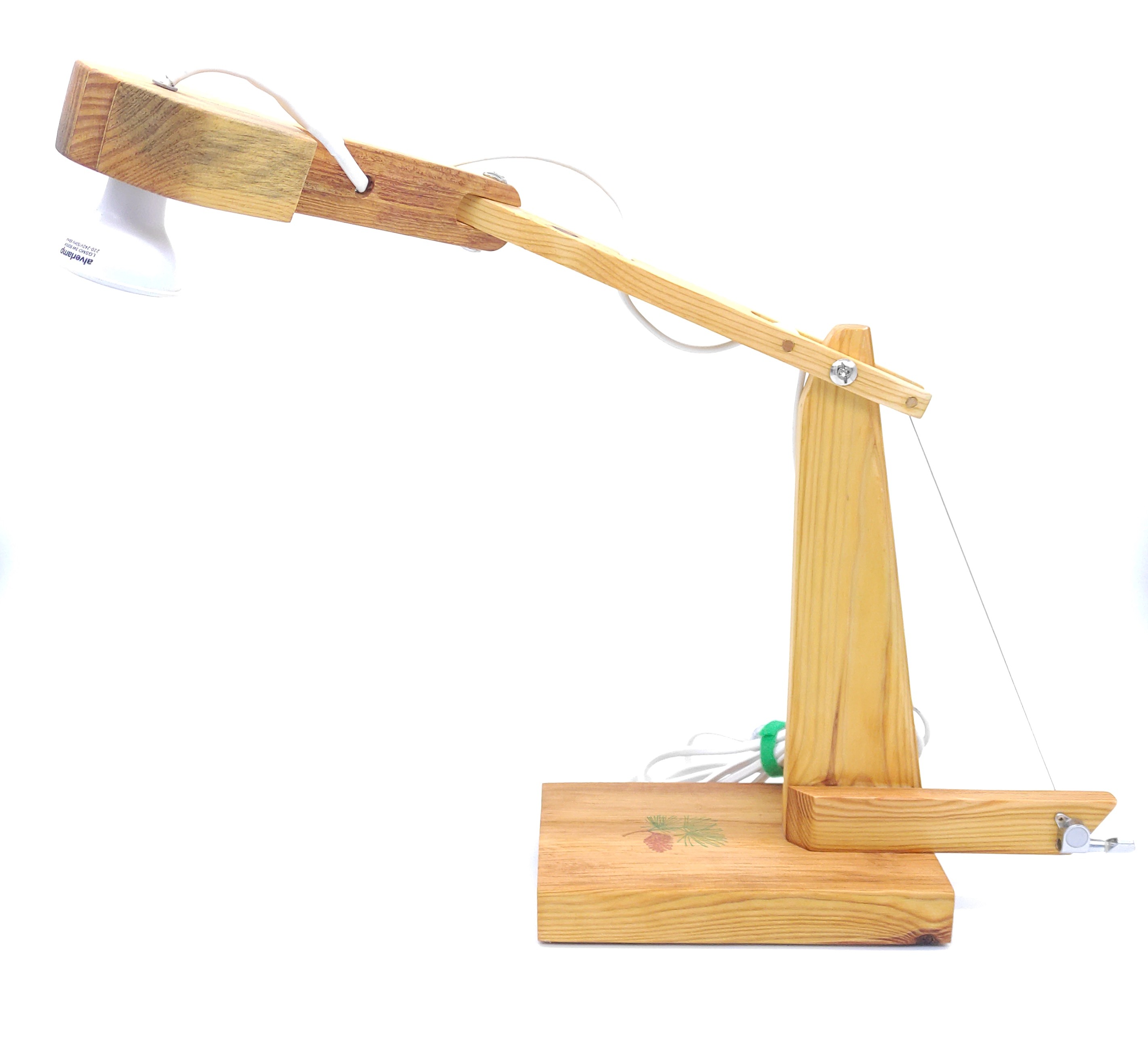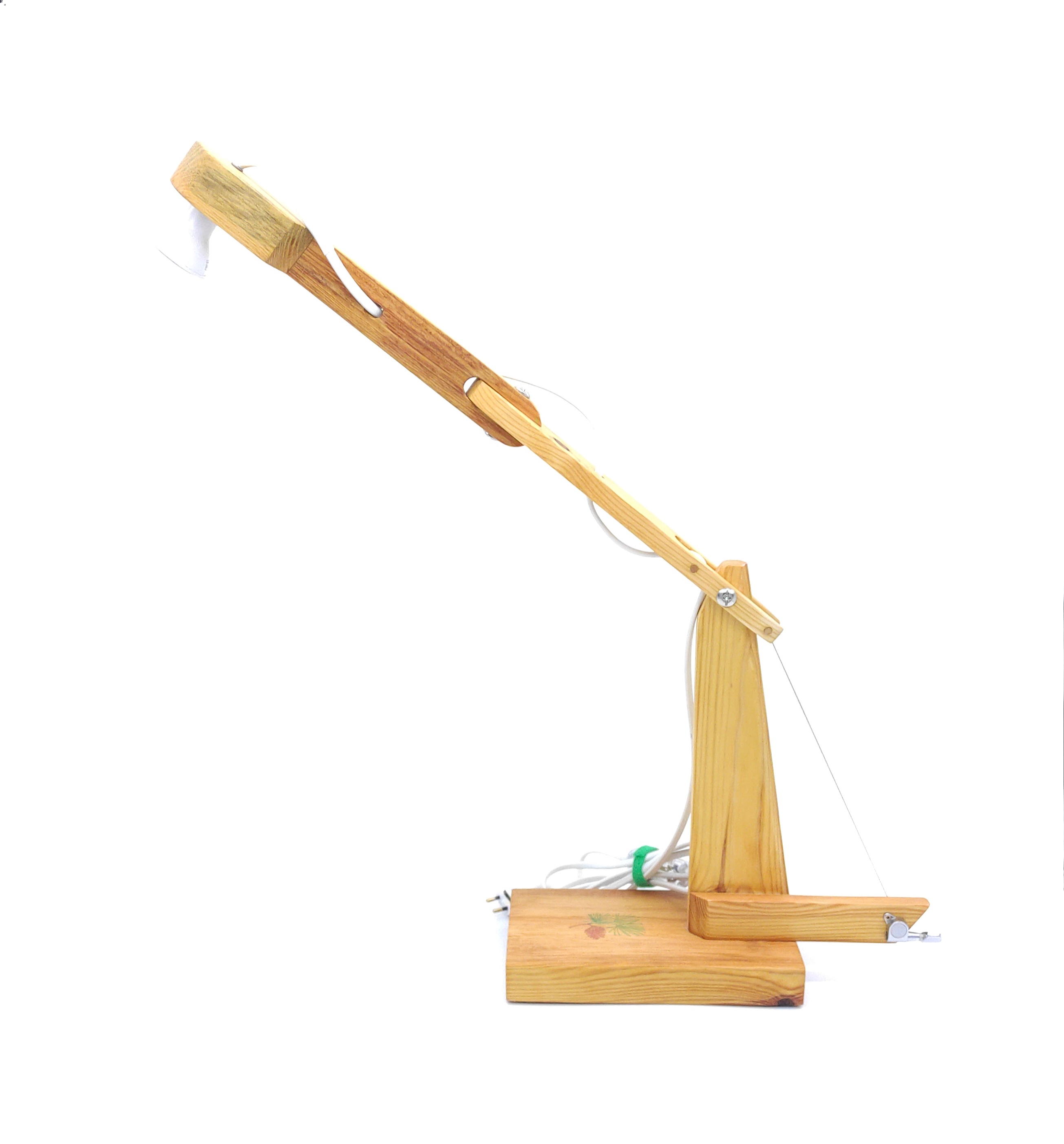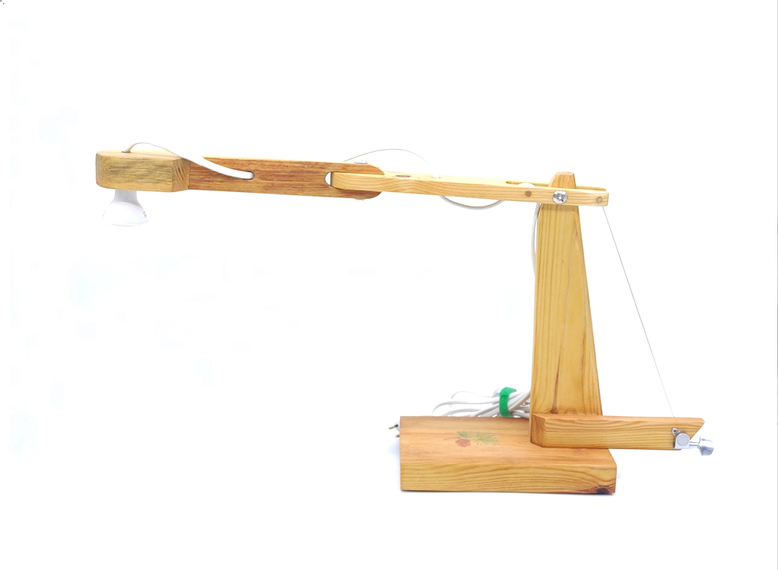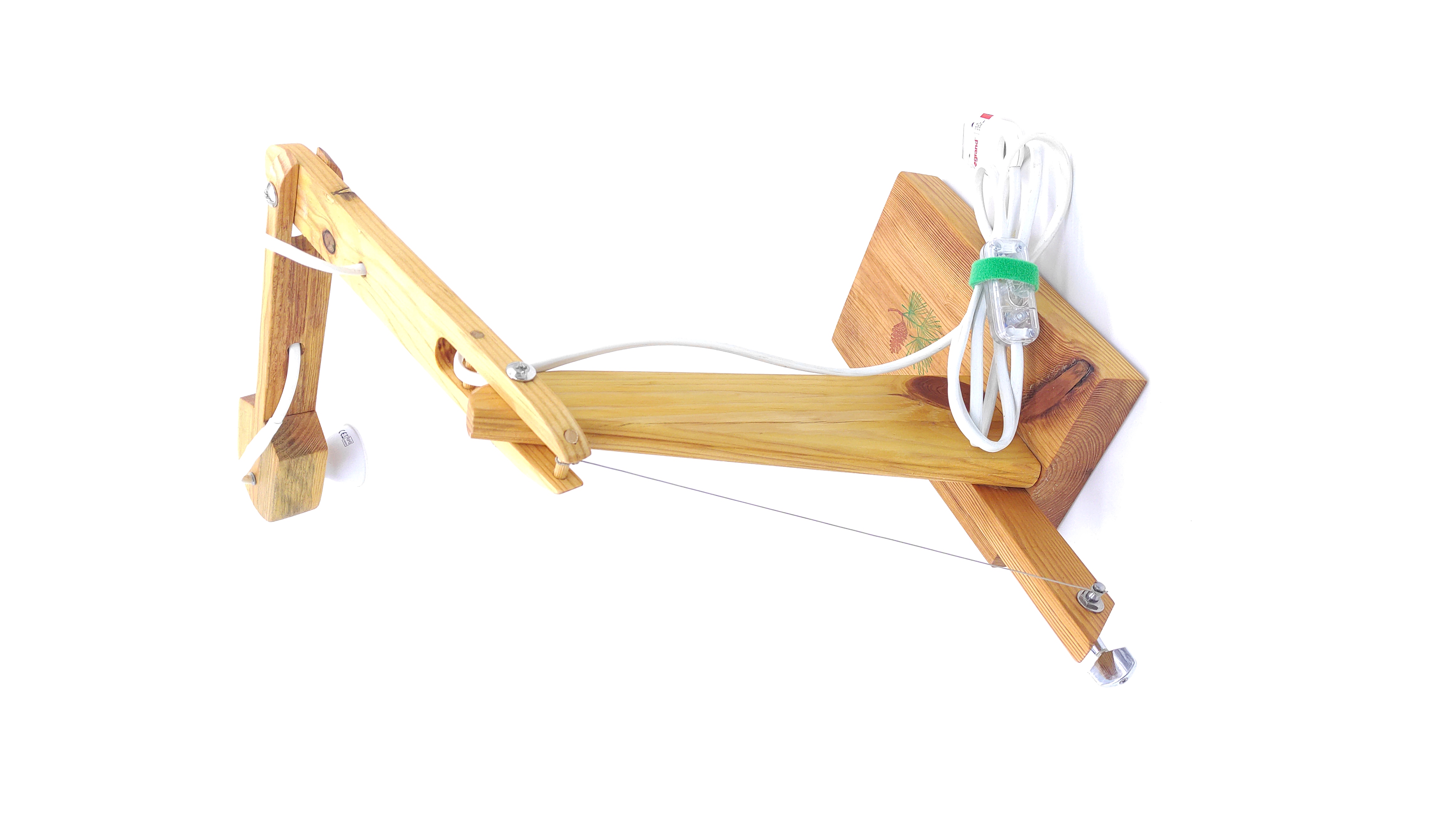 Flexo elaborado con madera de pino procedente de viejos palets. Cómo característica distintiva, la primera articulación se regula gracias a una clavija de guitarra instalada en la parte inferior posterior, cuyo cable tensor es una cuerda de guitarra. El segundo brazo se regula de izquierda a derecha, rompiendo el clásico esquema de diseño de los flexos. Preparado para albergar bombilla Led.