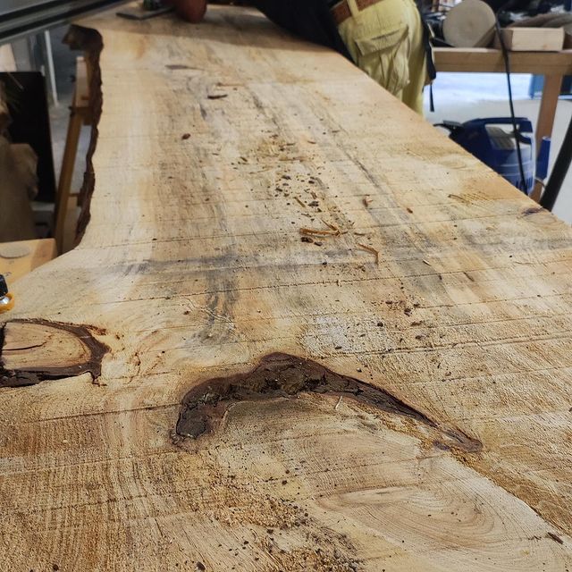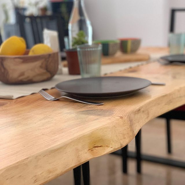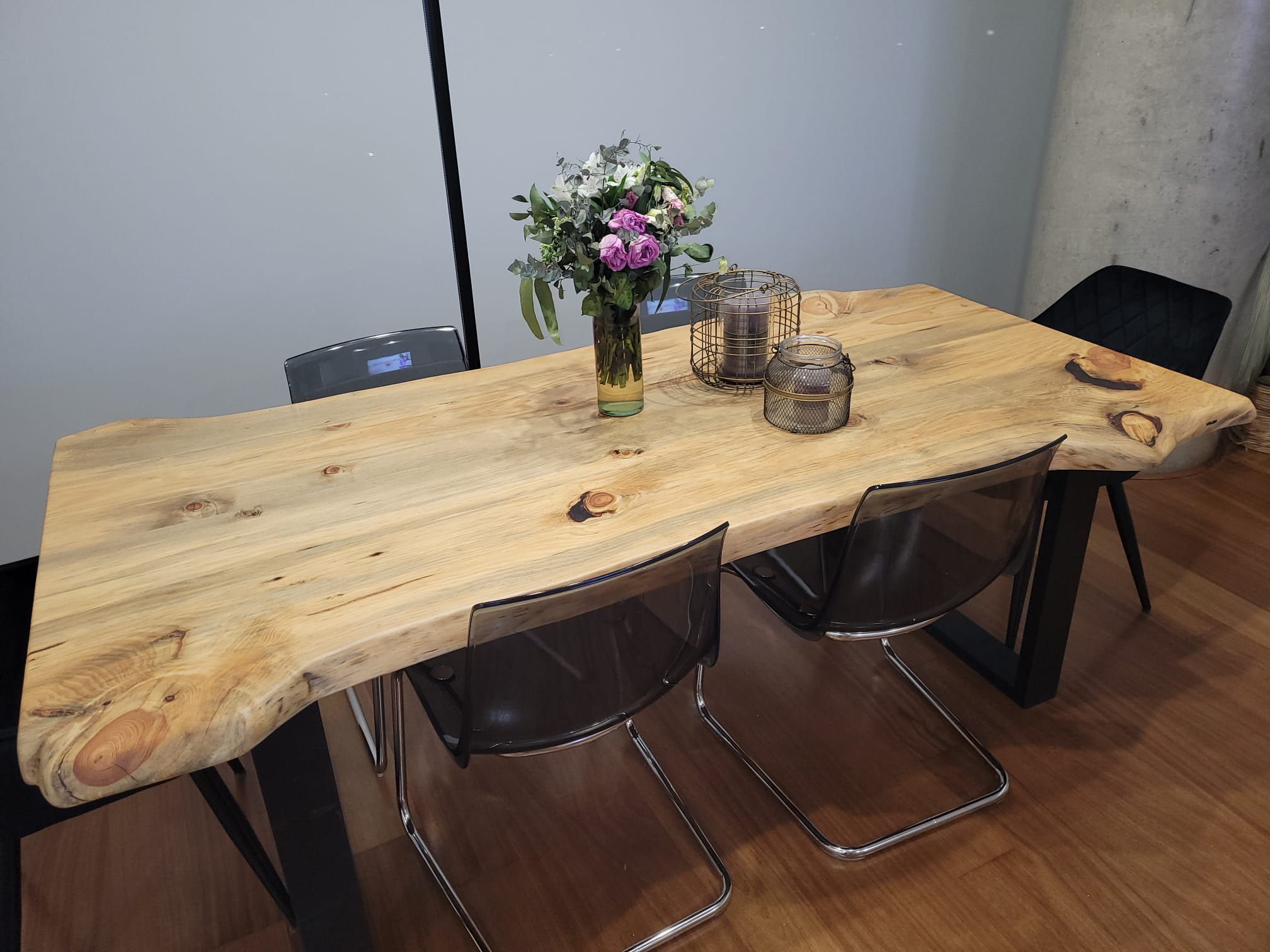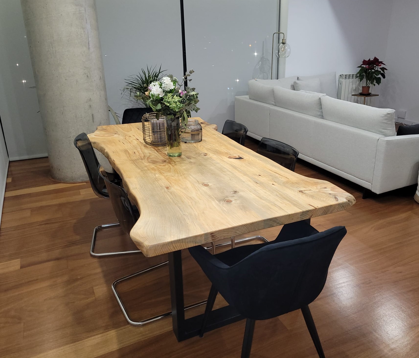 Diseño elegante, cuidado al mínimo detalle y trabajado con todo el cariño. Es madera de pino, una madera duradera y resistente, ideal para mesas de interior. Además, su apariencia natural con tonos cálidos y nudos atractivos le otorgan un encanto rústico. Es una elección popular para mesas que combinan funcionalidad y estética. En la imagen dos y tres podéis observar el antes y después de la madera. Cada pieza cuenta su propia historia a través de sus nudos y vetas únicos, creando una obra de arte que no se puede replicar.