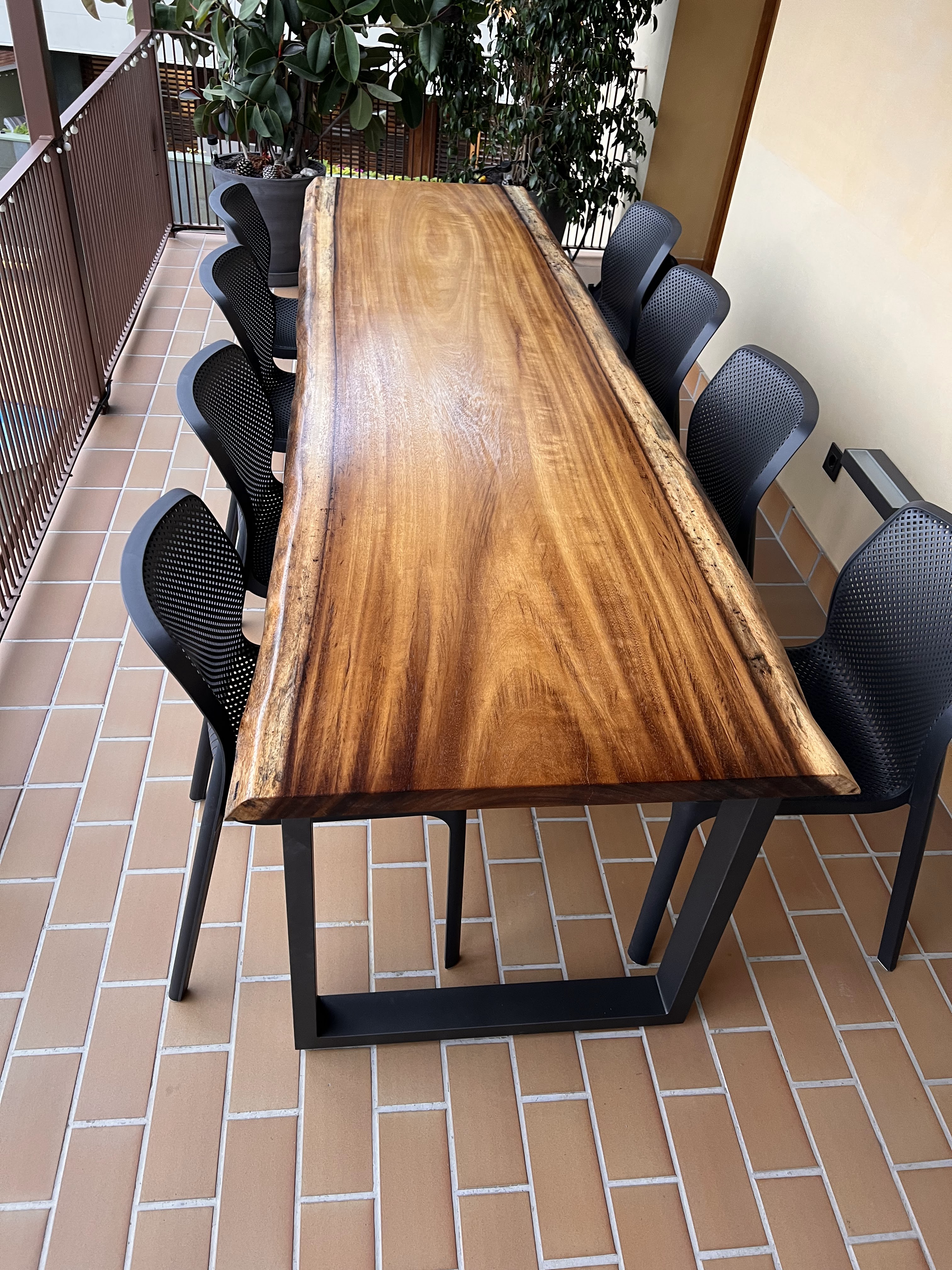Mesa elegante fabricada con madera tropical. Buscamos ofrecer durabilidad y ese aspecto natural que tanto deseas. Nuestras mesas están hechas para resistir el paso del tiempo y realzar la belleza de tu espacio. Estos clientes han logrado hacer su sueño realidad con esta exclusividad de mesa para su hogar, donde puedan celebrar con su familia y amigos las noches de verano. Nosotros estamos muy felices de haber ayudado en este proyecto.