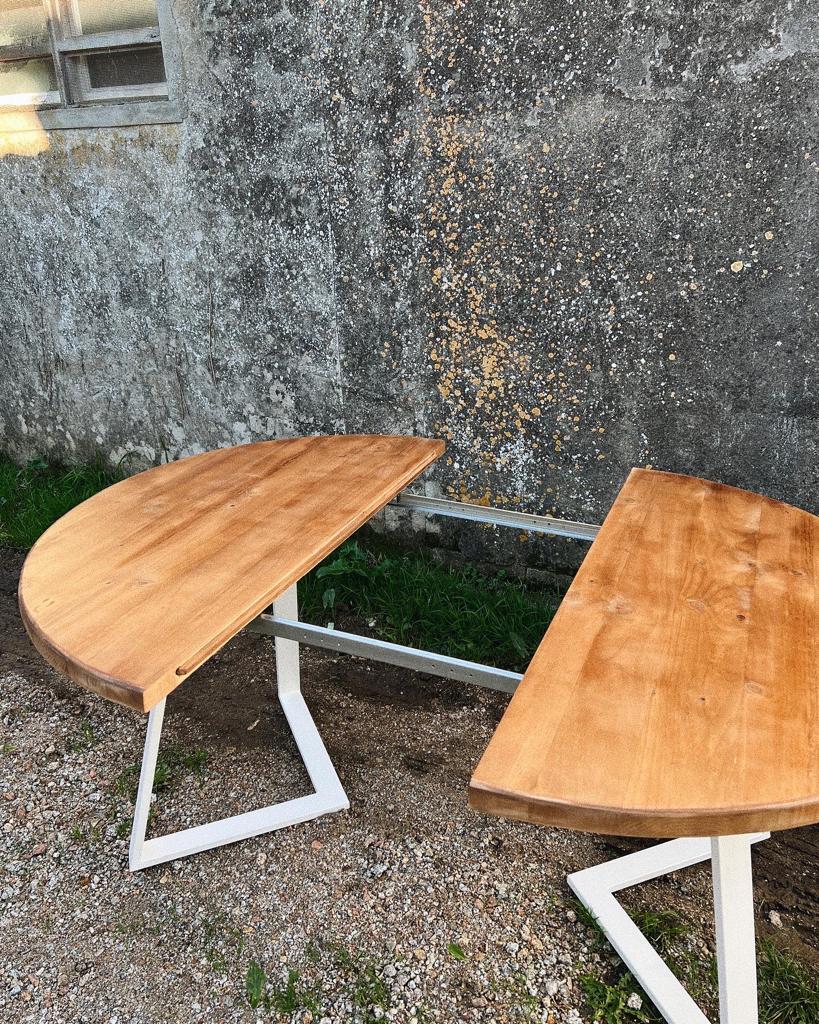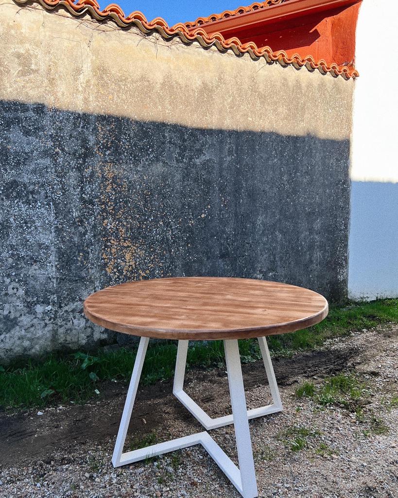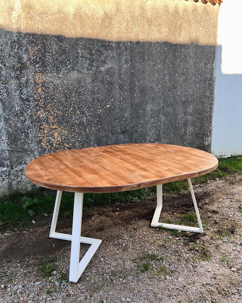 Se trata de una mesa de madera maciza y metal lacado. La madera utilizada en este caso es madera de pino. Se le aplican tratamientos y acabados propios para conseguir texturas y otorgar una personalidad especial. Las medidas de esta mesa pueden ir desde 110 a 140cm cerrada, con un añadido de 50cm.