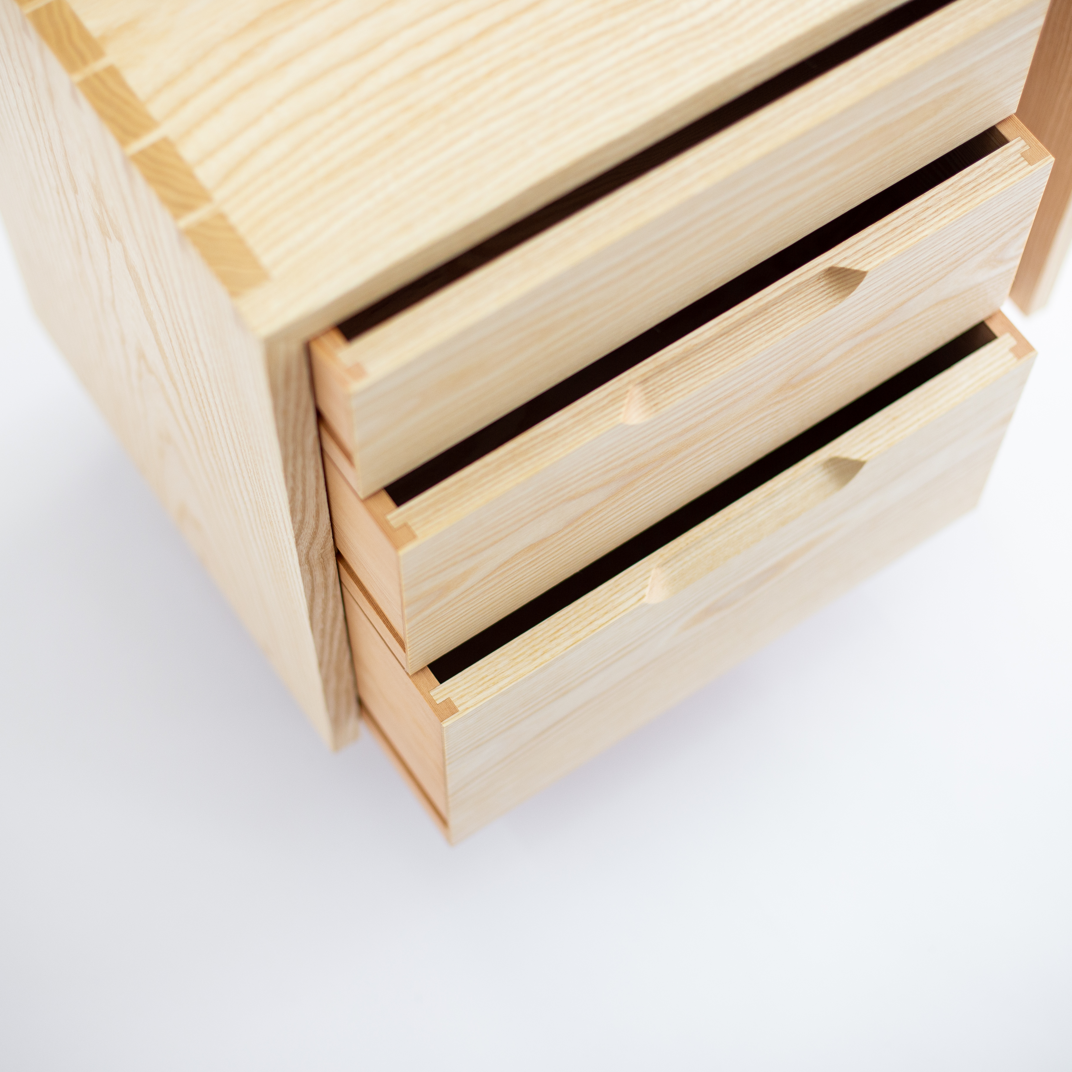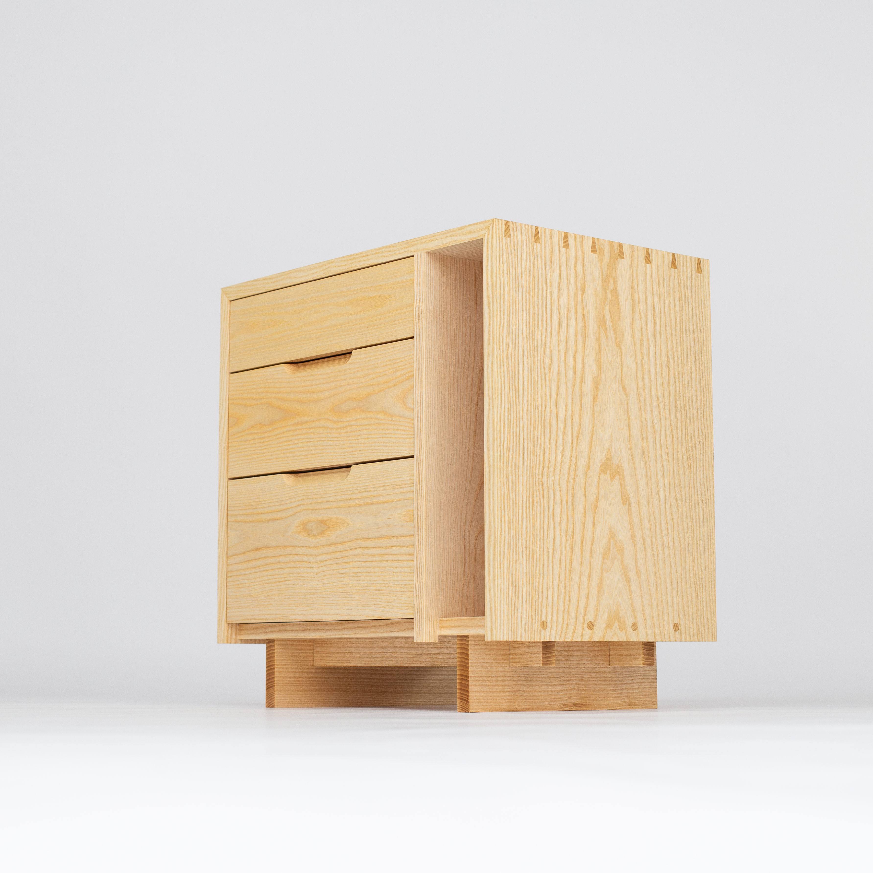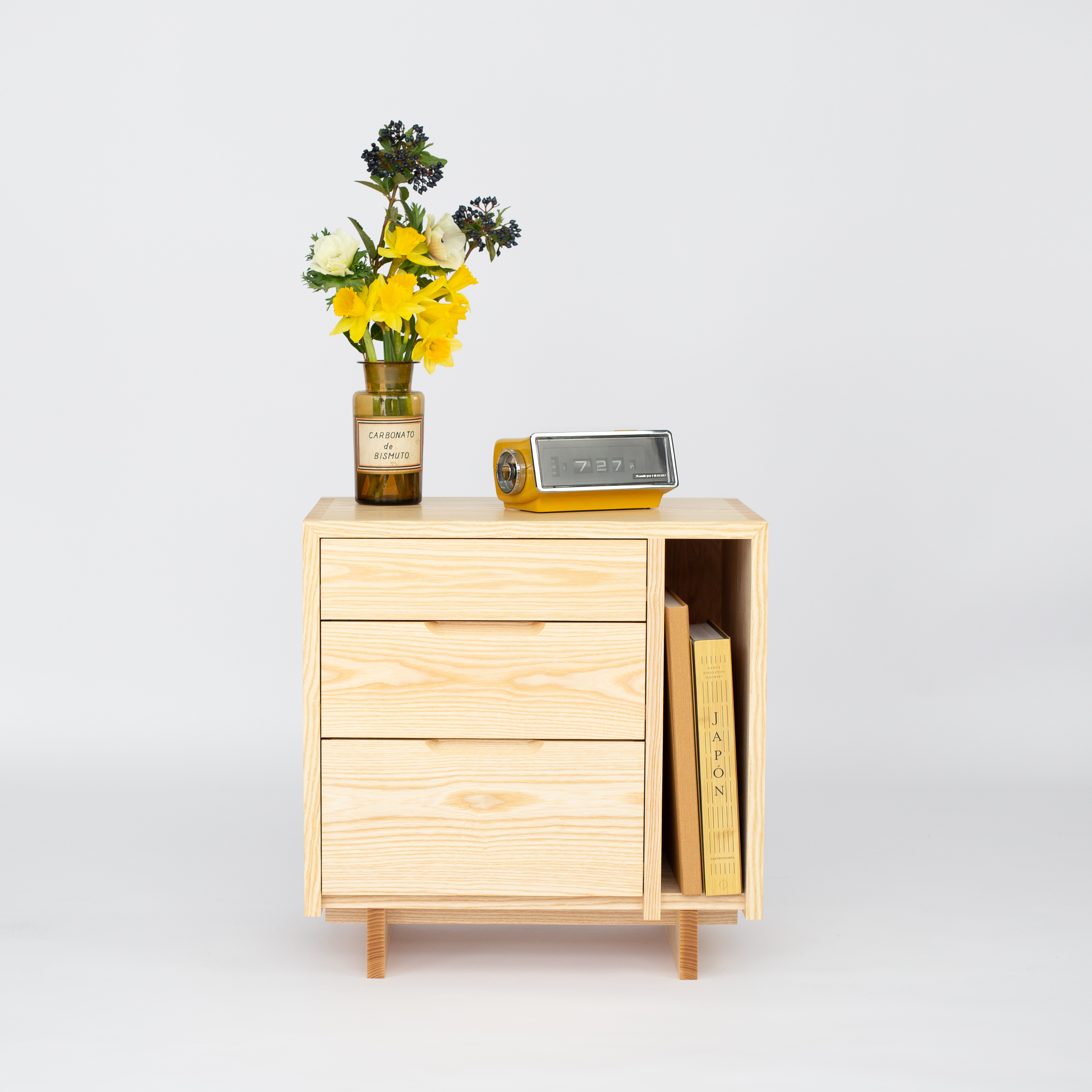 Una mesilla realizada con madera de fresno con tres cajones de apertura frontal y un estante lateral vertical.