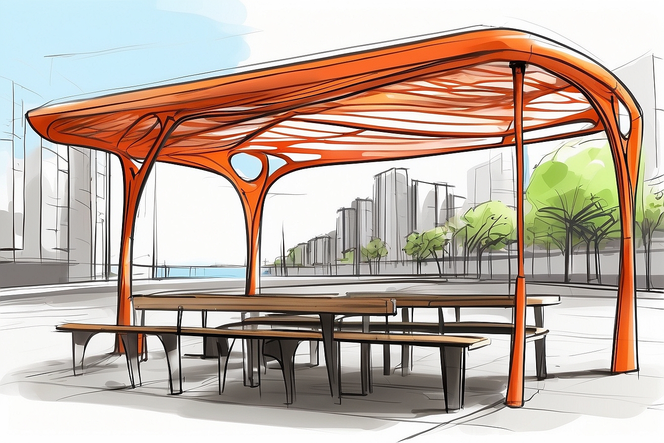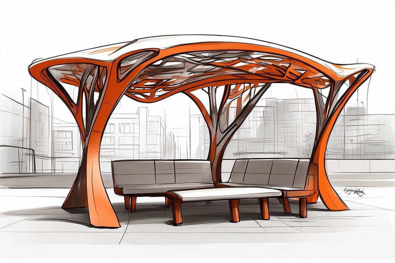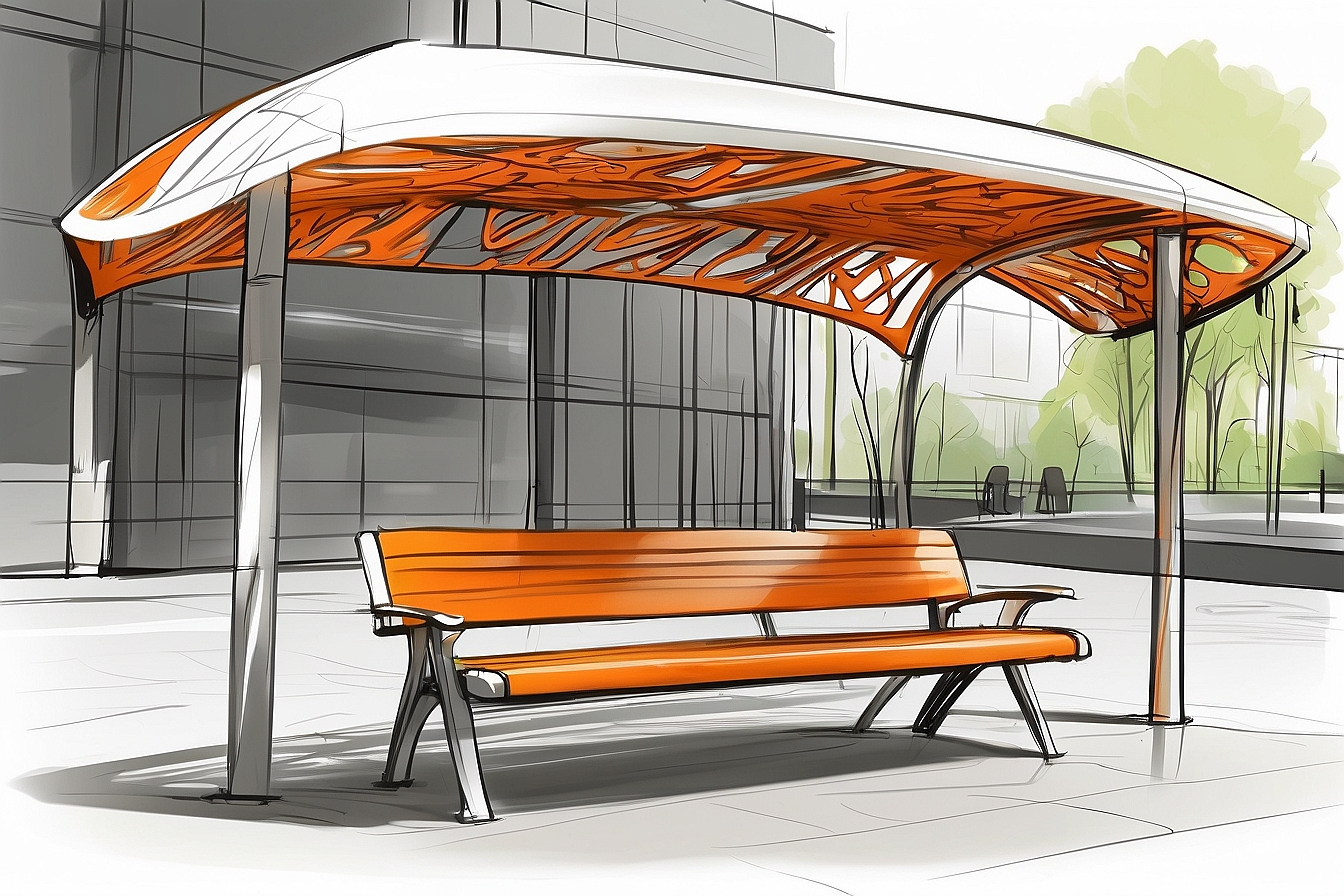 Pérgolas y elementos de mobiliario urbano, como bancos o marquesinas realizados en madera.