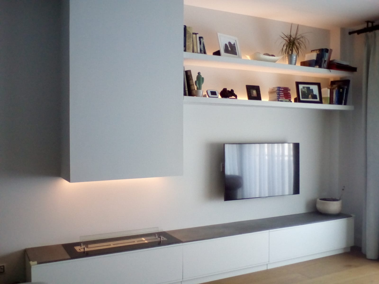 Diseñamos un mueble para contener una chimenea de bioetanol, acabado lacado blanco con sobre en micro cemento y zona superior en pladur.