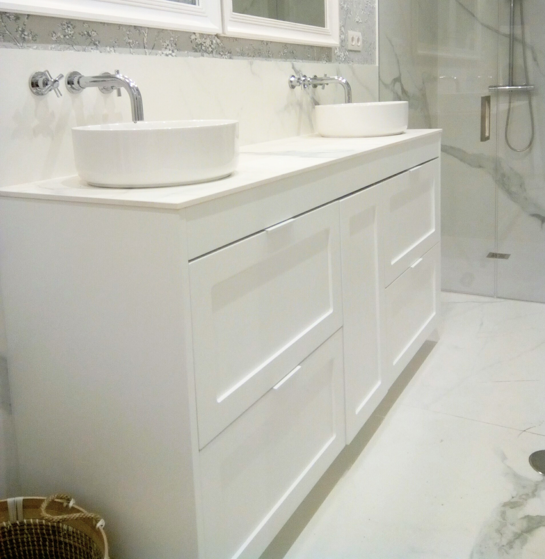 Mueble de baño a medida realizado en DM lacado en blanco, gran capacidad de almacenaje.
