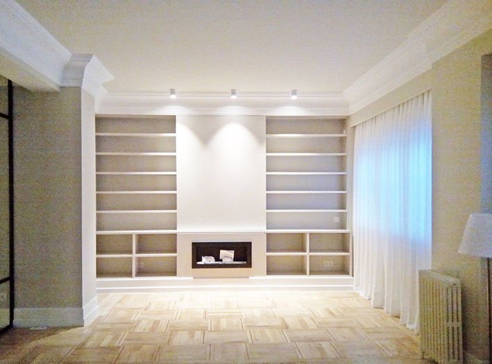 Mueble para salón con zona central con puerta corredera para ocultar la TV. Acabado lacado.