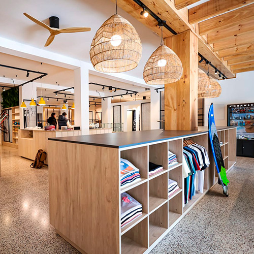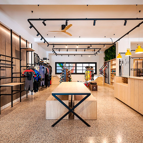 Nautilus Sports es una tienda que desde 1975 muestra su pasión por el mar asesorando y comercializando todo tipo de artículos relacionados con el mar, tales como windsurf, surf, SUP... Durante el proceso de reforma llevado a cabo en su tienda de Cambrils, equilan fabricó el equipamiento para exponer todos sus productos, tanto en madera como en metal: percheros perimetrales, mesas, góndolas, atención al cliente, etc.