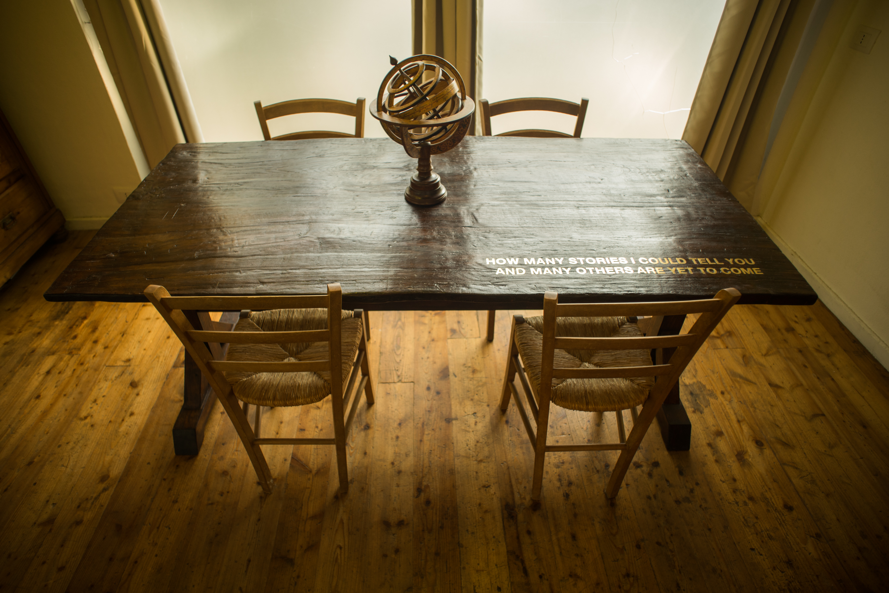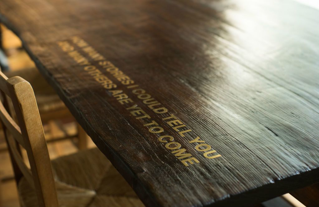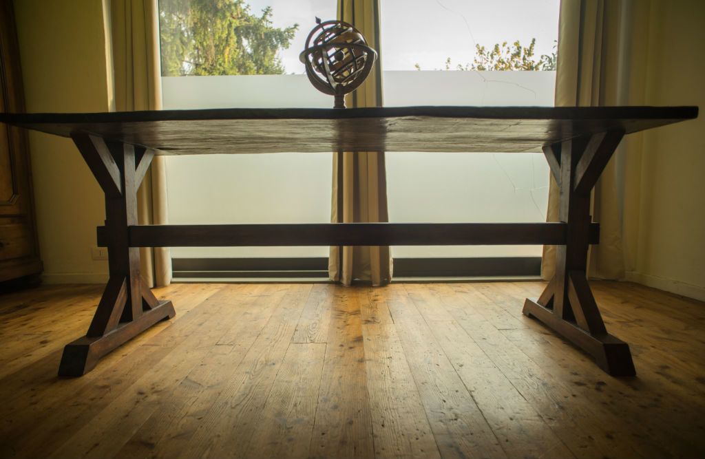 Interesante encargo realizado para M+F design de Milán, bajo estrecha colaboración, con el objetivo de combinar parte antigua y nueva de esta elegante y grande mesa, en un estilo culto y de otra época contrapuesta a la actual. La tapa -en su origen- una puerta de castaño de unos 150 años perteneciente a una leñera, ha sido restaurada magistralmente dejando su historia y personalidad intactas. La estructura inferior completamente nueva realizada con madera de roble secada 15 años, se ha construido con ensambles a caja y espiga como tradición de carpintería antigua manda, con un diseño de ligero gusto nórdico. Un acabado con cera hirviente y la aplicación modernista de un “lettering” muy adecuado a la pieza, completan este trabajo de grande belleza