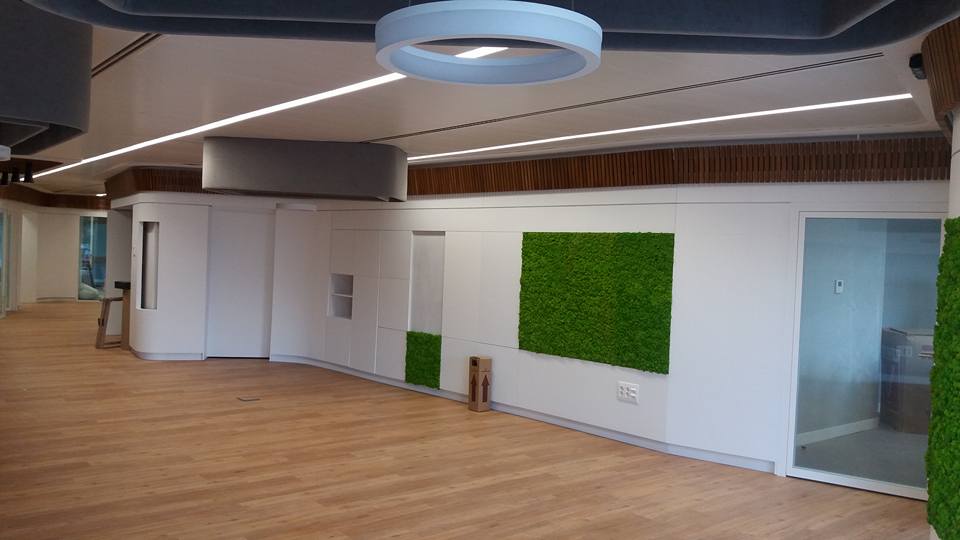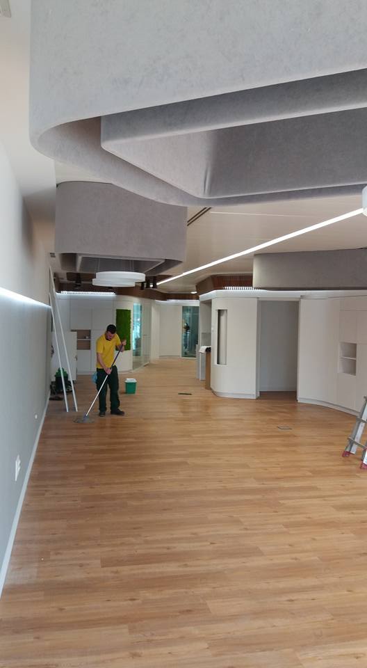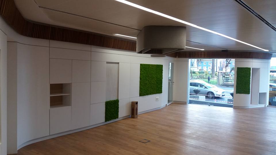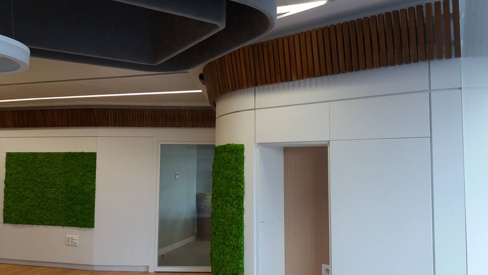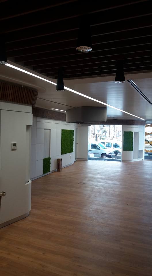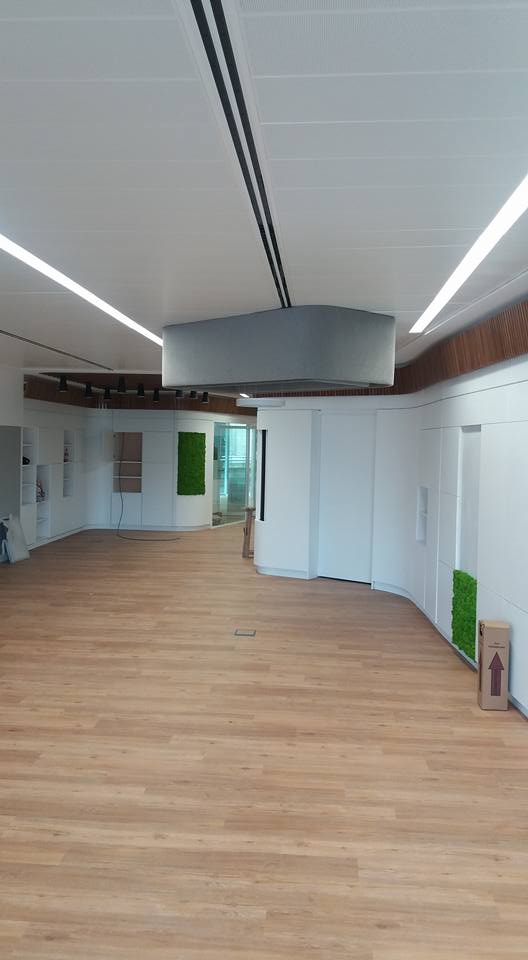 Oficinas de atención al cliente, creando una zona amplia de recepción comunicados con los distintos departamentos, divisiones realizadas mediante mobiliario integrando las puertas, armarios y tabique móvil. Destacar las lámparas realizadas mediante armazón tapizado y sistemas de duelas.