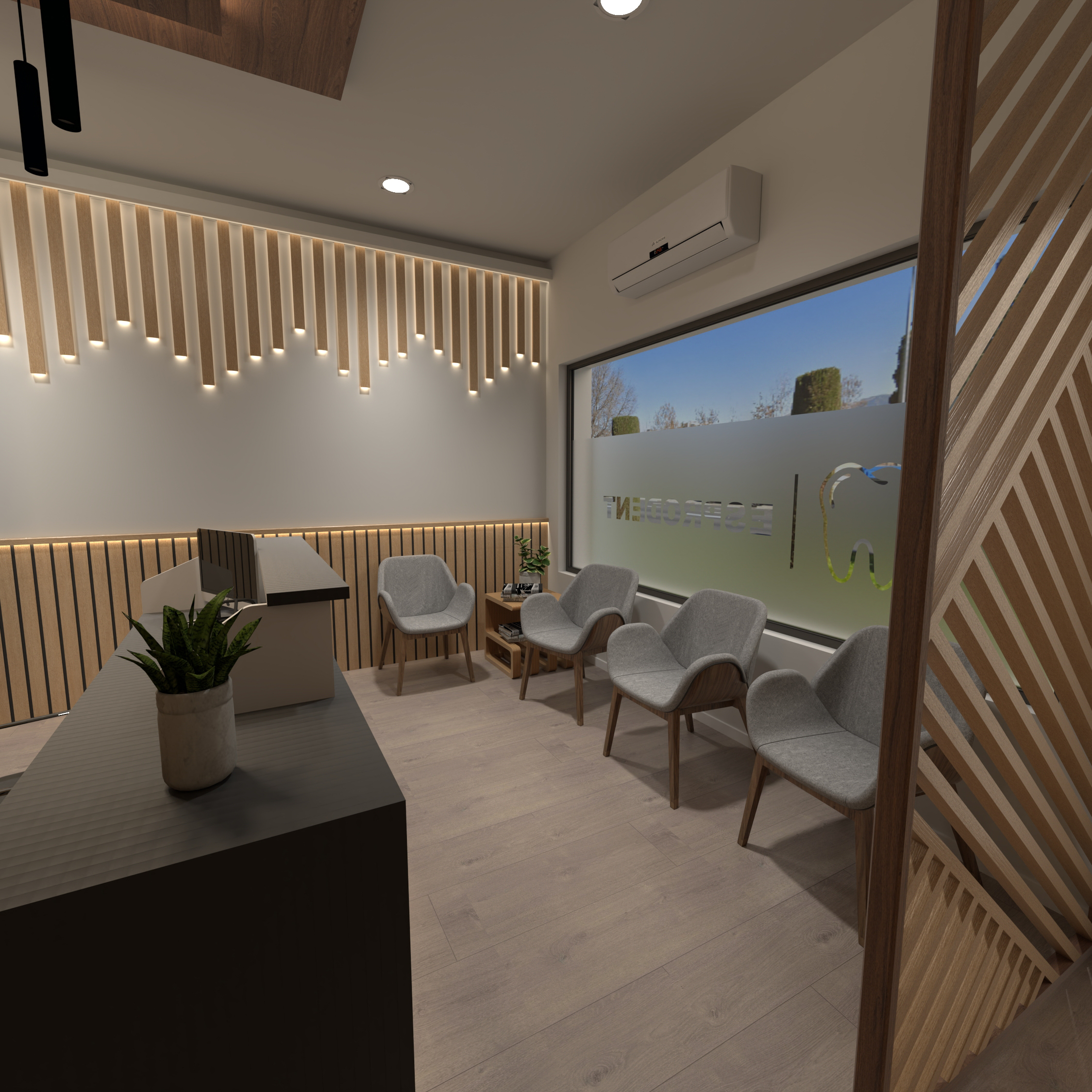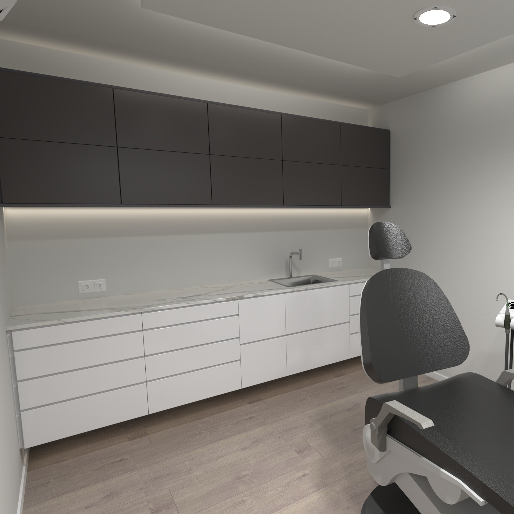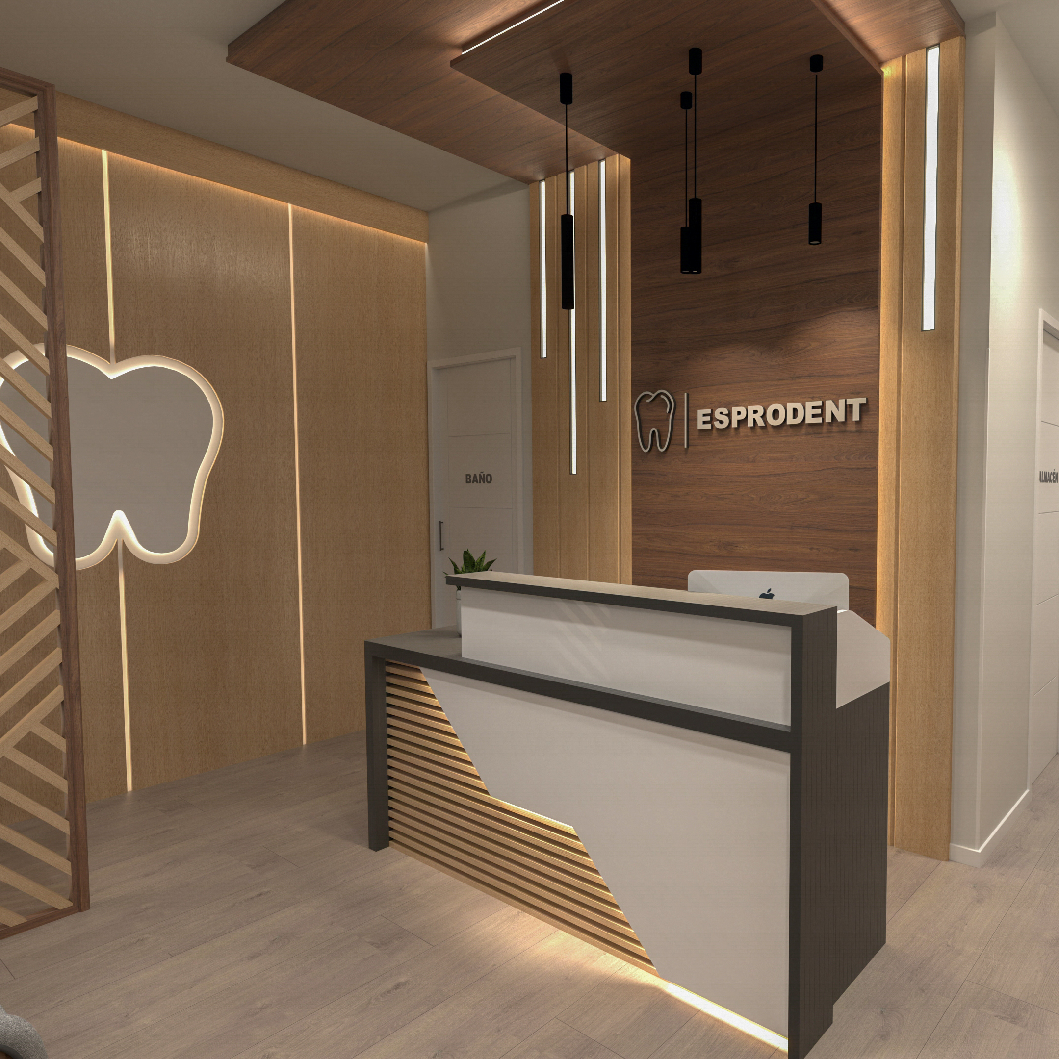 Propuesta de interiorismo para clínica dental. Incluye la instalación de suelo, puertas y revestimientos de pared y techo, además de la fabricación del mobiliario e instalación de la cocina.
