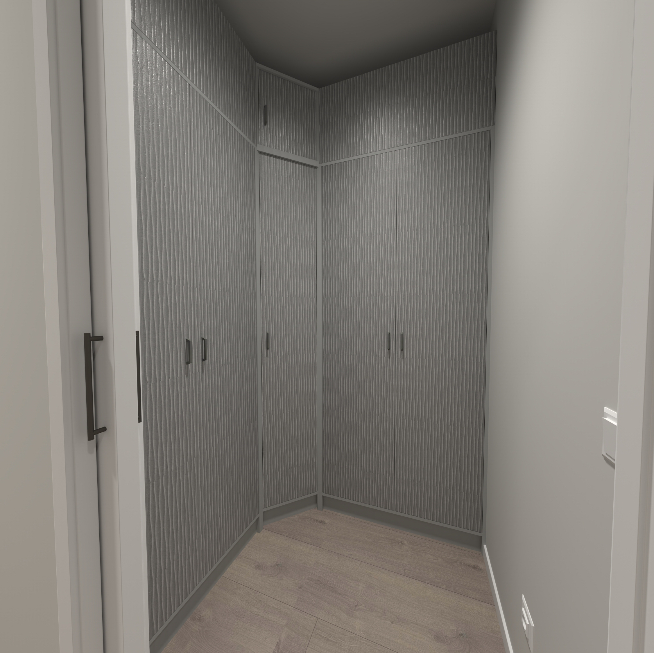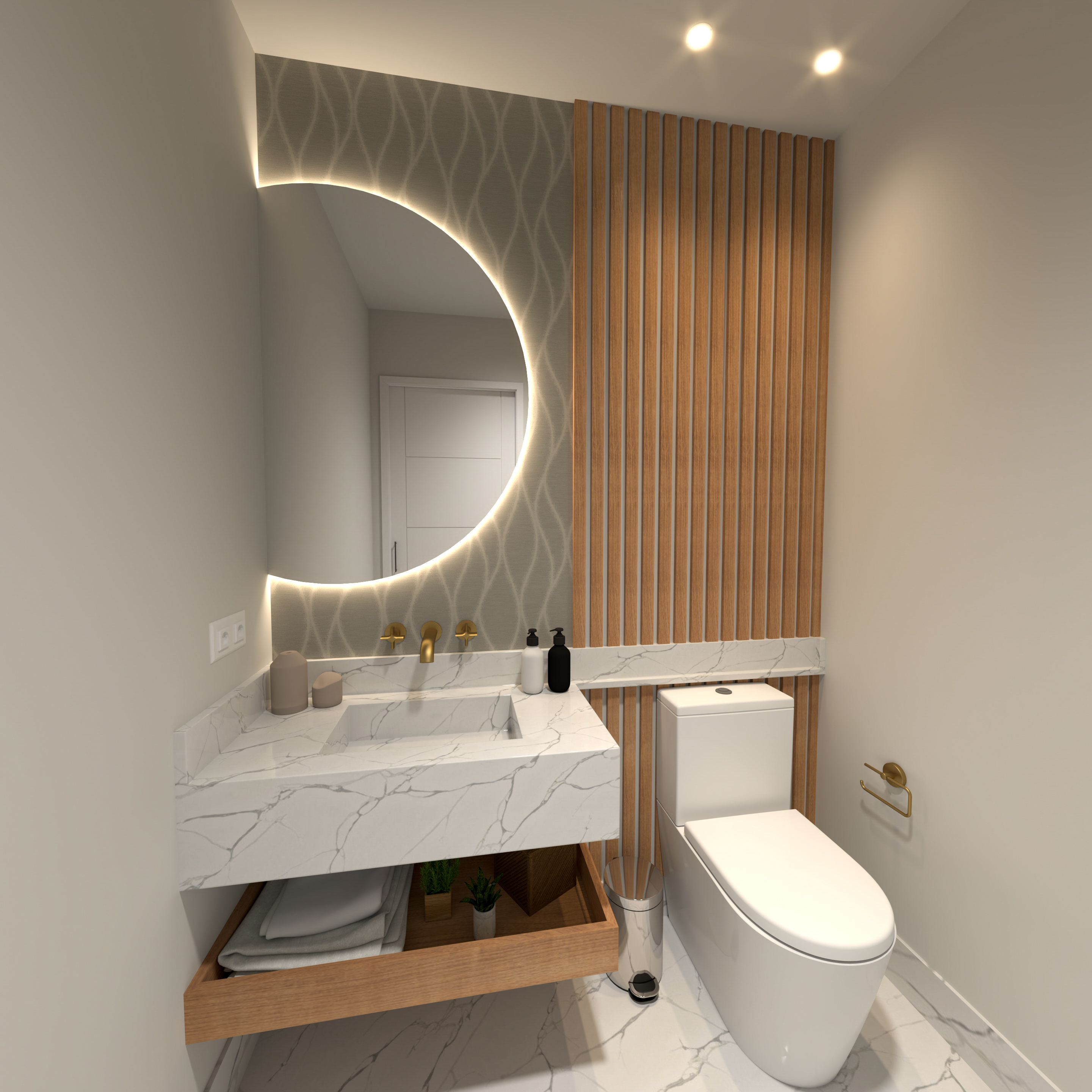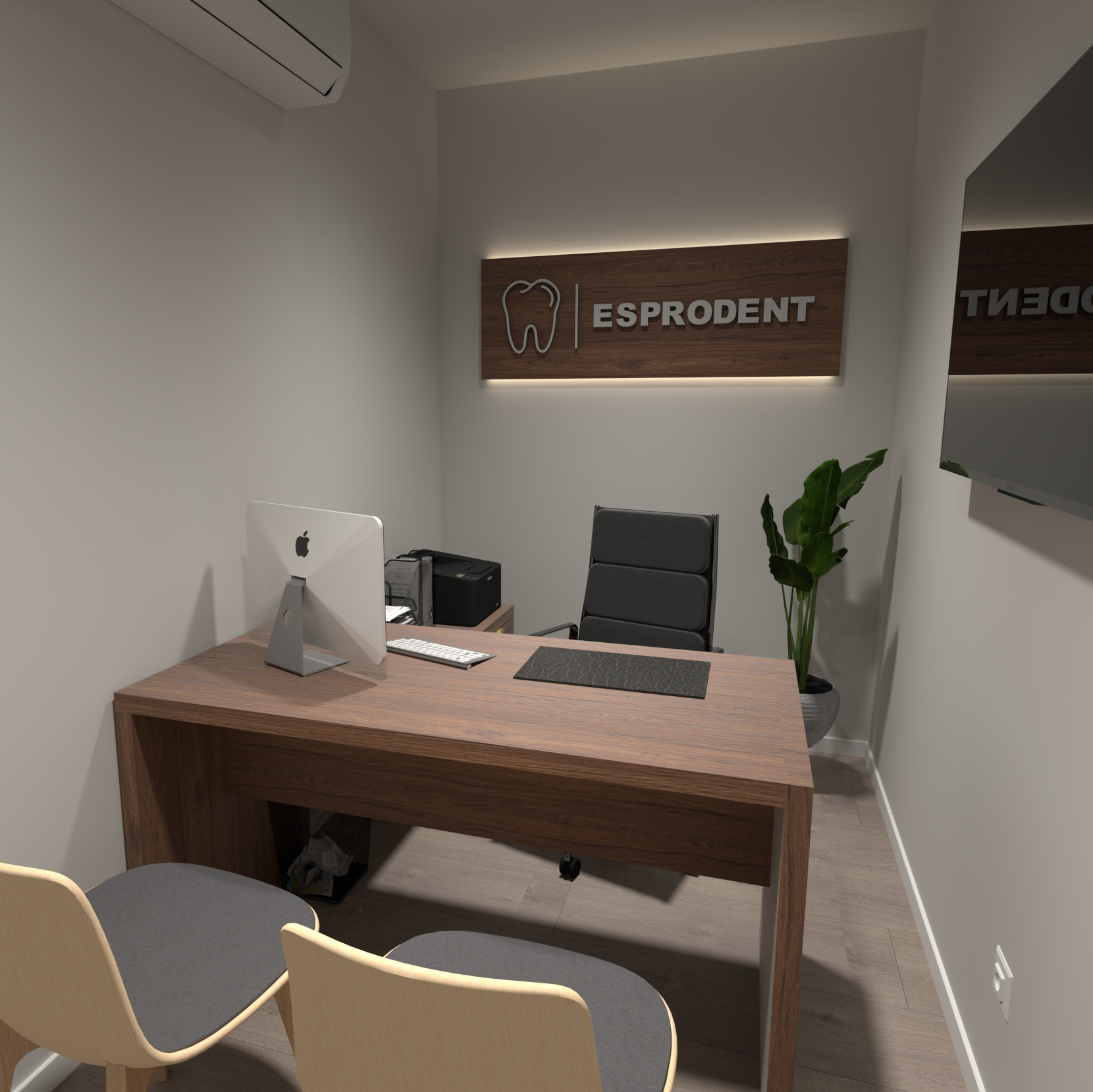 Propuesta de interiorismo para clínica dental. Incluye la instalación de suelo, puertas y revestimientos de pared y techo, además de la fabricación del mobiliario e instalación de la cocina.