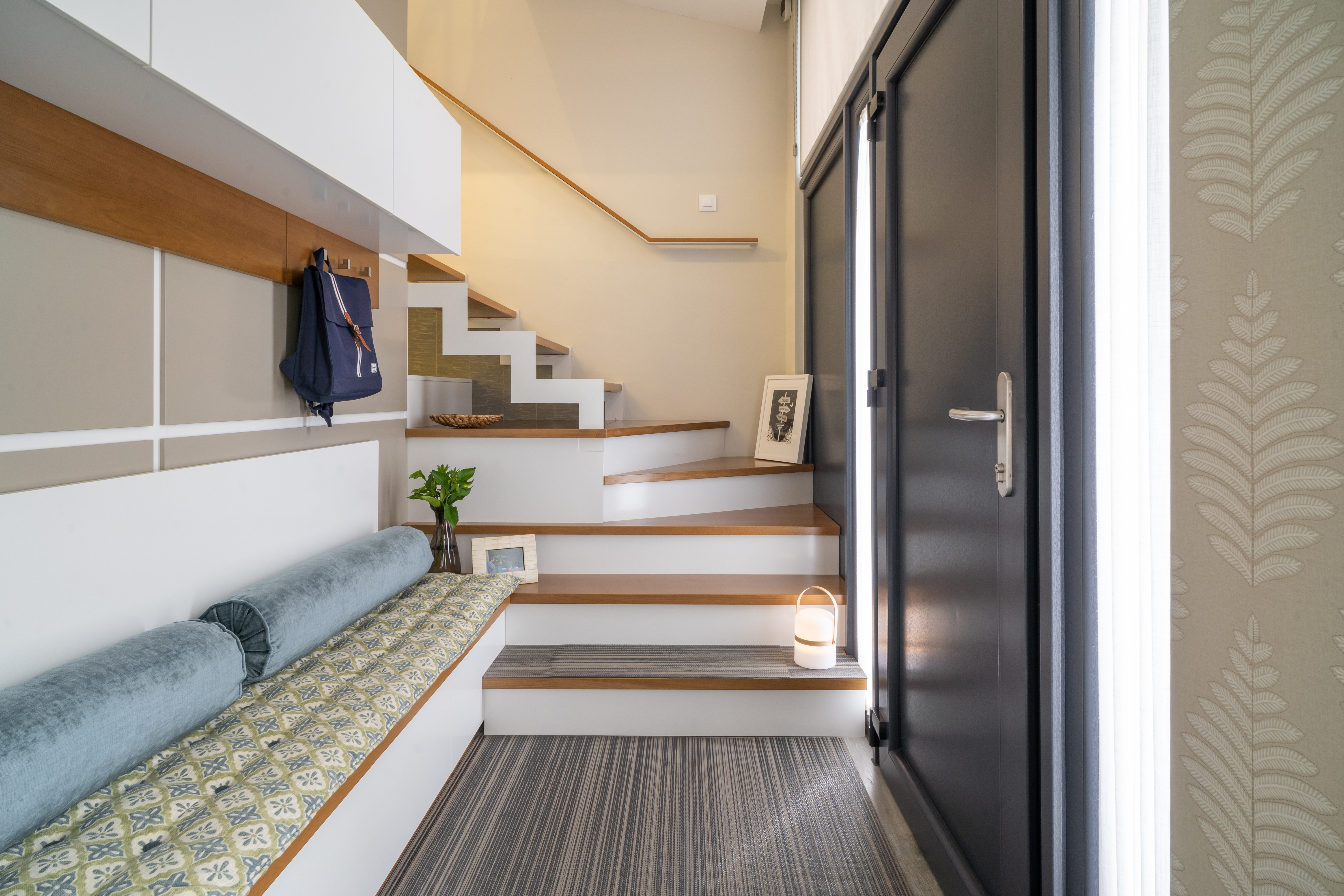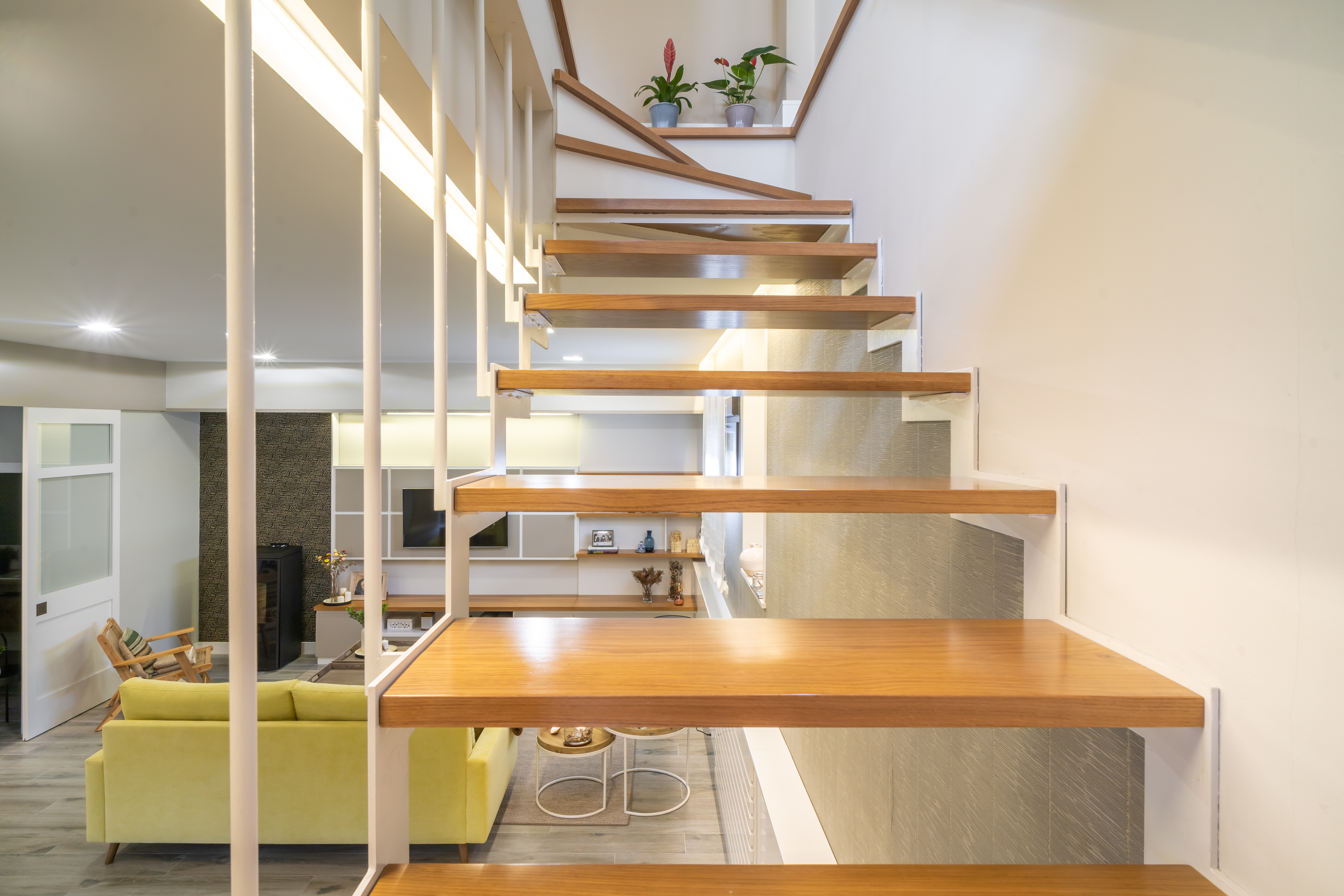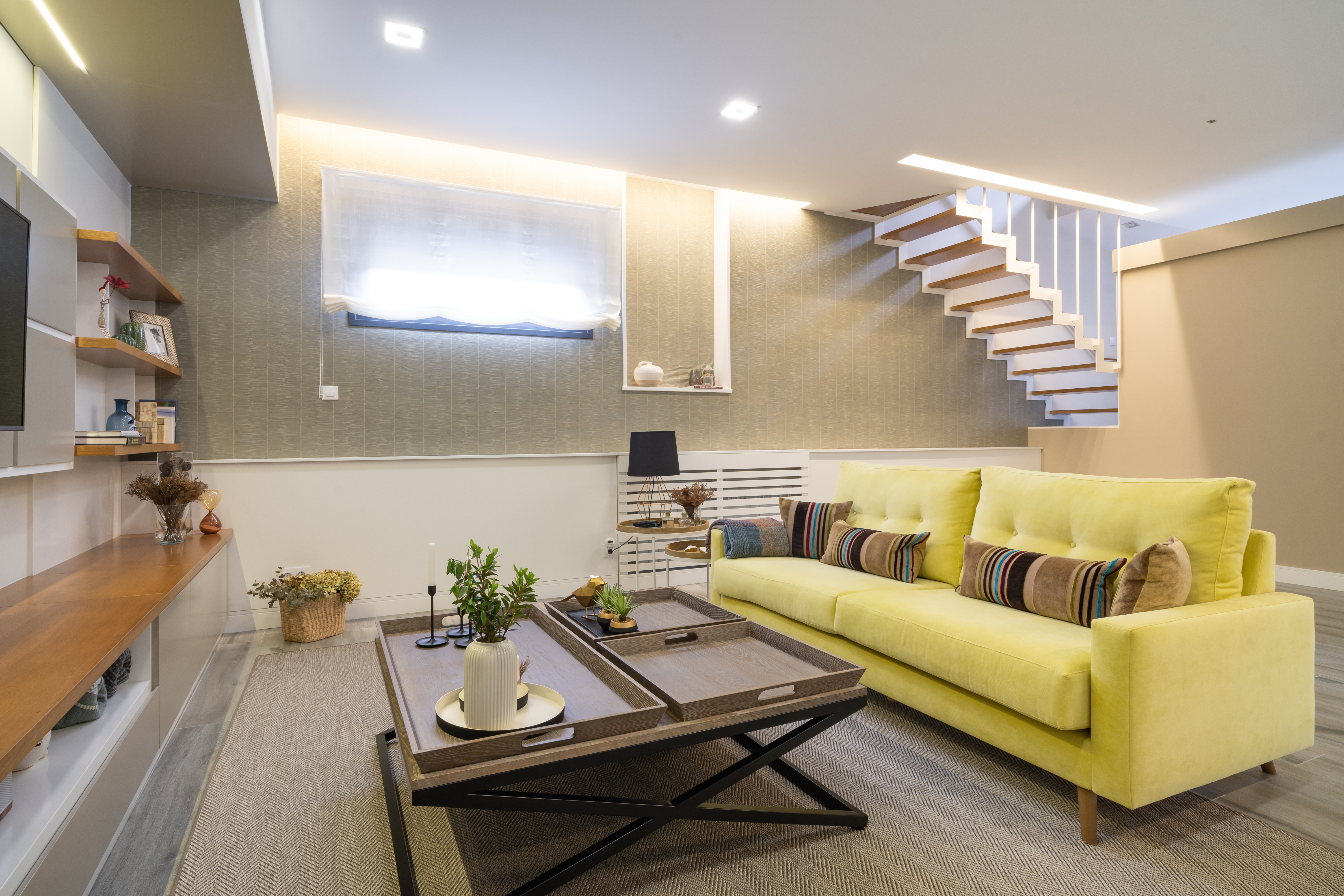 Diseño y fabricación de mobiliario a medida para zona de almacenaje, estanterías, panelado TV y zona de chimenea con revestimiento de papel pintado vinílico e hidrófugo. También proyectado de escaleras en estructura metálica y madera de nogal, zona de hall y carpintería con panelados modulares y puertas correderas que dan continuidad a los diferentes espacios..
