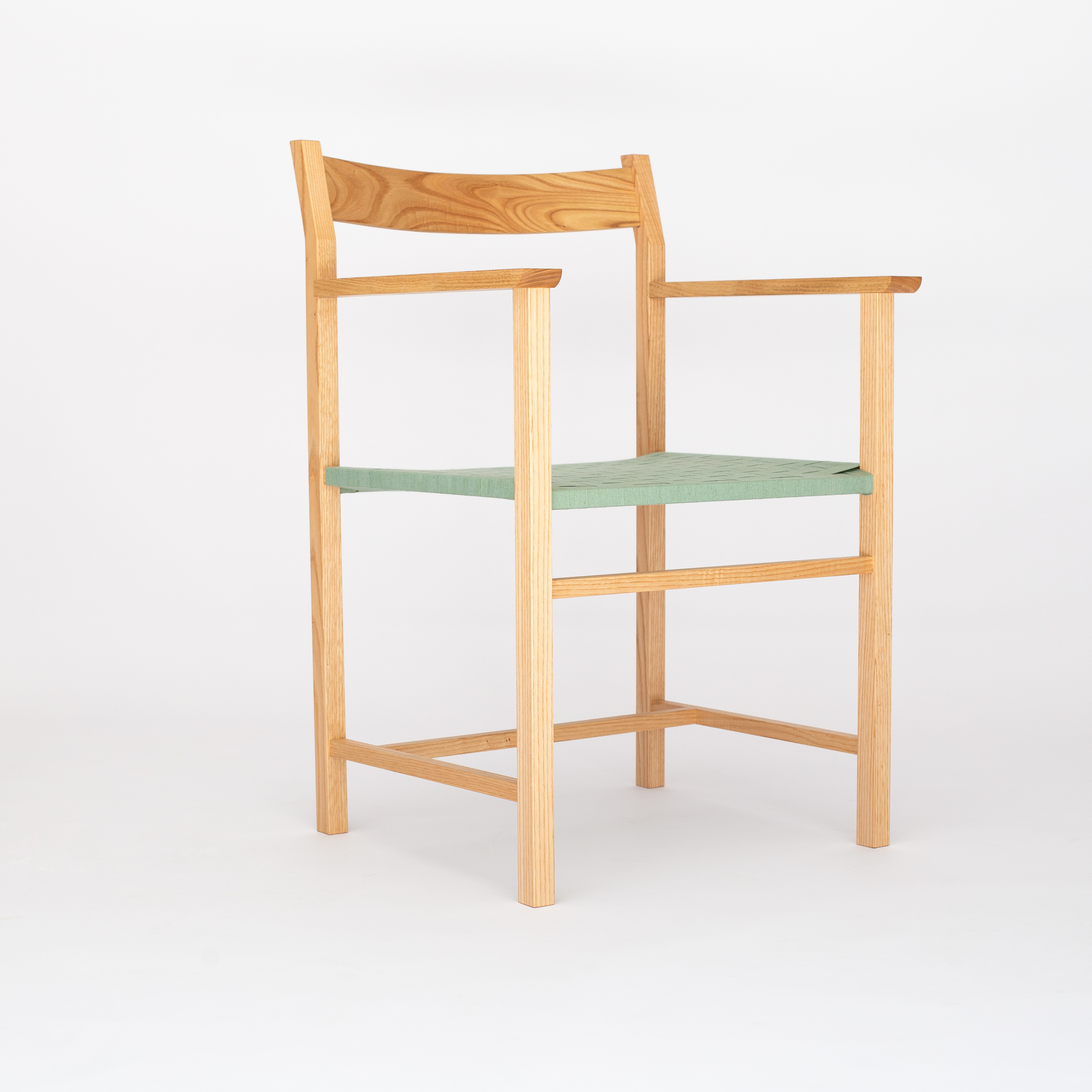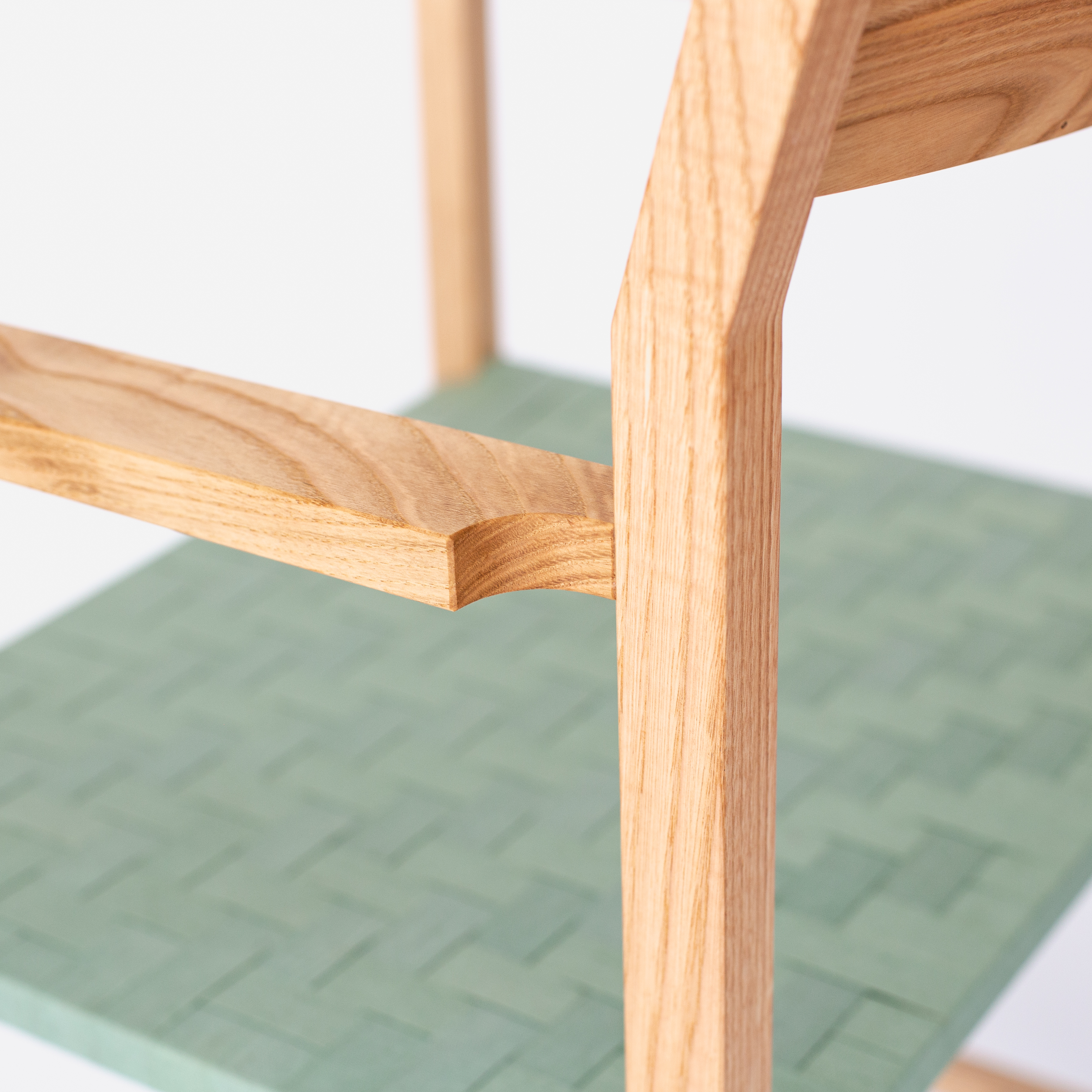 Una silla esencial realizada en castaño natural con asiento en verde.
