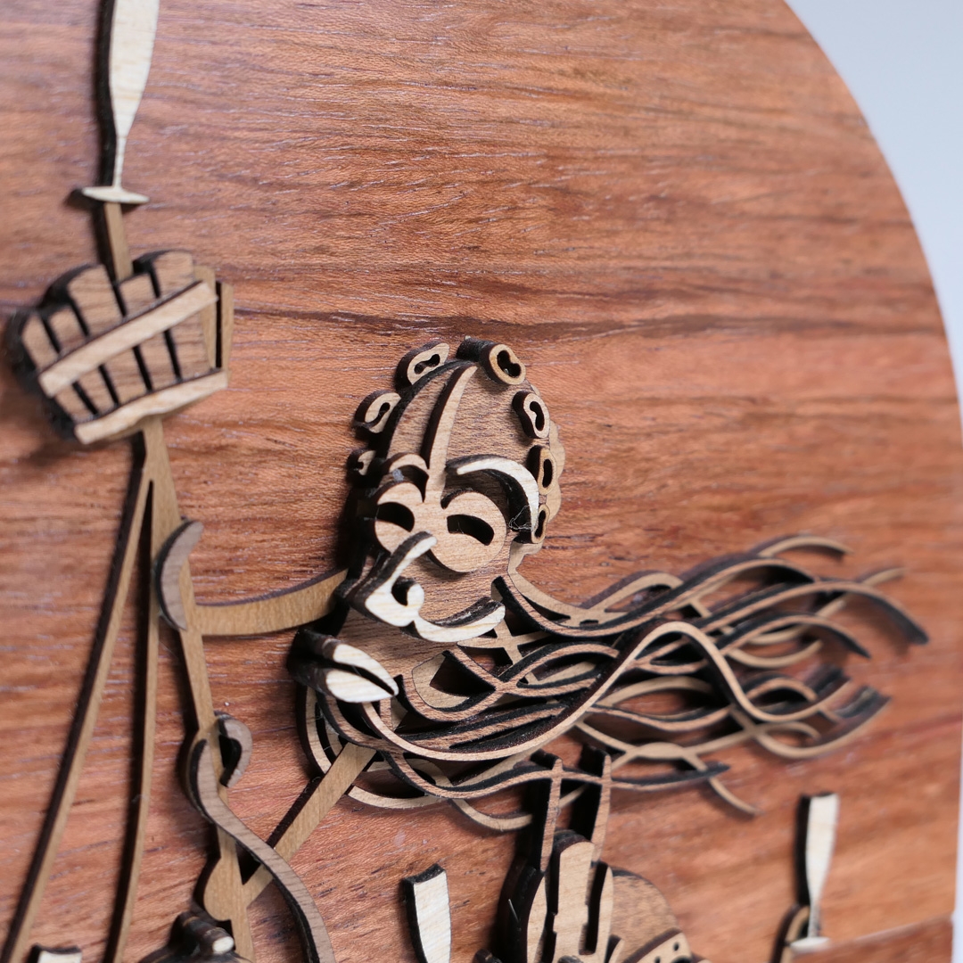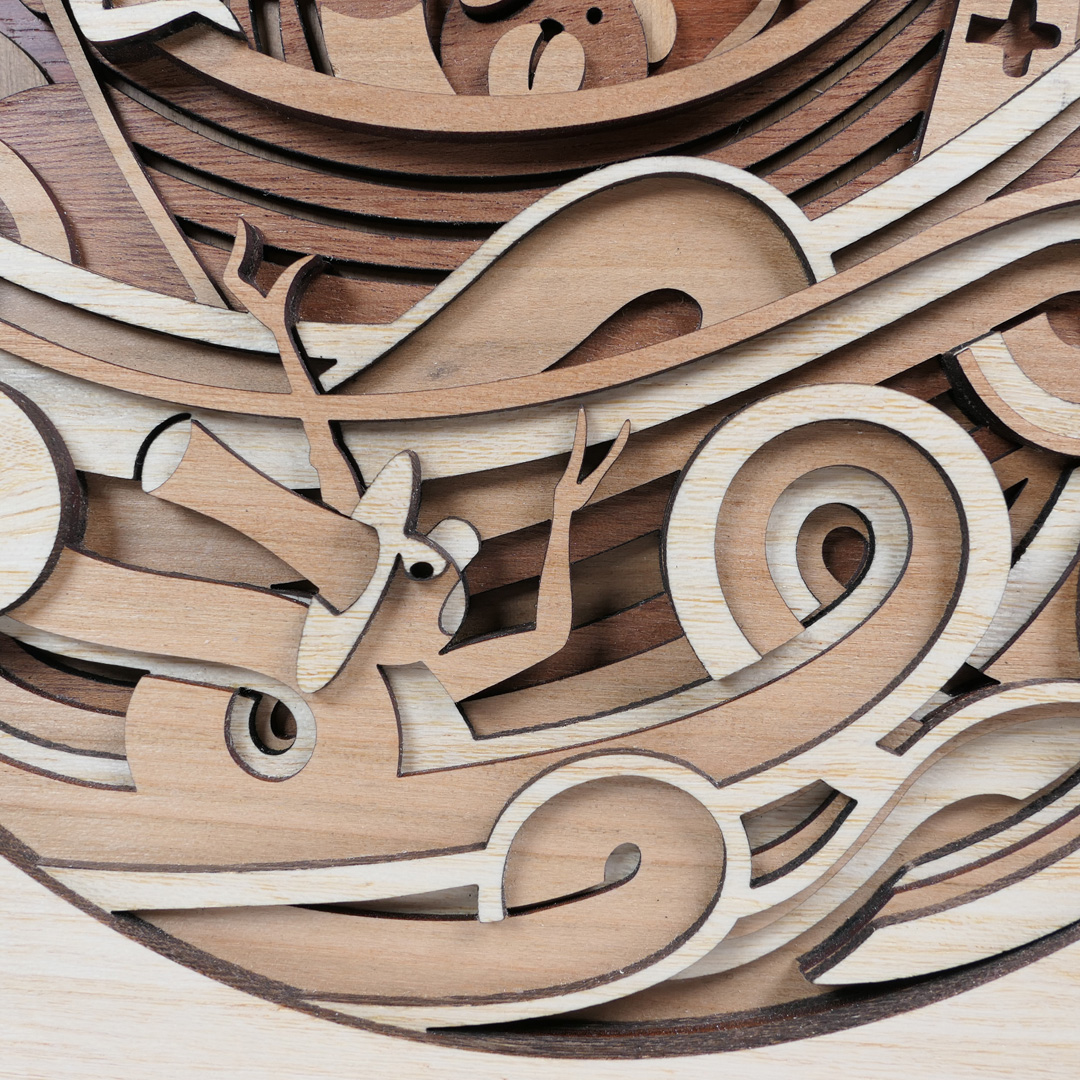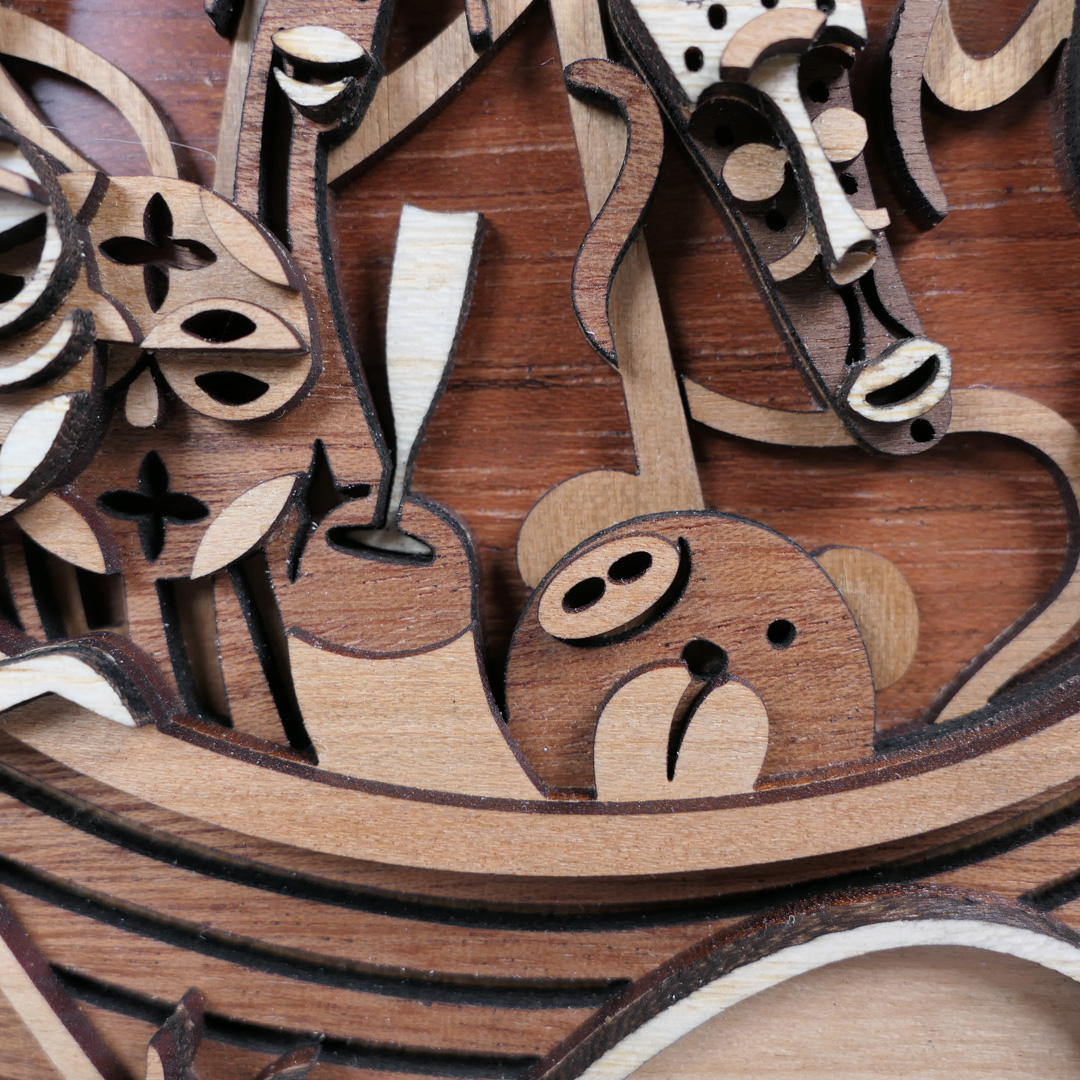 Año: 2021 Pieza nº 02 de este diseño. Tamaño total: 49,8 x 19,1 x 2,8 cm. Peso: 529,6 gramos. Maderas macizas de 2 mm. de ramín, cerezo, mansonia (nogal africano), jatoba y caoba. Chapa de caoba pommele en la parte trasera y acabados laterales con pintura a la tiza sobre la tabla de contrachapado que se usa como soporte estructural.