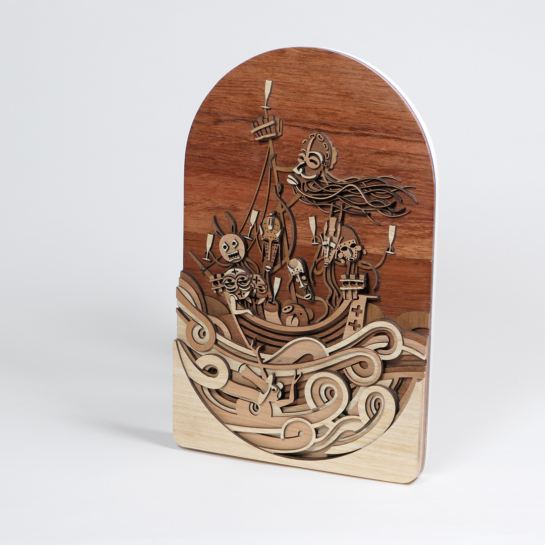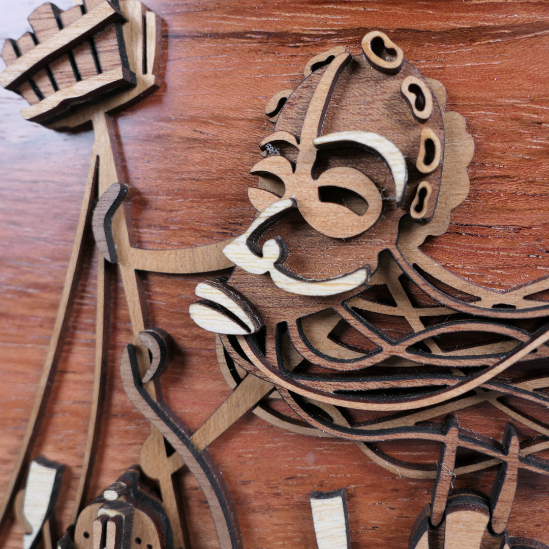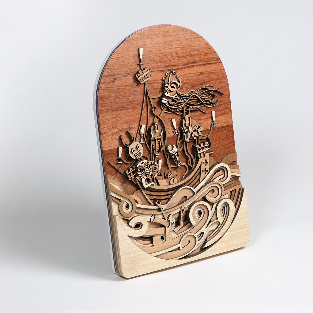 Año: 2021 Pieza nº 02 de este diseño. Tamaño total: 49,8 x 19,1 x 2,8 cm. Peso: 529,6 gramos. Maderas macizas de 2 mm. de ramín, cerezo, mansonia (nogal africano), jatoba y caoba. Chapa de caoba pommele en la parte trasera y acabados laterales con pintura a la tiza sobre la tabla de contrachapado que se usa como soporte estructural.
