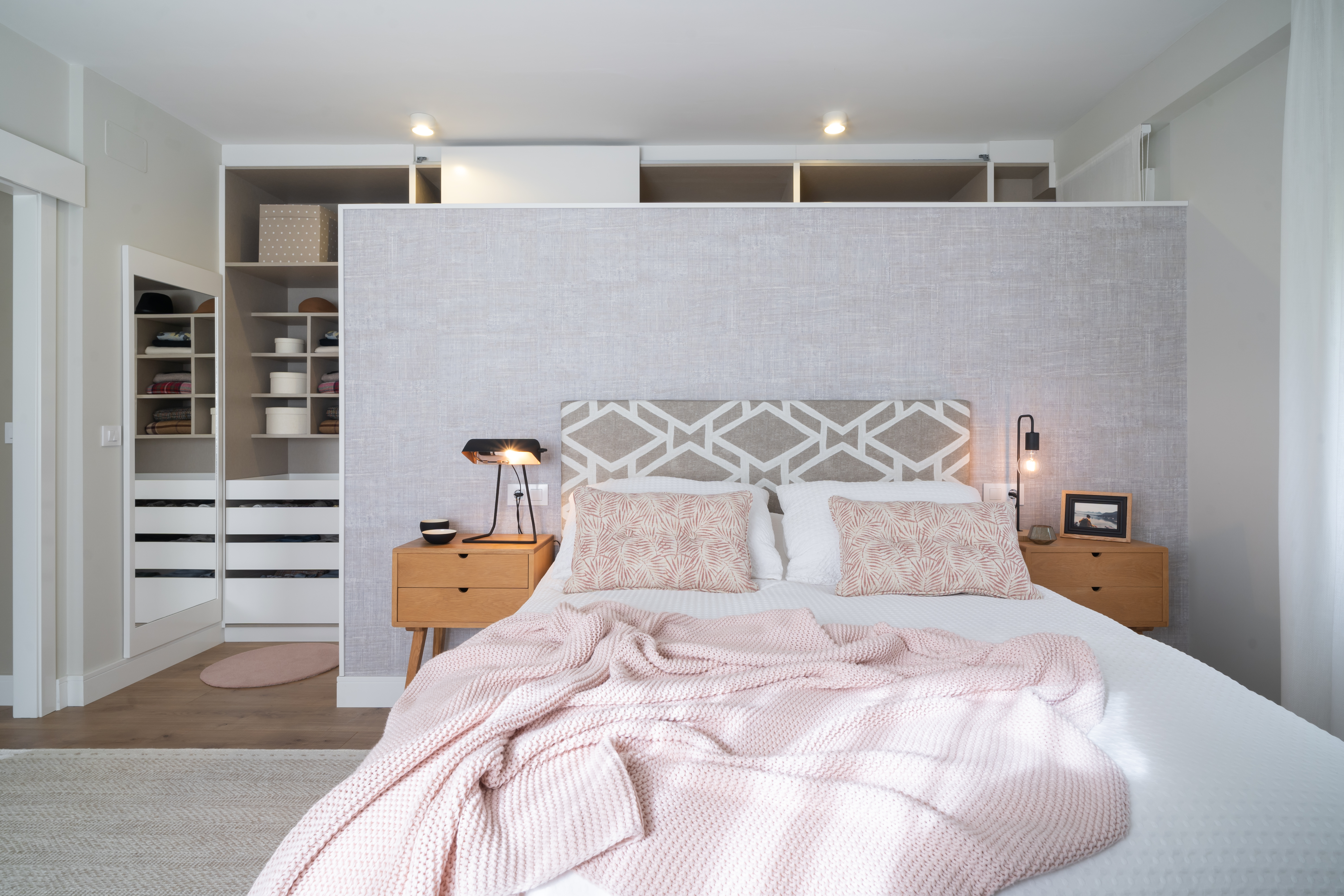 Diseño a medida de vestidor integrado en un dormitorio principal.