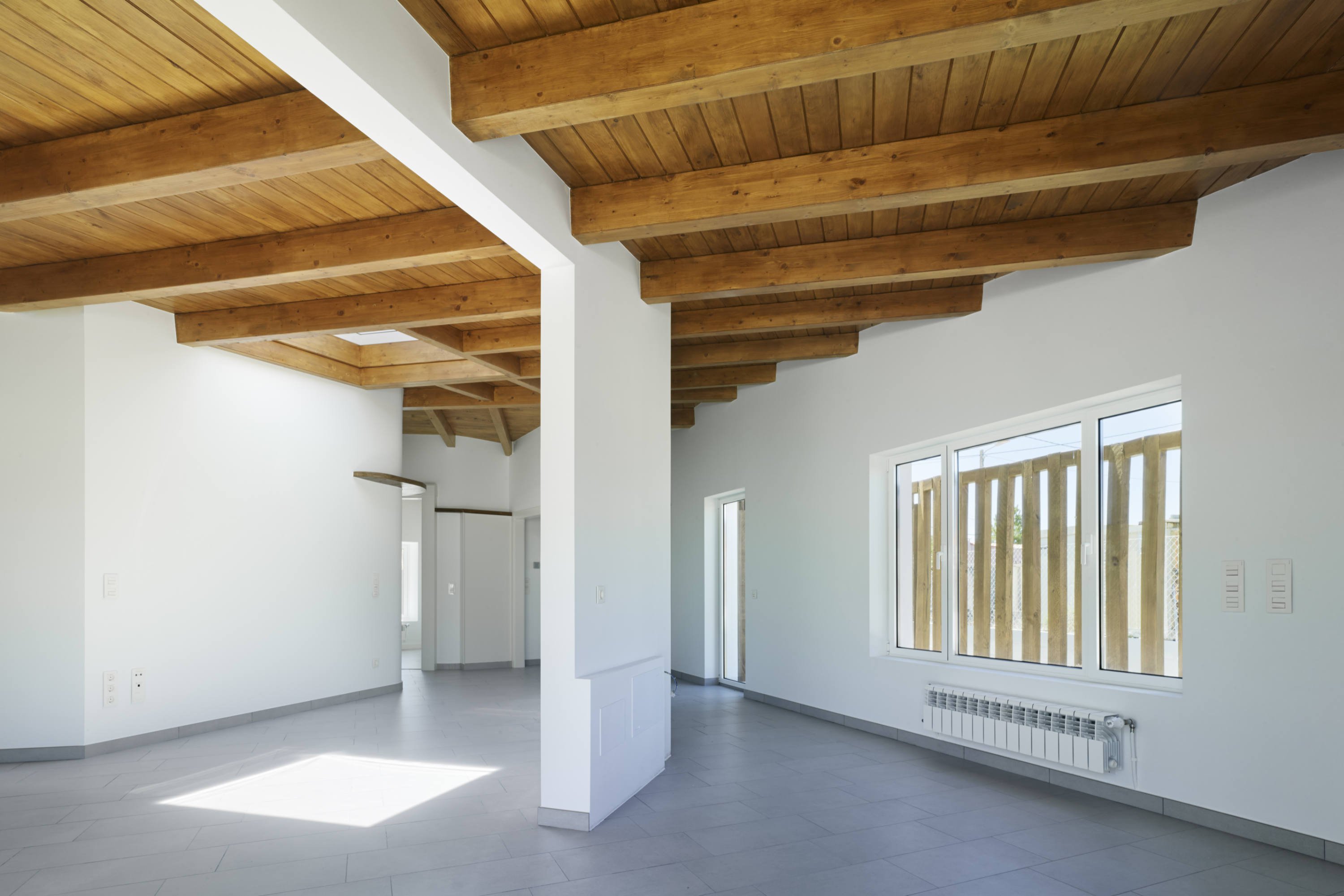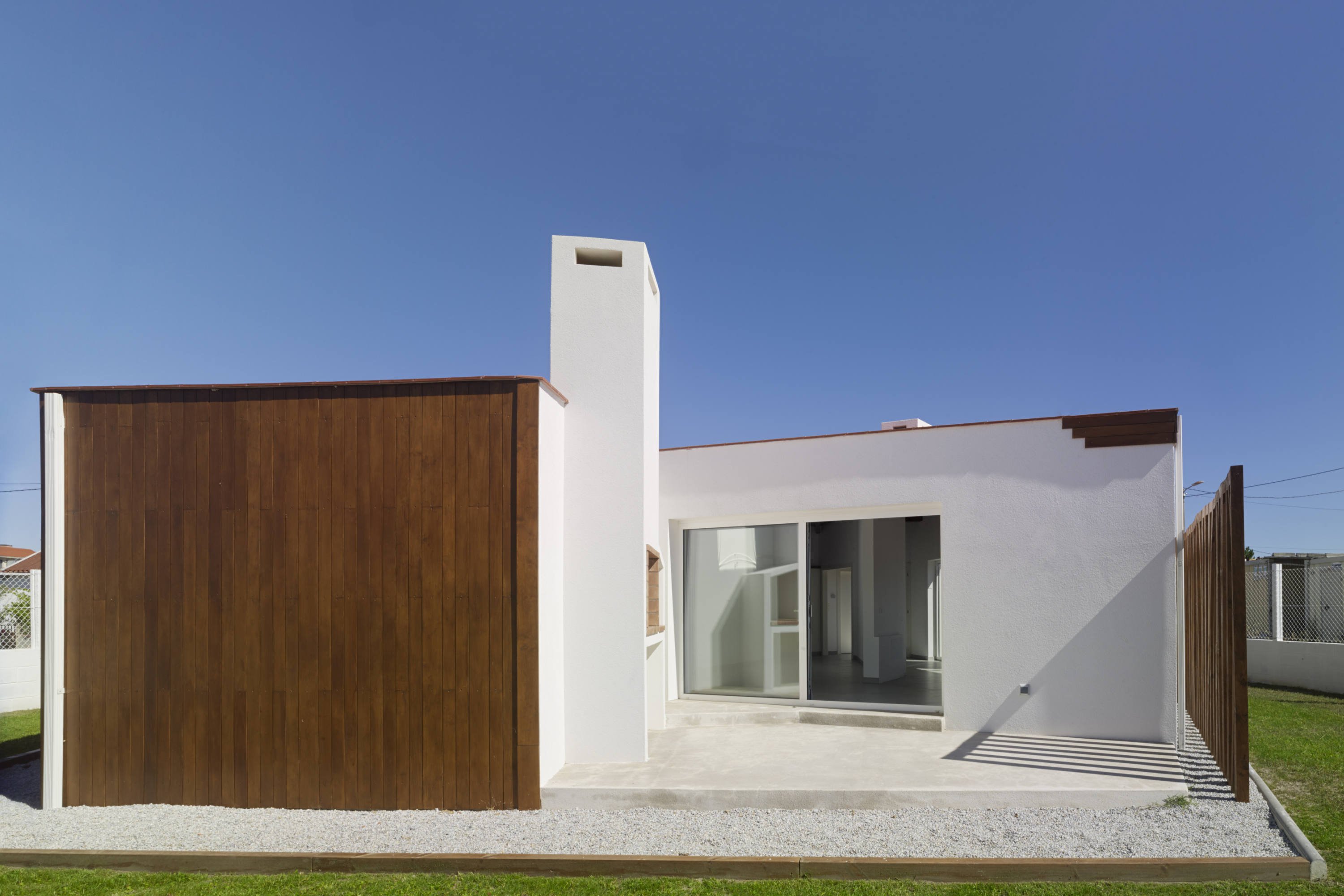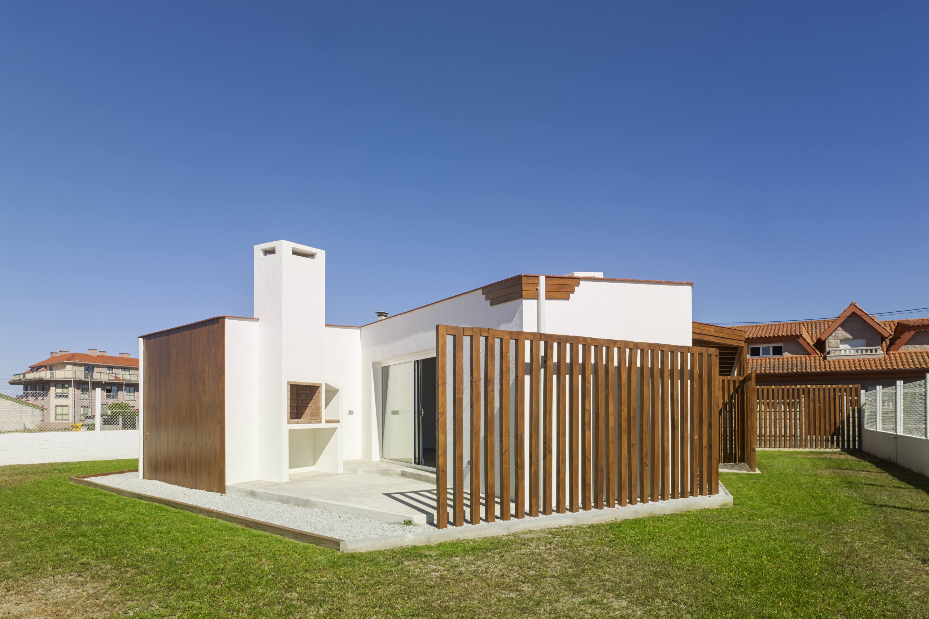 Una vivienda unifamiliar ubicada en una parcela pequeña en un entorno edificado con viviendas de pequeña y mediana escala, en la periferia de Aguiño en Ribeira (A Coruña). Se opta por compactar la construcción en una única planta, minimizando el espacio destinado a las circulaciones. Desde el exterior se percibe la casa con un muro ciego de madera, con una cubierta, a dos aguas, con poca pendiente, que tiende a desaparecer. Se orienta norte-sur para coger la máxima radiación solar, ubicando ventanas y lucernarios de tal forma que se garantice una eficaz ventilación cruzada. Para la entrada peatonal se crea un alero de metro y medio que da sombra en verano y permite captación solar en invierno. Destaca la presencia de la fachada ventilada de madera de pino, tratada con un lasur oscuro.