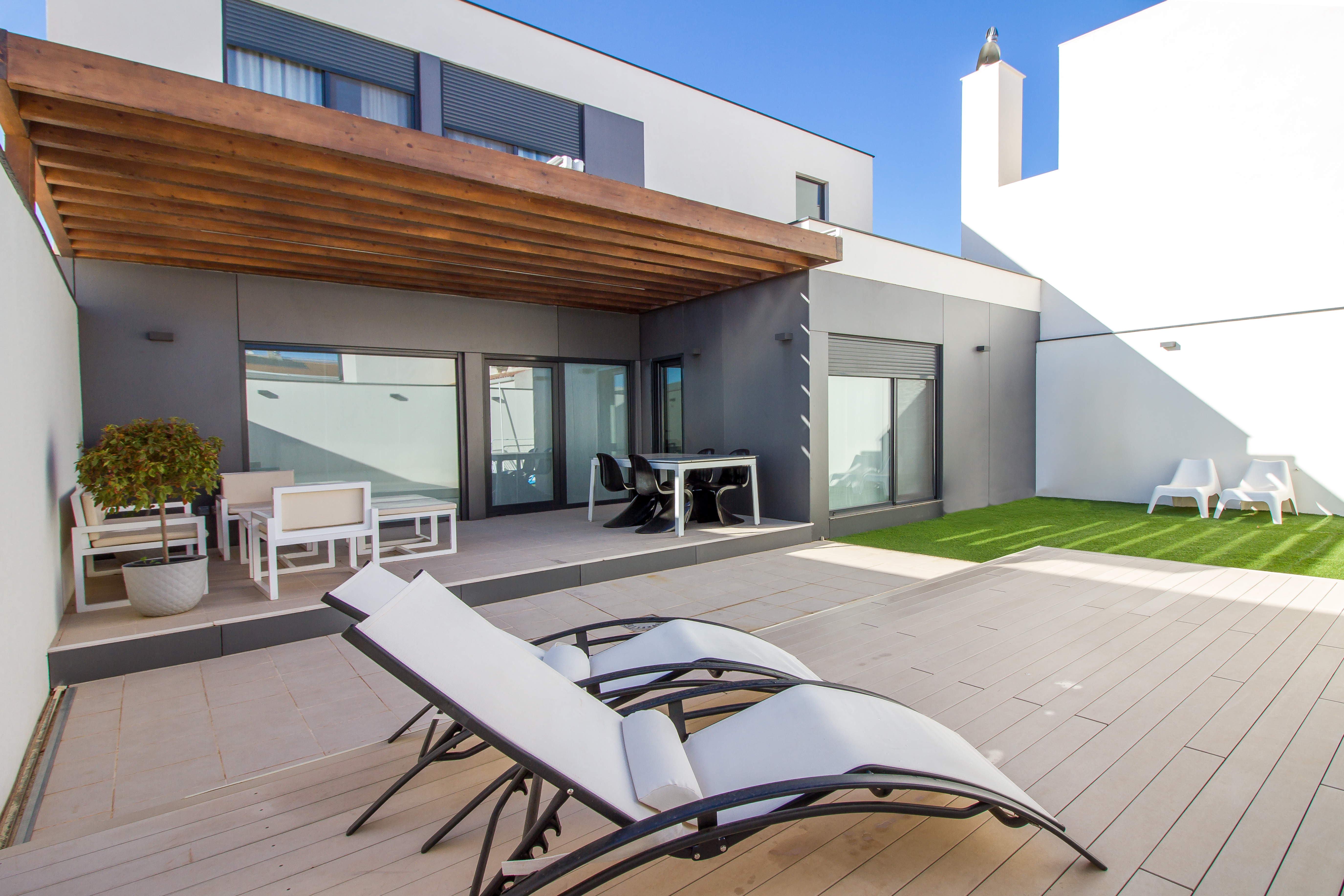 Vivienda Unifamiliar Aislada, de entramado ligero de madera ejecutada in situ. Acabado monocapa en dos colores, aplacados discontinuos cerámicos y madera.
